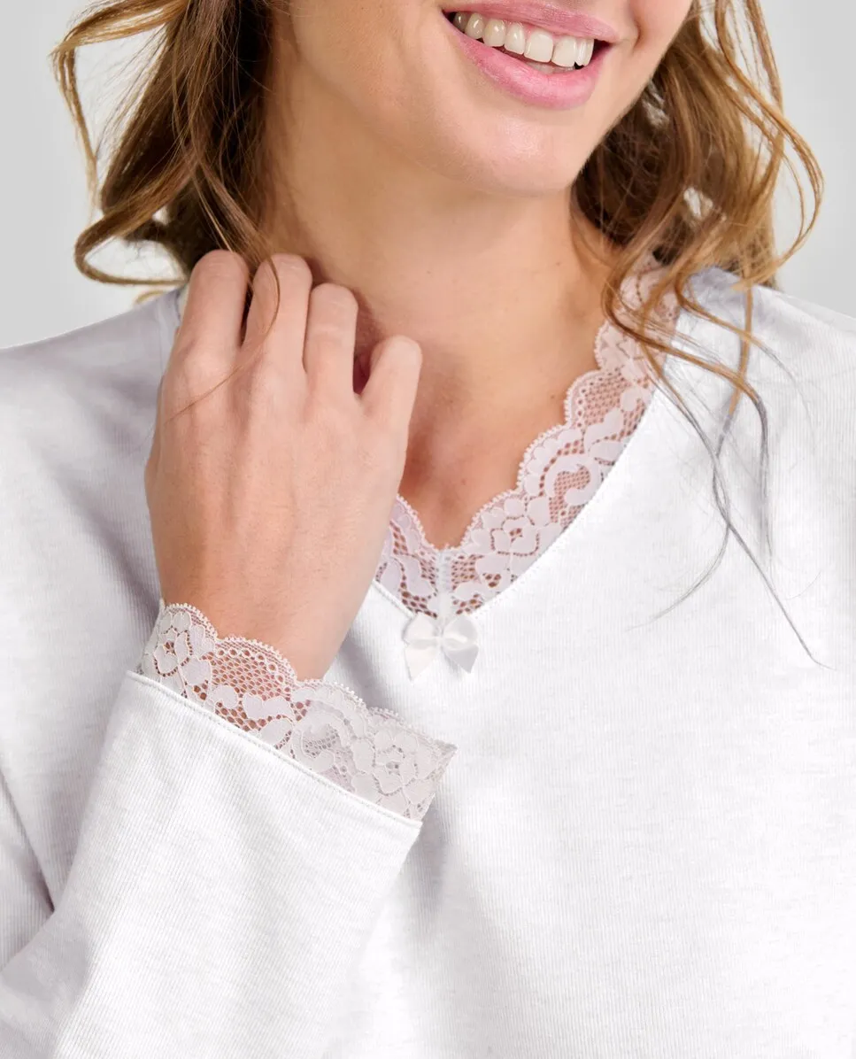 Женская ночная рубашка Lohe с кружевом, V-образным вырезом и классическим длинным рукавом.