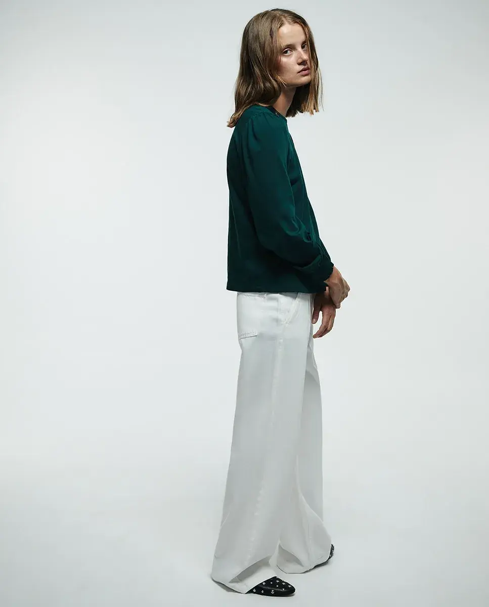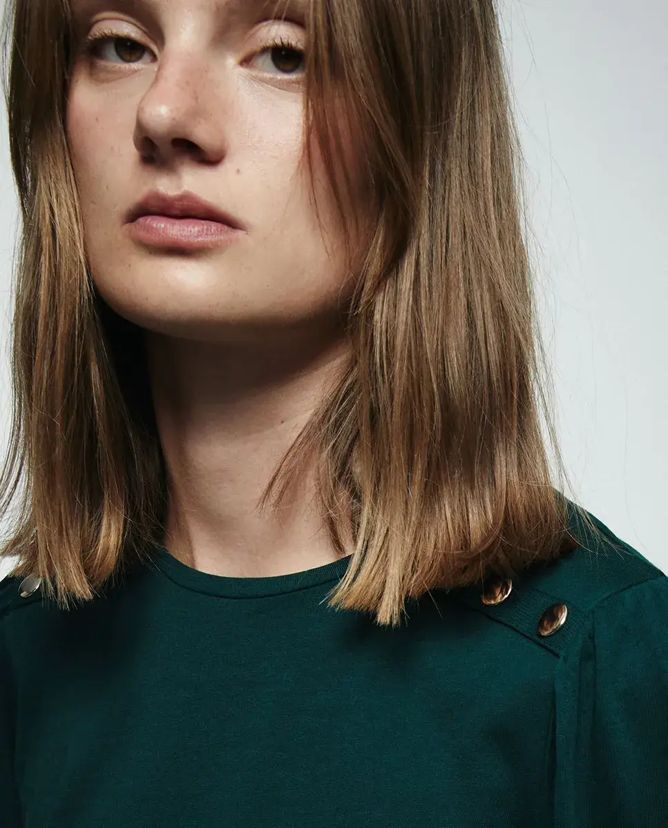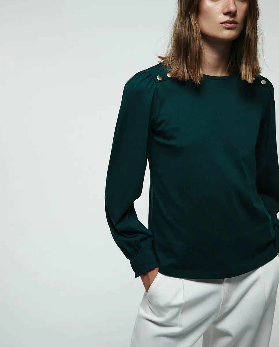 Лонгслив с круглым вырезом и длинными рукавами, с деталями пуговиц и сборками на плечах. 100% хлопок