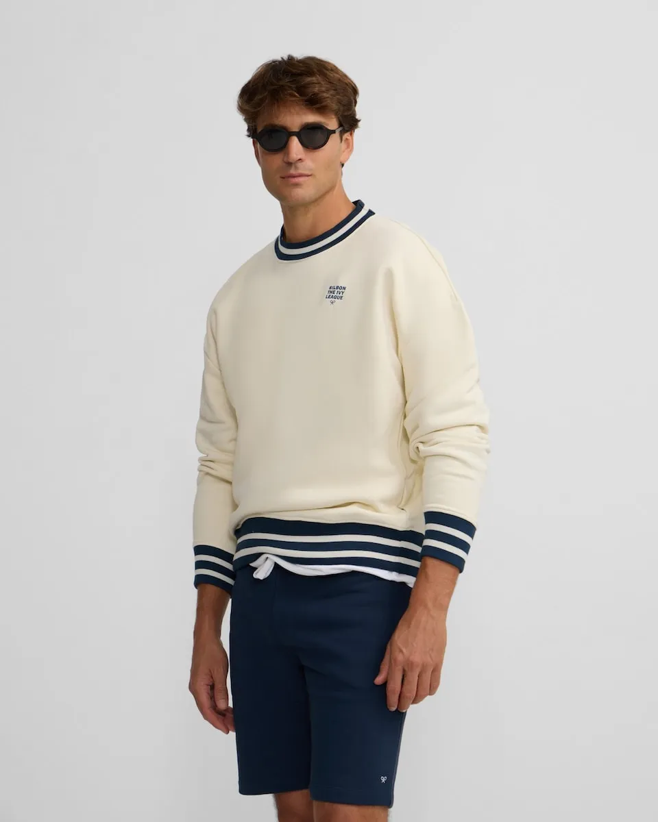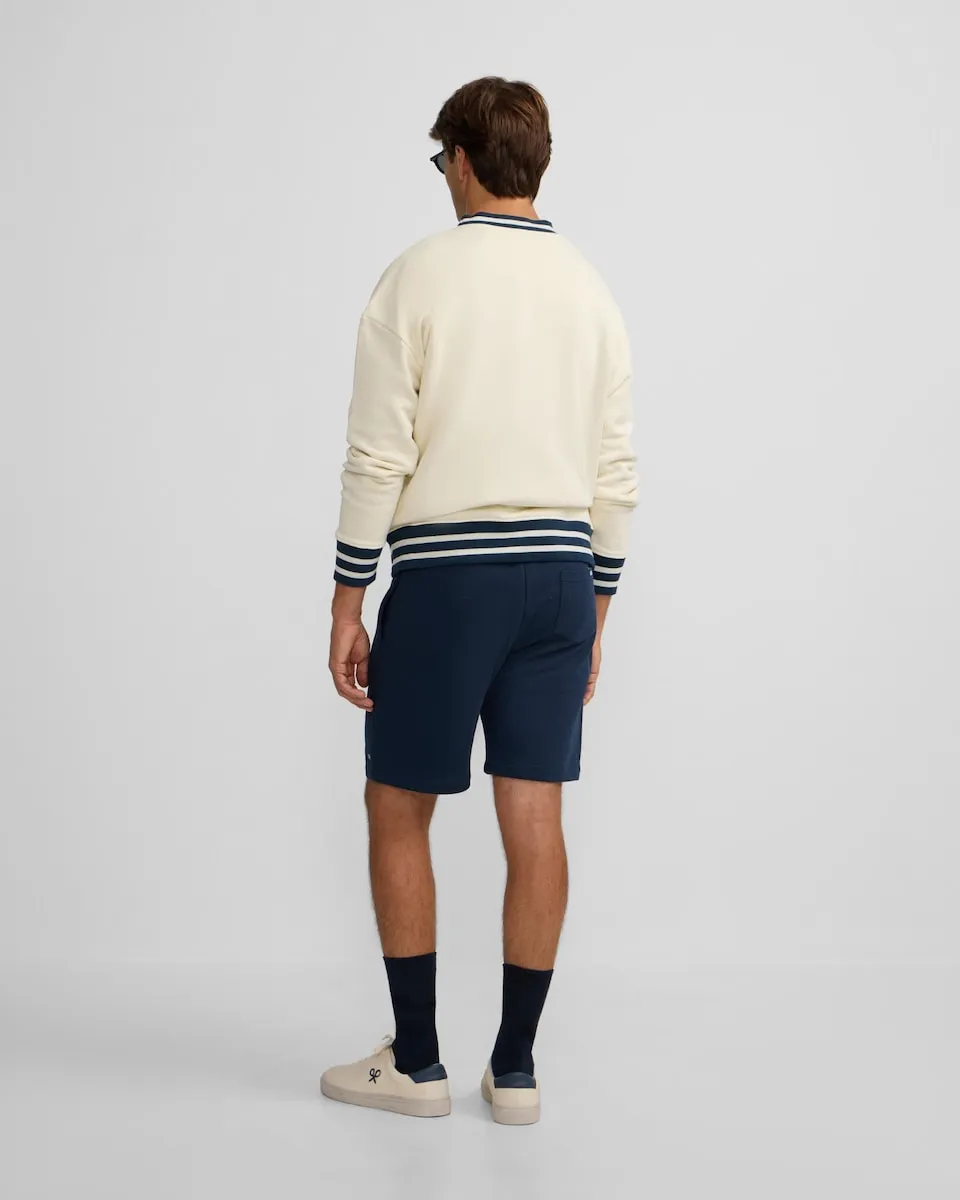 Темно-синие спортивные бермуды, изготовленные из смеси хлопка. Имеют эластичную талию с регулируемым шнурком и задние карманы. Украшены контрастной белой вышивкой на заднем кармане и в нижней передней части.