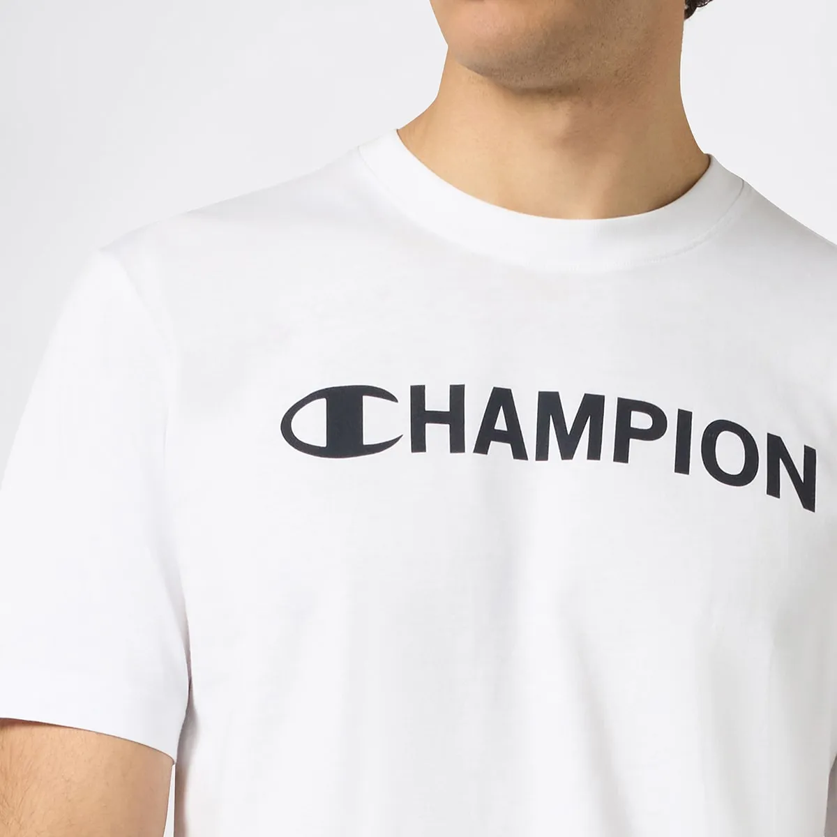 Классическая футболка из спортивной линии Champion. Короткий рукав, круглый вырез и большой печатный логотип. 100% хлопок, настоящий классический вариант, который можно сочетать с вашим зимним гардеробом.