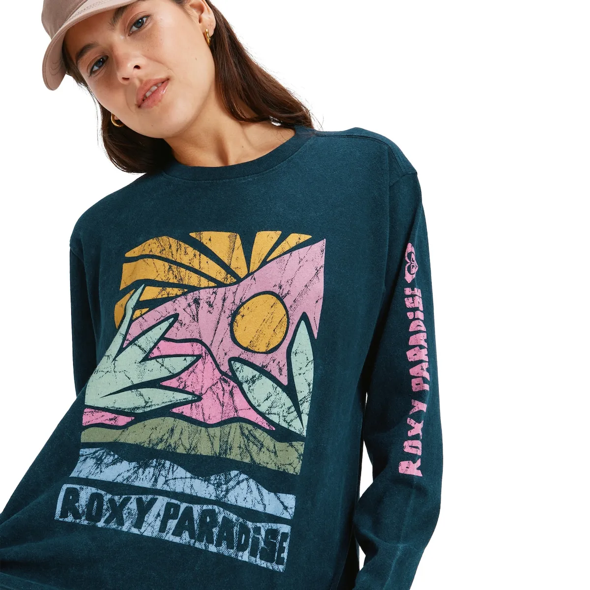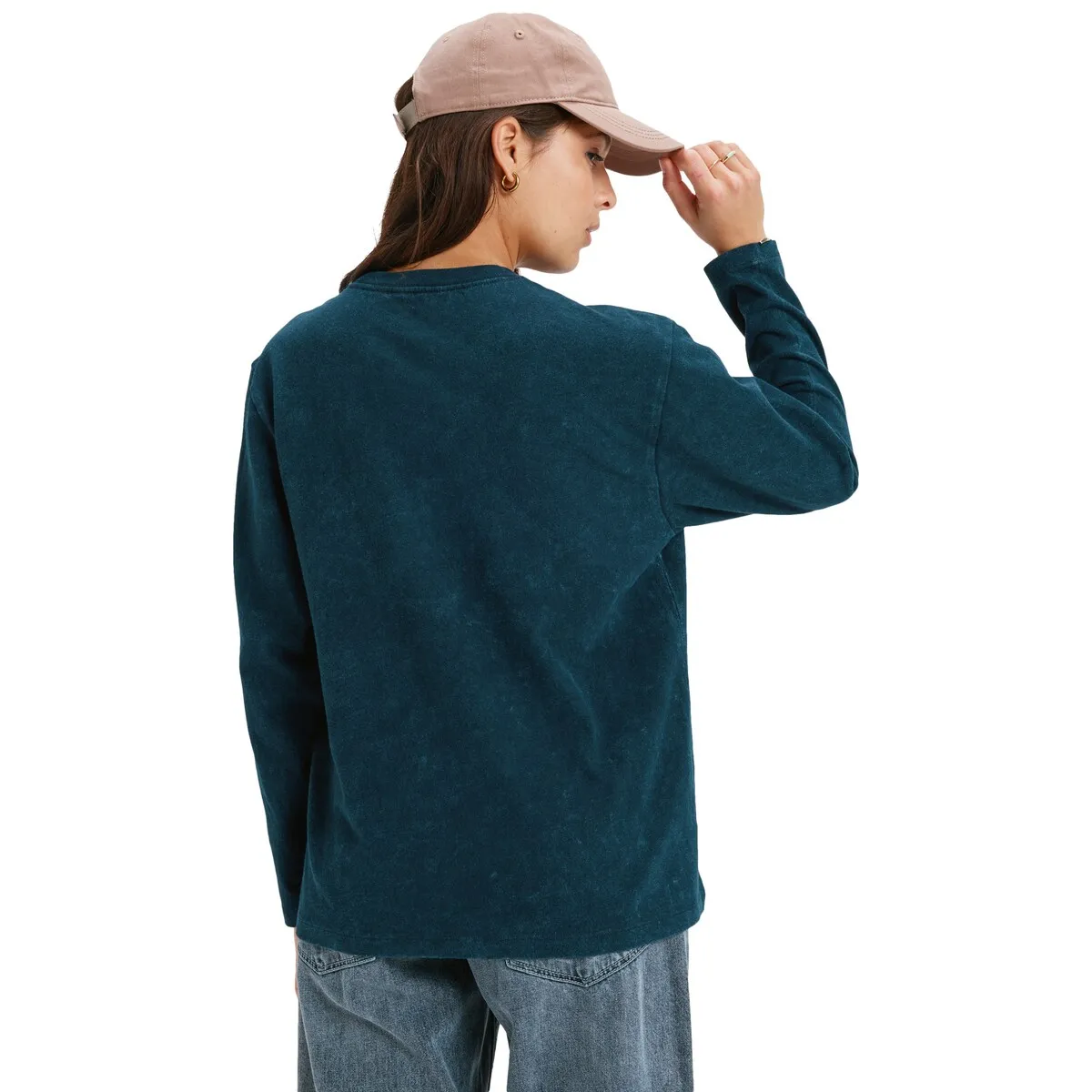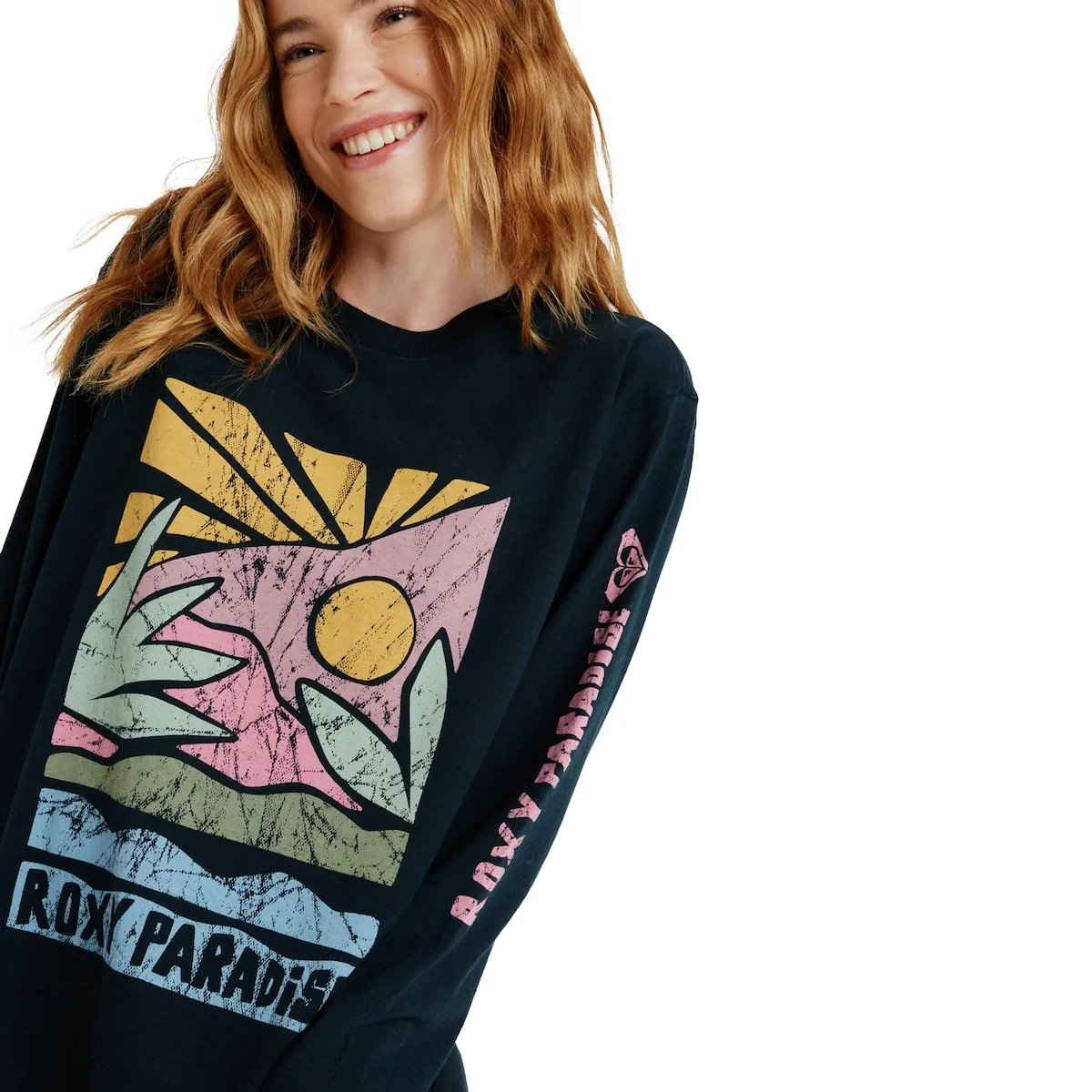 Женская футболка с длинным рукавом. Характеристики включают: Ткань: джерси из органического хлопка, Крой: свободный, Стирка: оптическая обработка, Вырез: круглый, И принт на передней части и рисунок на спине или рукавах [в зависимости от модели].