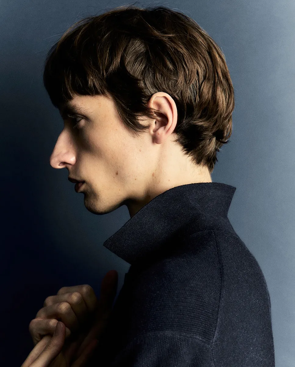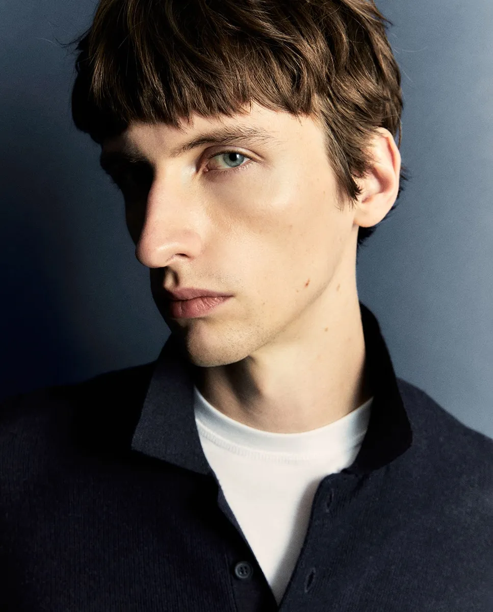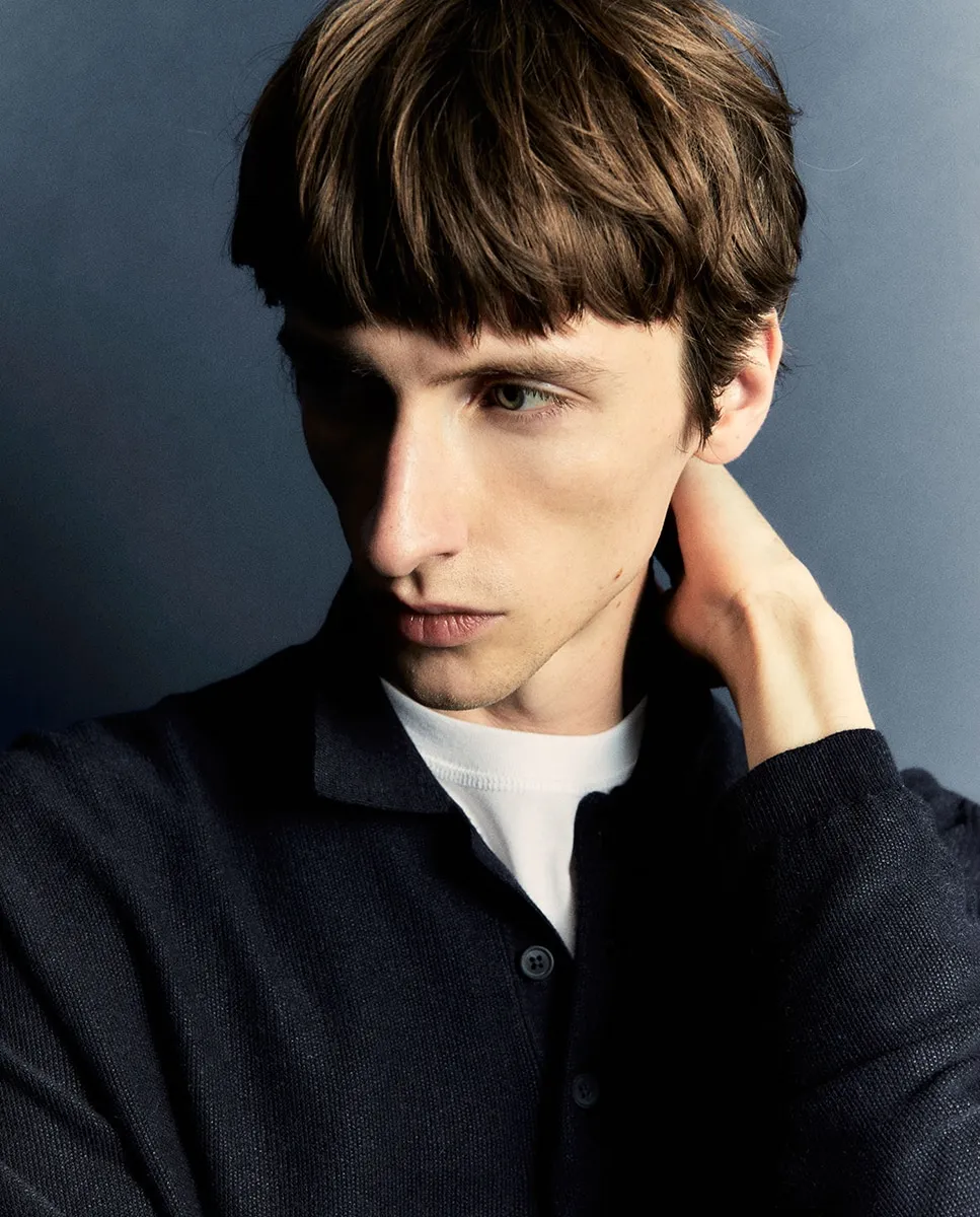Свитер с воротником поло и длинными рукавами. Застежка на пуговицы