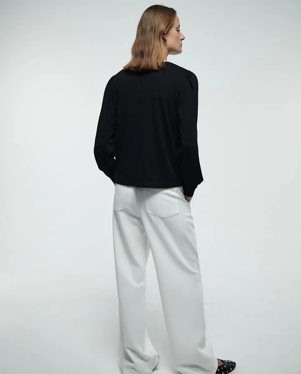 Лонгслив с круглым вырезом и длинными рукавами, с деталями пуговиц и сборками на плечах. 100% хлопок