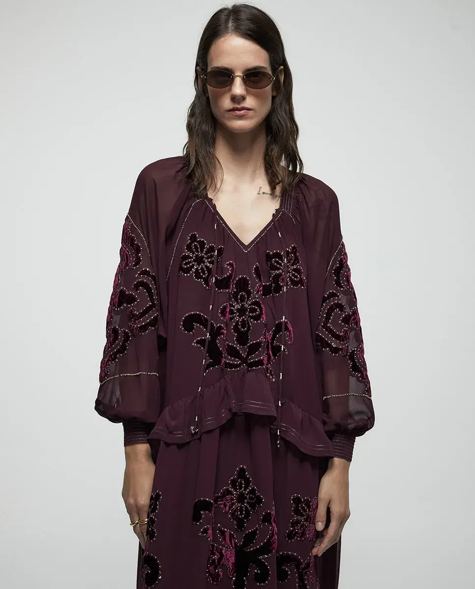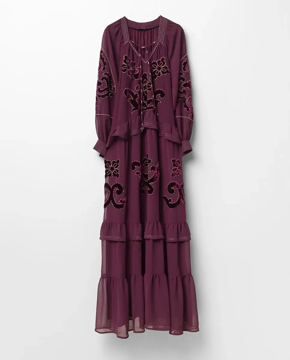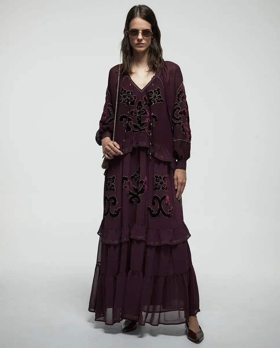 Длинное струящееся платье с бархатной вышивкой, бусинами и оборками