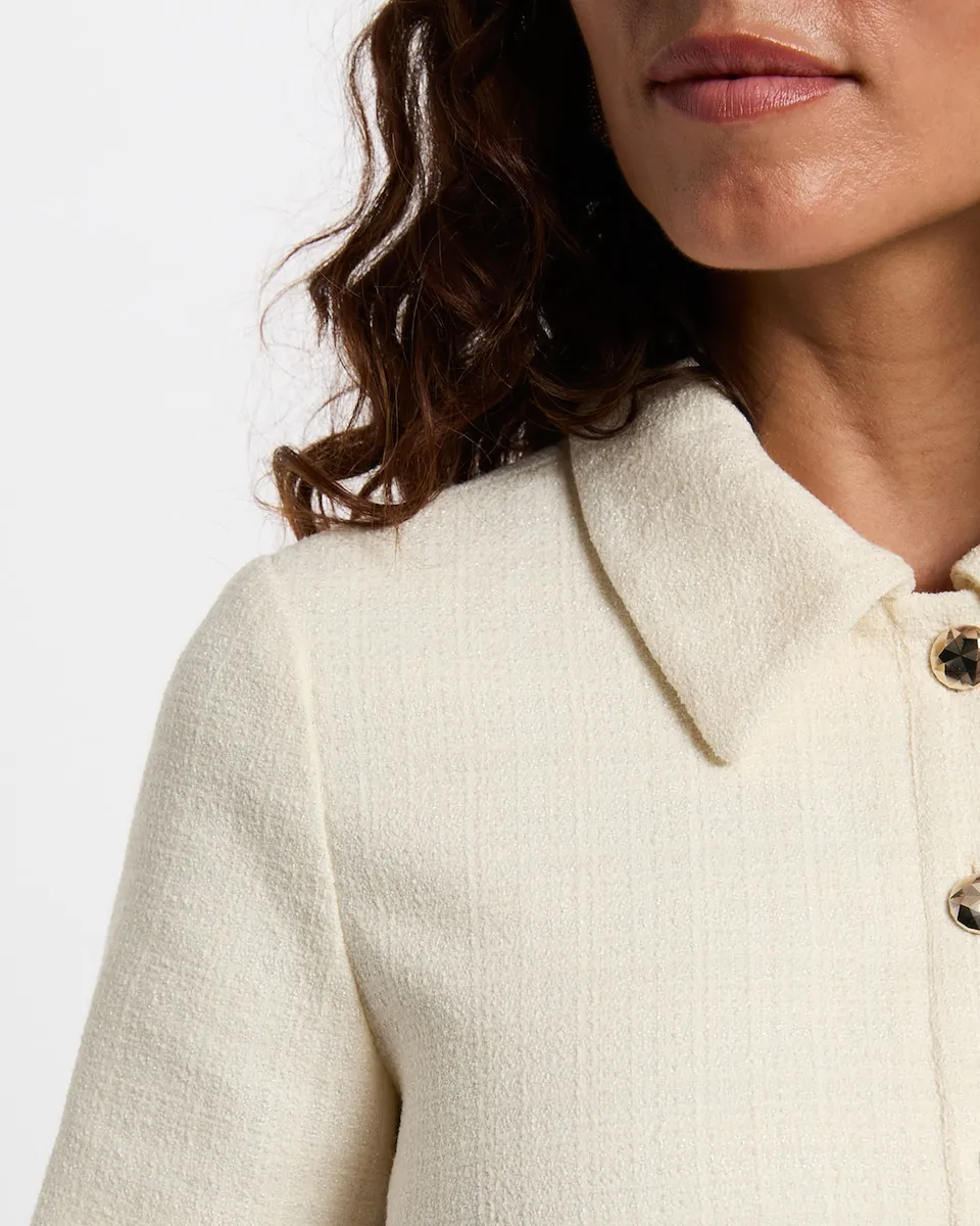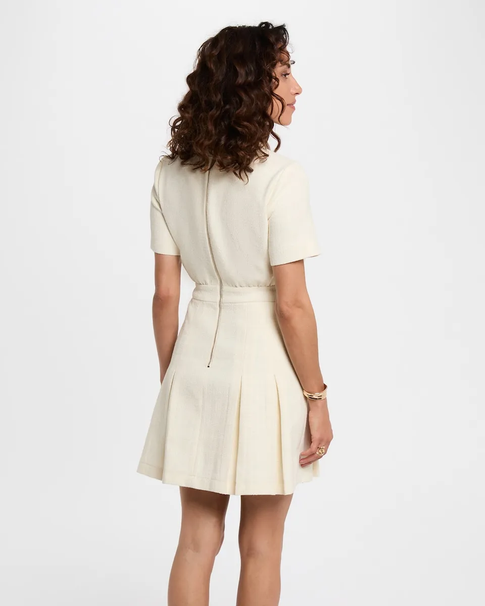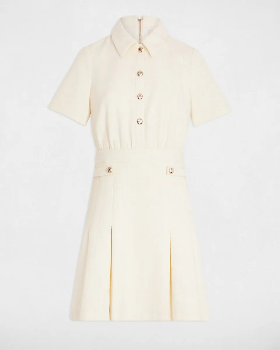 Это струящееся твидовое платье воплощает в себе вечную элегантность. Его расклешенный крой нежно подчеркивает верхнюю часть тела, а воротник с лацканами придает силуэту современный вид. Изящные пуговицы и плиссированные детали добавляют этой длиной до колена модели непреодолимо женственный штрих. - Струящееся. - Твид. - Расклешенный крой. - Воротник с лацканами. - Короткие рукава. - Пуговицы. - Плиссировка. - Длина до колена. Идеи для образа. - Струящееся твидовое платье сочетается с элегантными балетками и нежным браслетом для женственного и утонченного стиля. - Модель расклешенного кроя дополняется структурированным тренчем, ботильонами на каблуке и сумочкой в руках для смелого и уверенного образа. Советы по уходу. Стирать платье при 30°C в ультраделикатном режиме для защиты волокон ткани. Глажка возможна: используйте низкую температуру (максимум 110°) и без пара, так как применение пара крайне не рекомендуется. Избегайте использования сушилки, так как это также крайне нежелательно. не рекомендуется для сохранения качества шерсти.