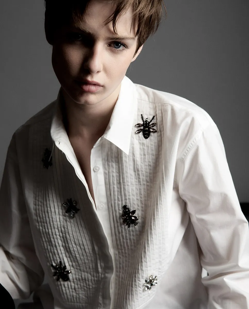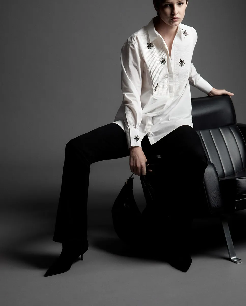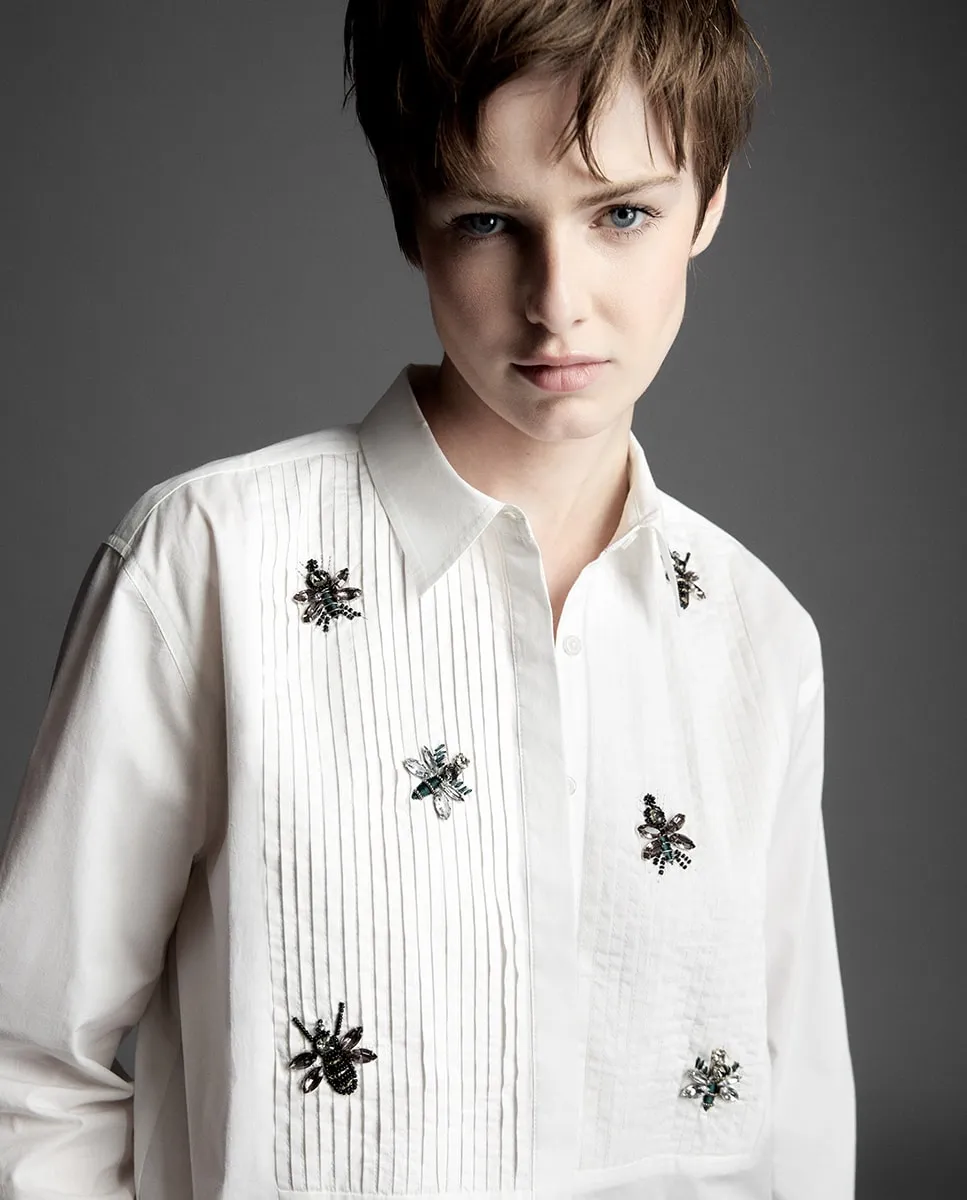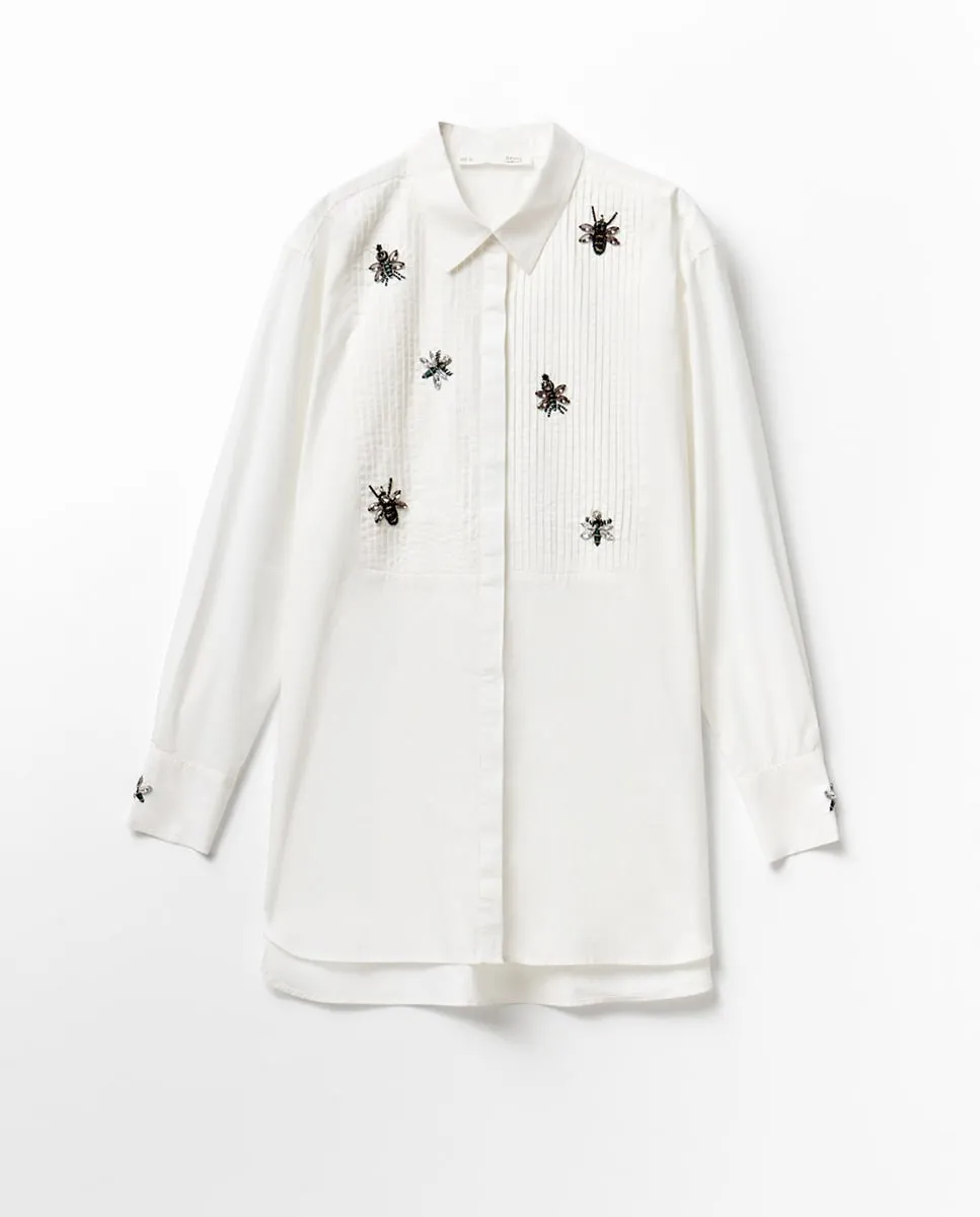 Блузка из поплина с длинными рукавами, украшенная рюшами на груди и аппликациями насекомых. 100% хлопок