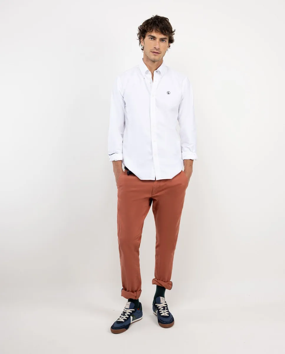 Мужская рубашка Oxford с однотонной тканью, состоящей из 93% хлопка и 7% переработанного хлопка. Прямой крой Regular Fit, воротник с пуговицами и застежка на пуговицы. Длинные рукава с простыми манжетами и вышитый логотип на груди. Внутренняя отделка с контрастной тесьмой.