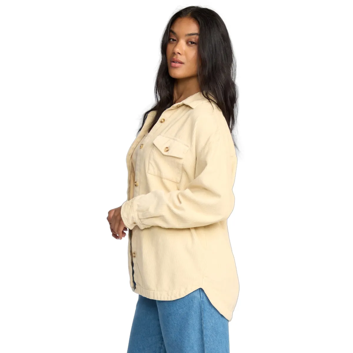 Легкая куртка-рубашка для женщин. Характеристики включают: ткань: хлопковый вельвет, свободный крой, длинные рукава, застежка на пуговицы, накладные карманы спереди и металлическая пластина.