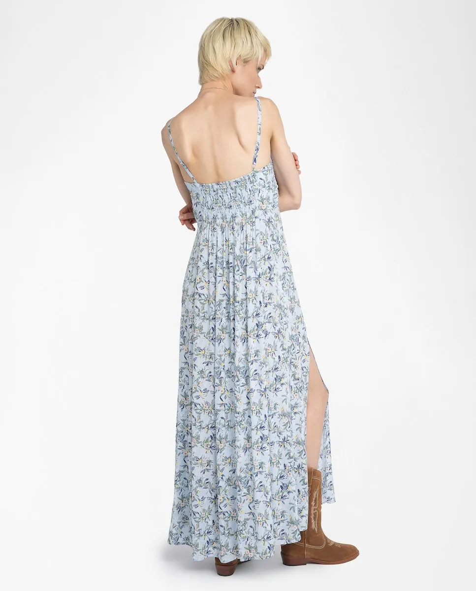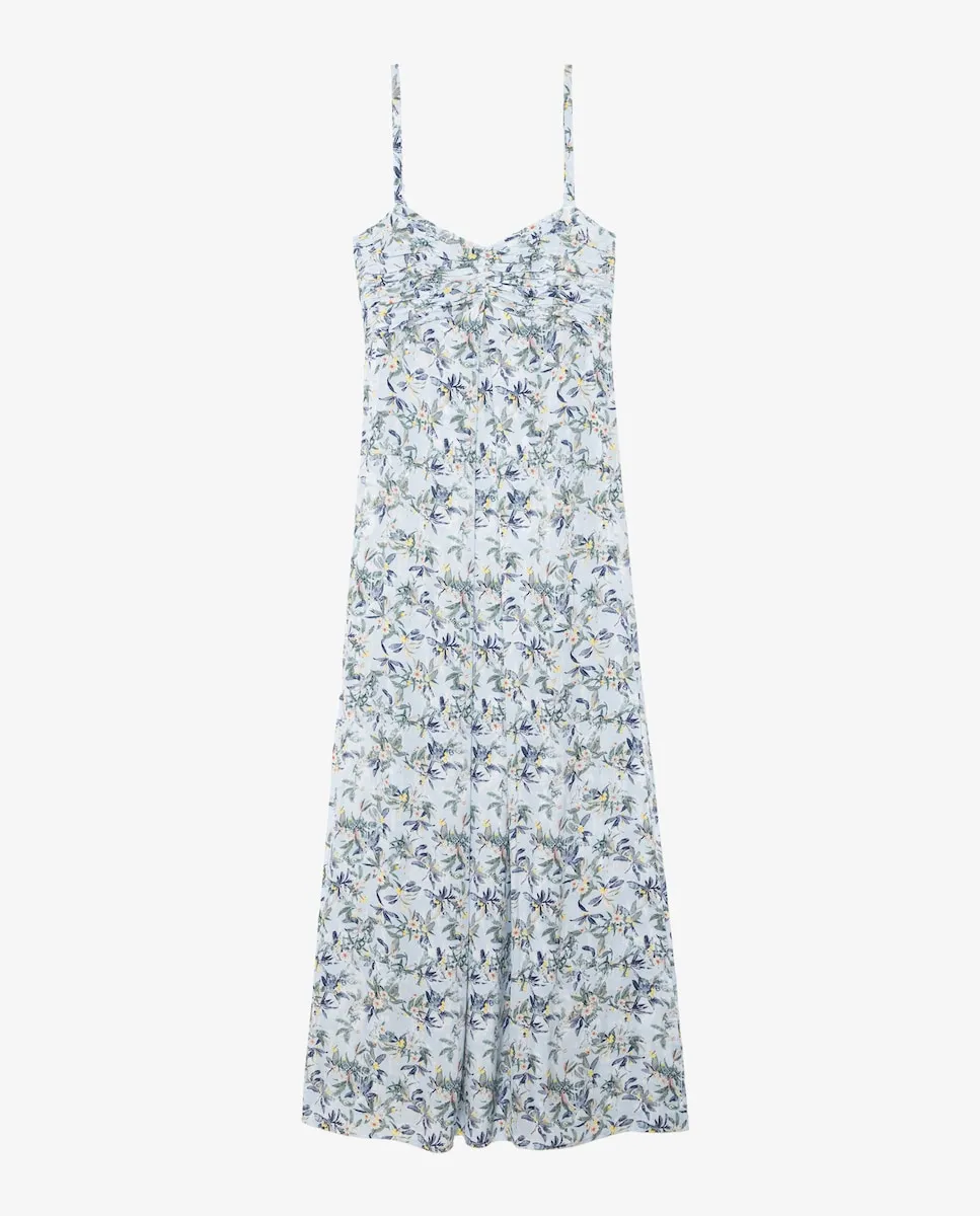 Длинное платье из принтованной вискозы, с регулируемыми бретелями и плиссированным корсетом.