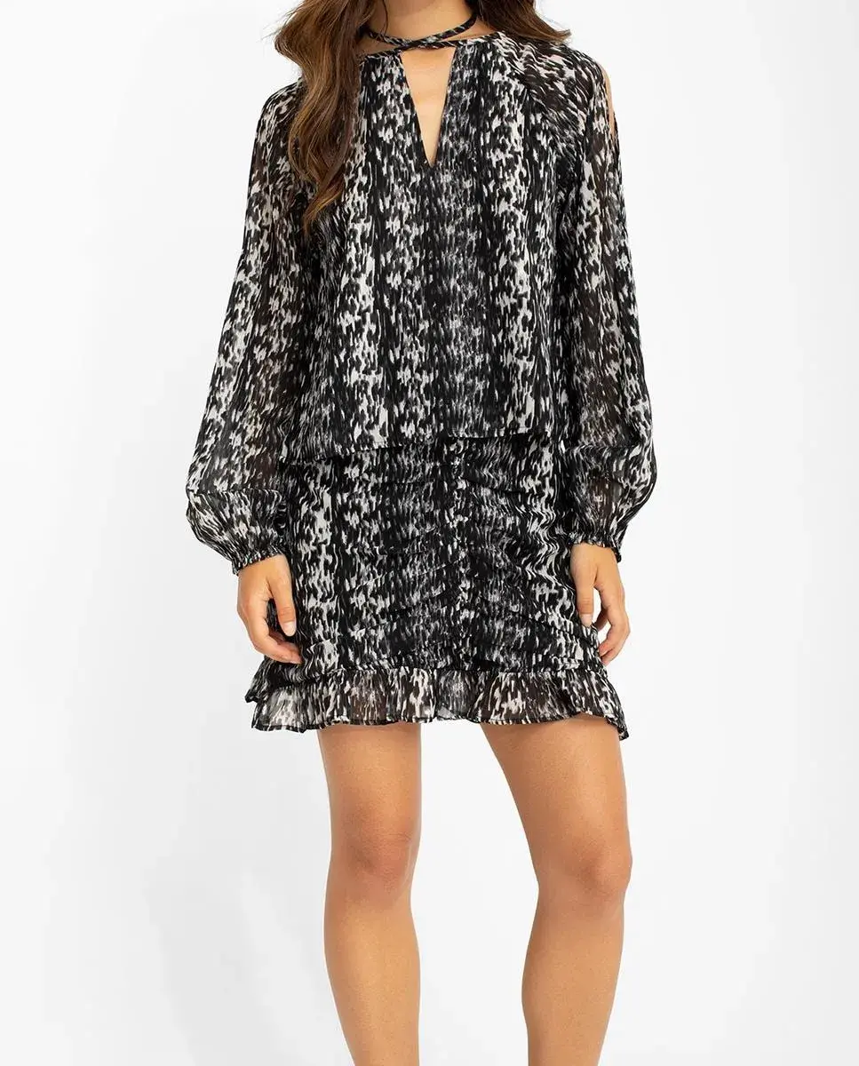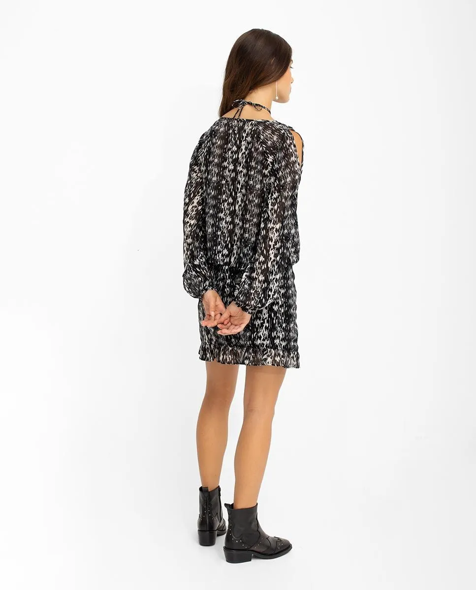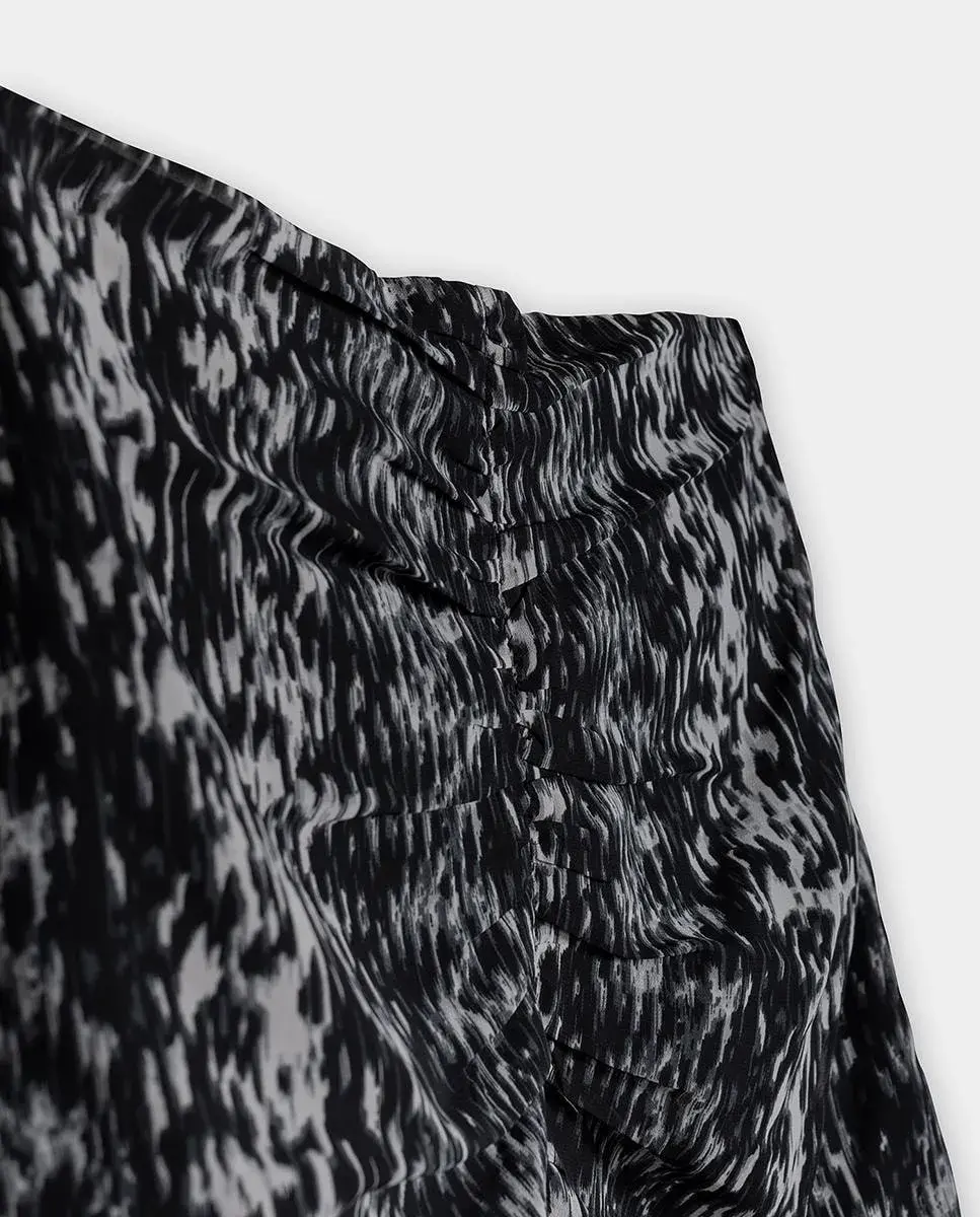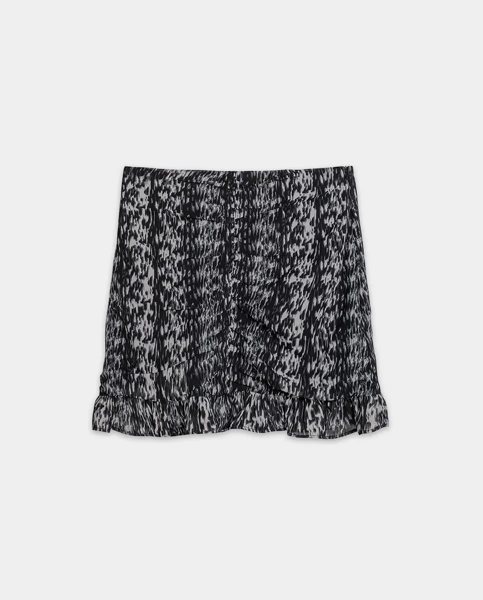 Мини-юбка с принтом, с драпировкой спереди и центральным швом. Заканчивается мини-воланом внизу, застегивается на боковую молнию.