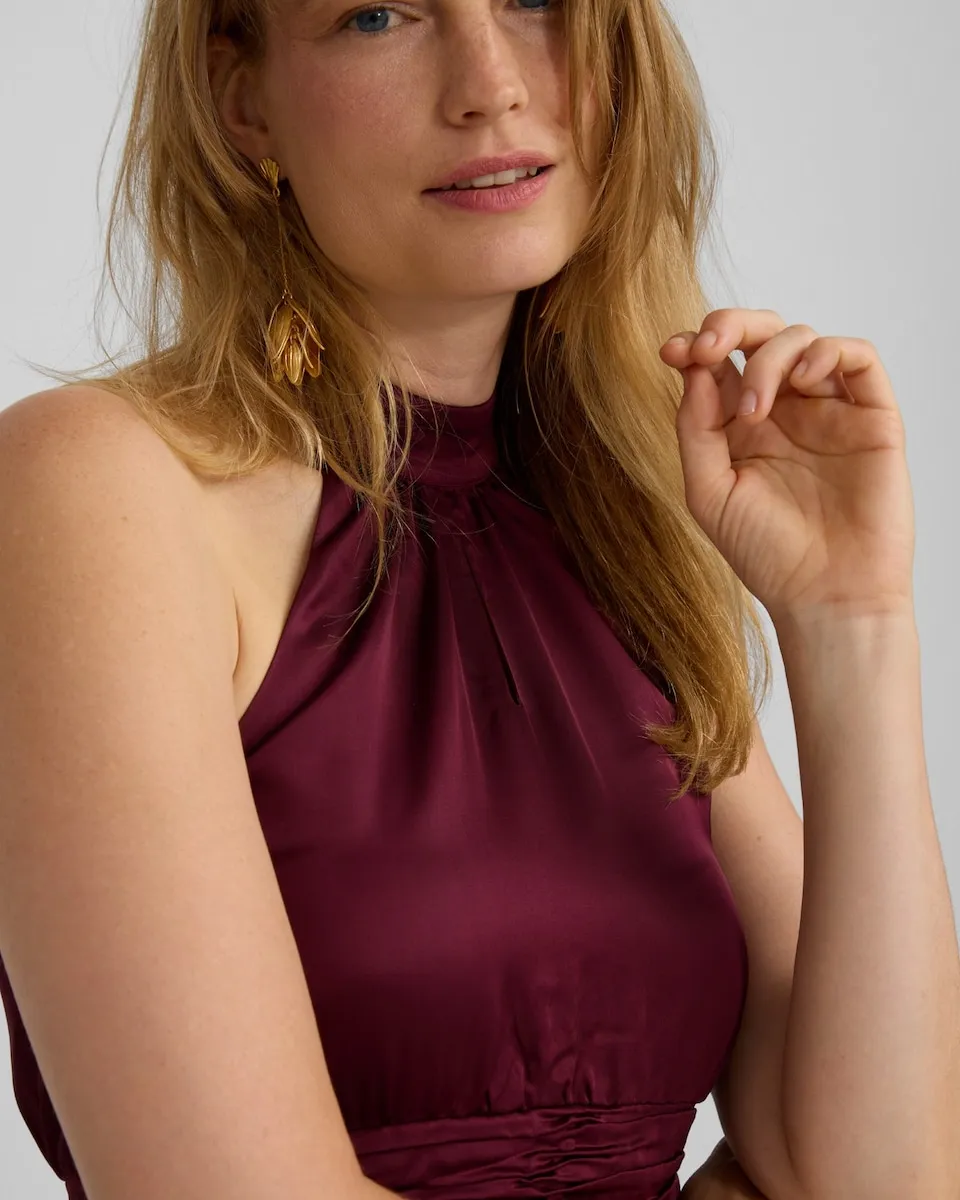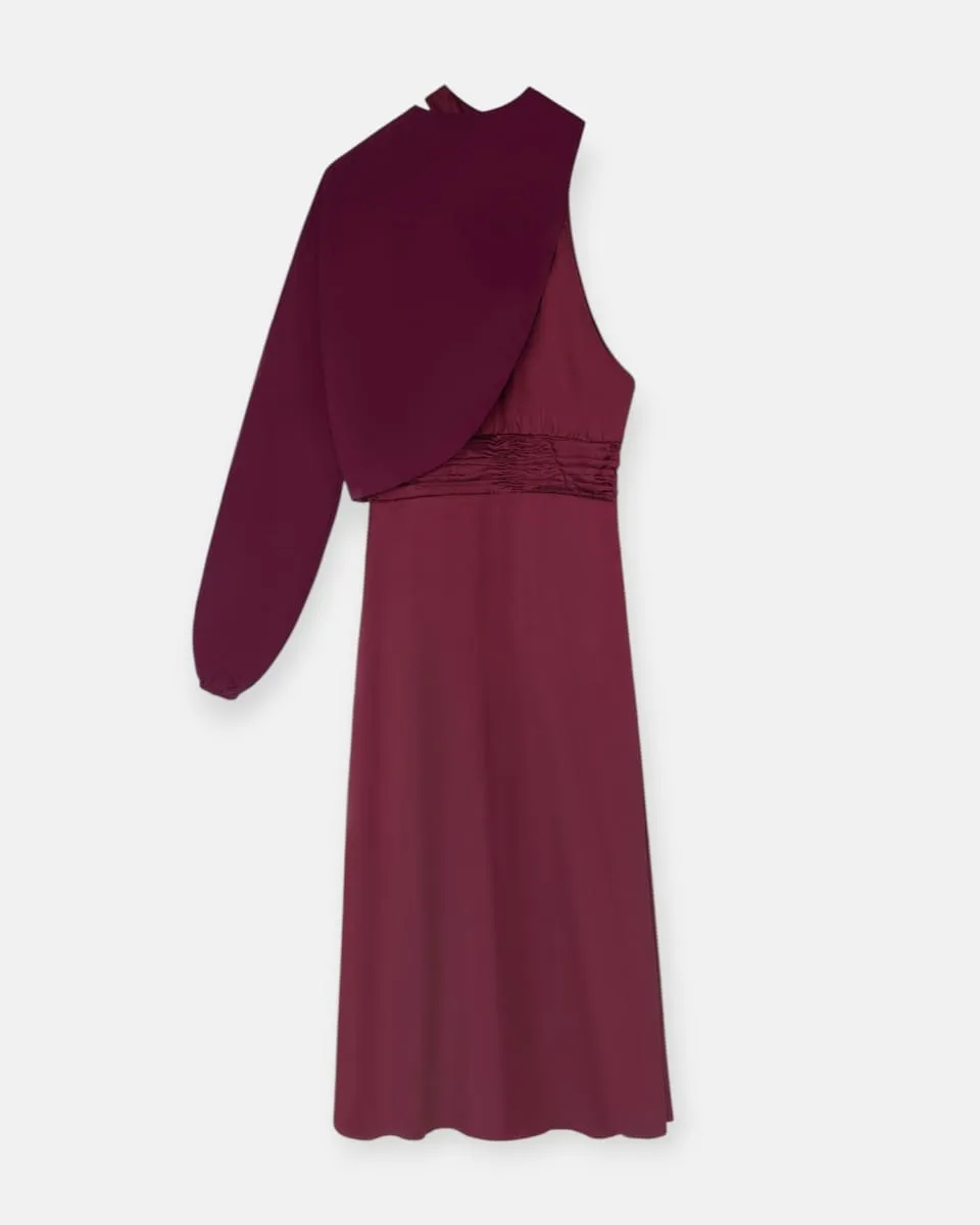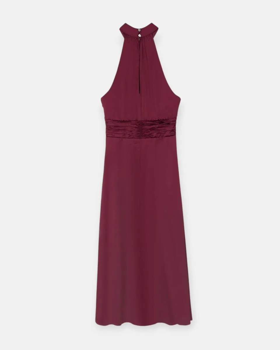 Длинное платье с отстегивающимся плащом бордового цвета с сатиновым блеском. Имеет воротник-халтер с декоративной деталью спереди и присборенную талию. Закрывается на невидимую боковую молнию, подкладка в тон. В комплекте асимметричная шифоновая накидка в тон.