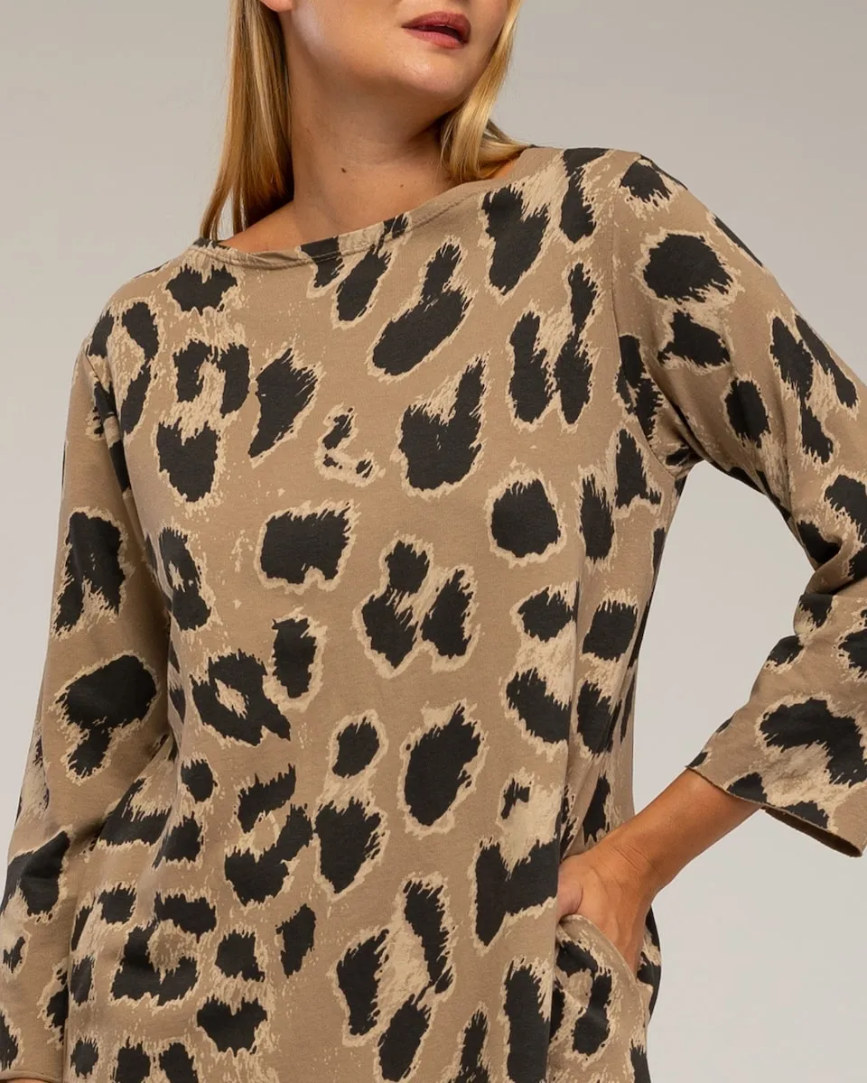 Платье оверсайз с животным принтом, длинными рукавами и карманами.