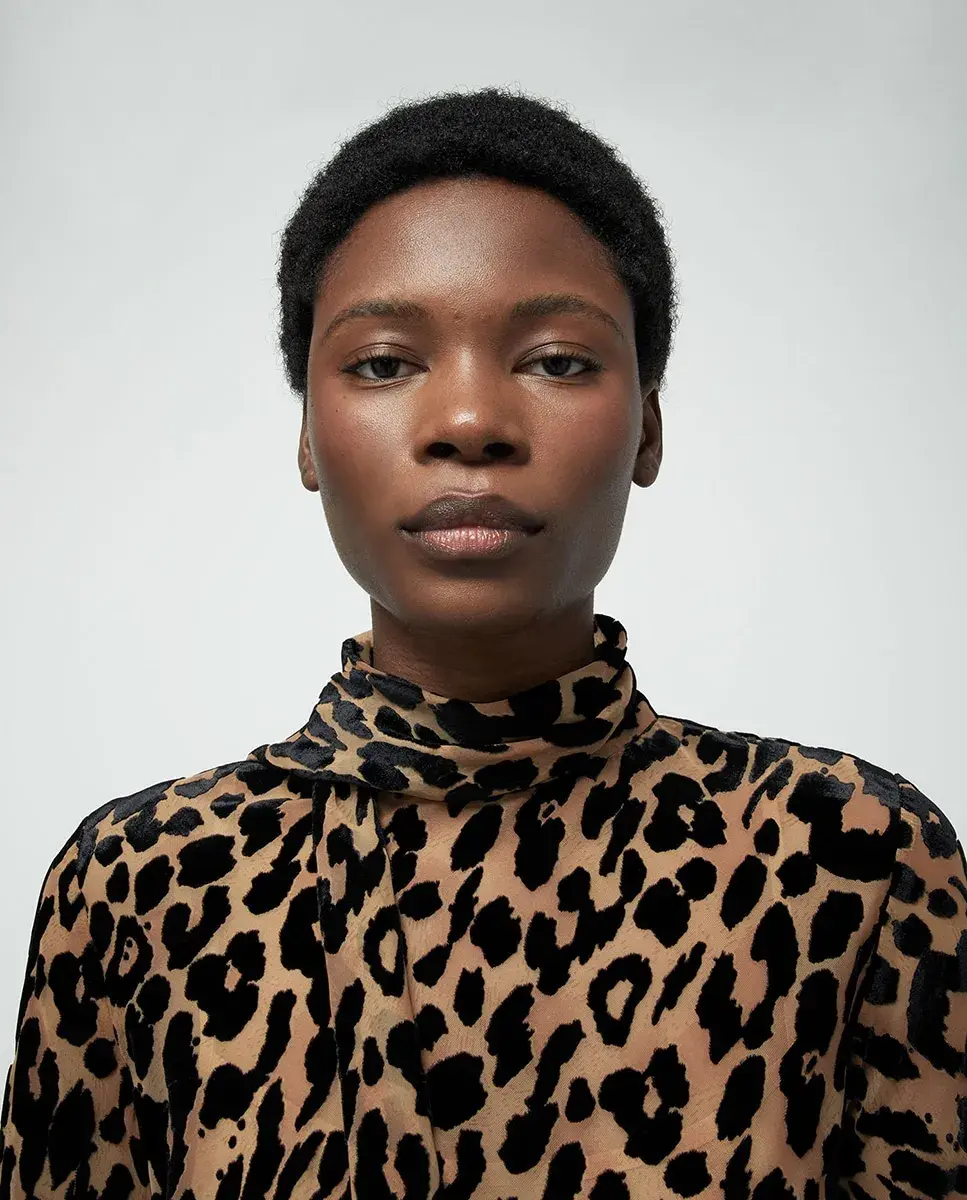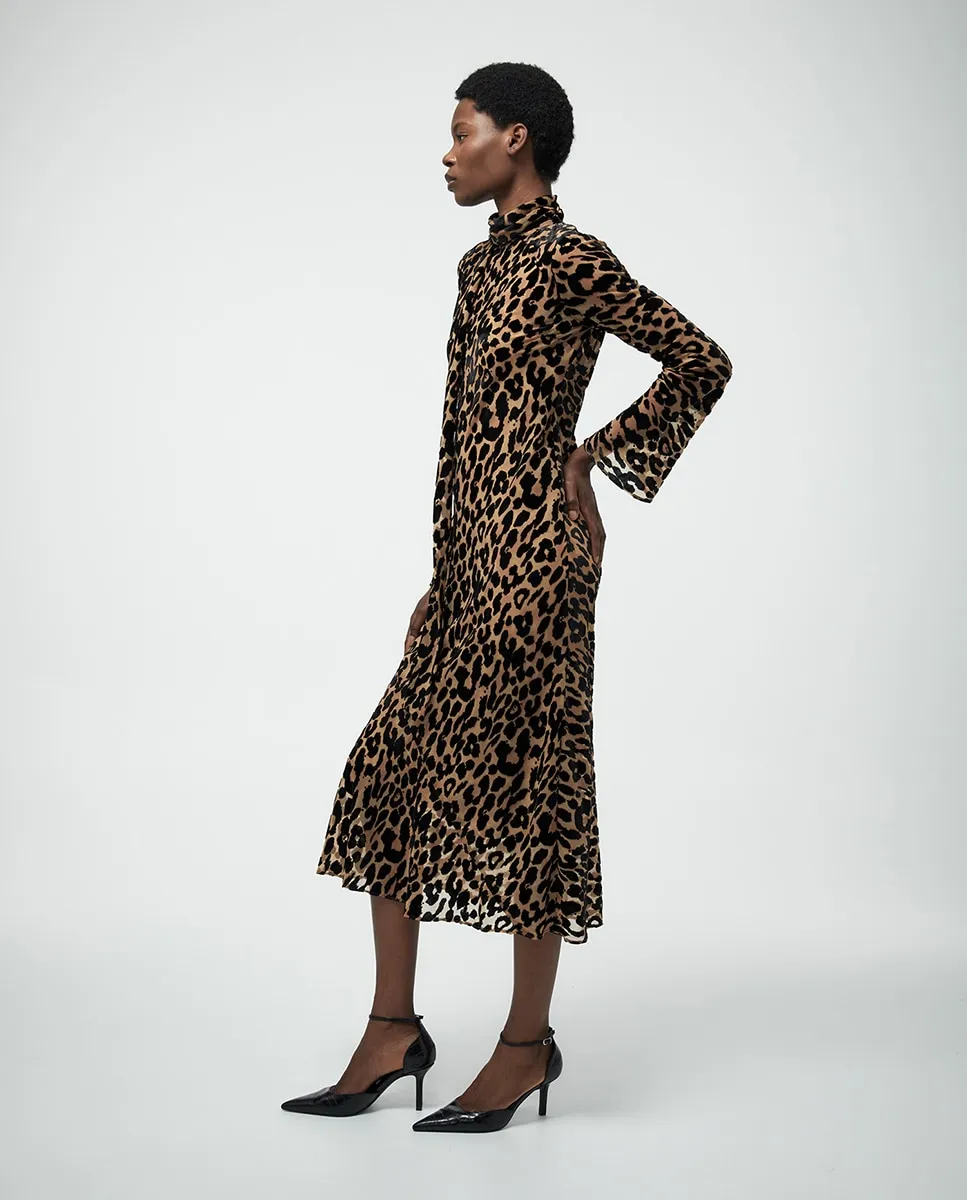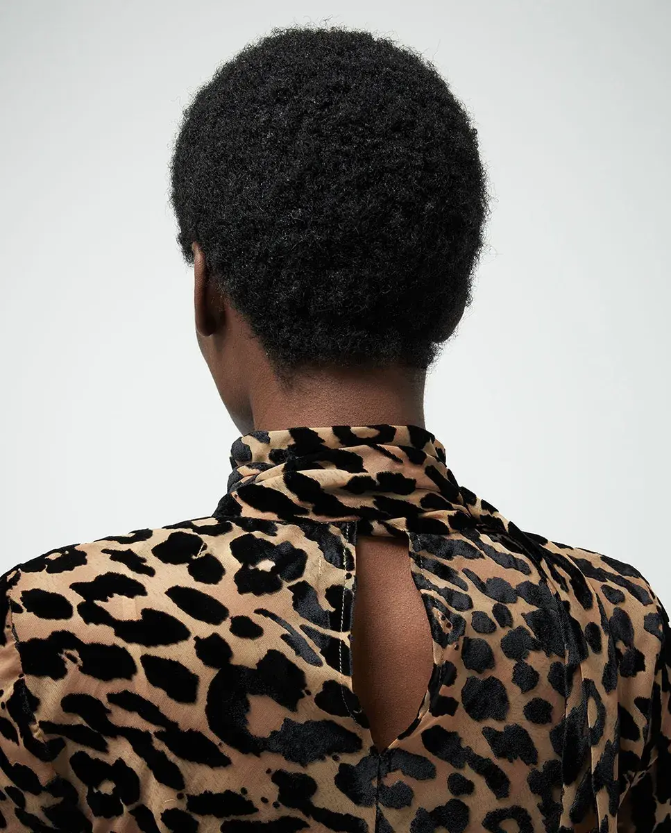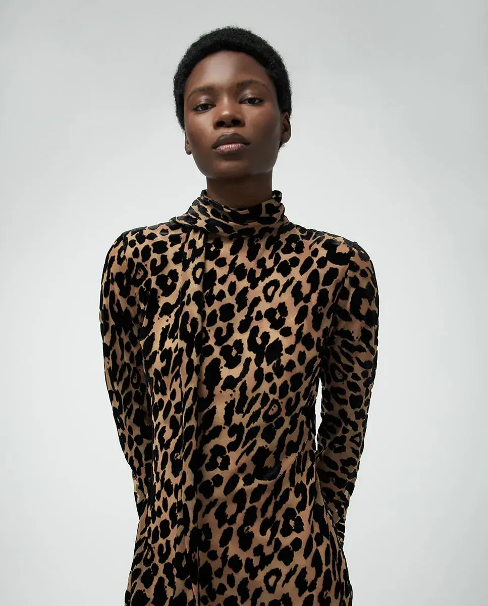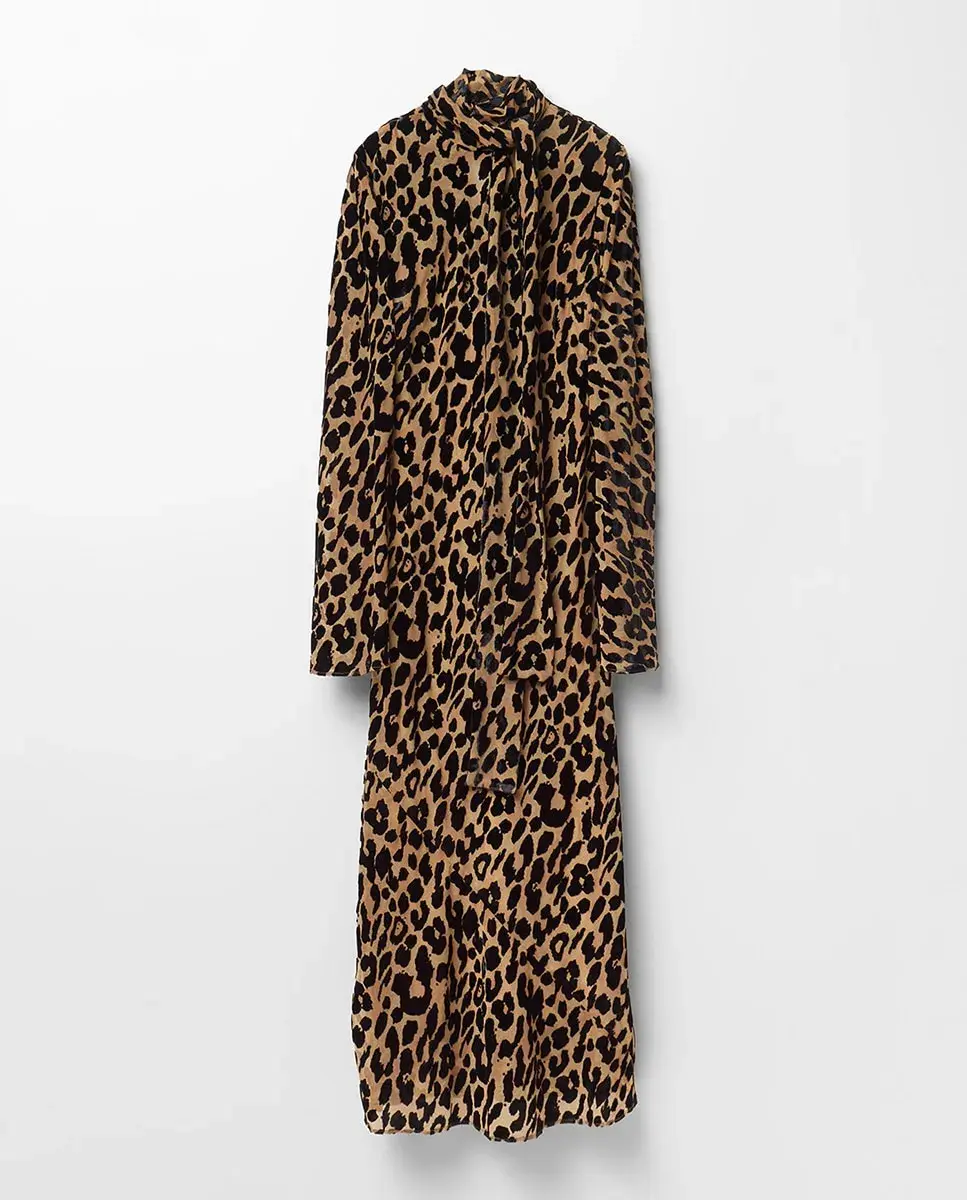 Длинное платье с леопардовым принтом и завязкой на шее. Задняя застежка в виде капли с разрезом