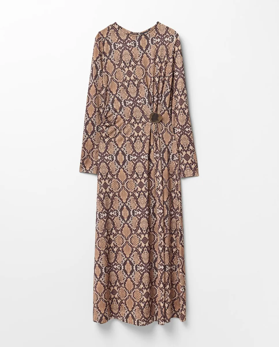 Платье с длинными рукавами и круглым вырезом, с животным принтом, аппликацией и сборками. Застежка на скрытую молнию.