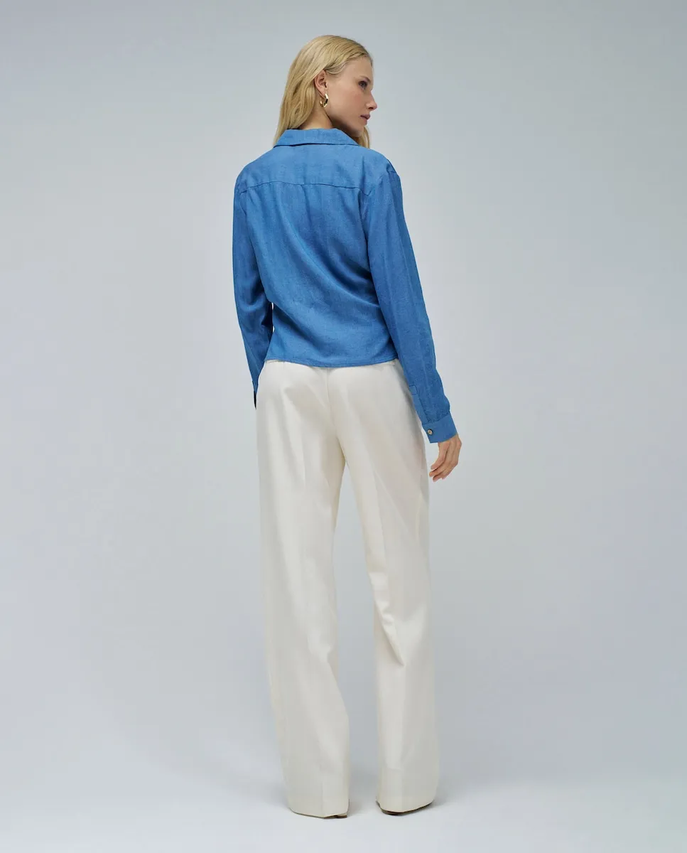 Легкая, женственная и стильная. Эта блузка из светлого денима синего цвета - идеальный выбор для тех, кто ищет непринужденный образ с небольшим акцентом на изысканность. V-образный вырез с удлиненным воротником визуально удлиняет силуэт и элегантно подчеркивает шею, а длинные рукава с застежкой на пуговицы придают образу структуру. Золотые пуговицы добавляют стильный блеск, элегантный без усилий. Деталь в виде узла на талии позволяет подчеркнуть фигуру, создавая лестный эффект, подходящий для всех типов тела. Блузка из светлого денима. Синий цвет. V-образный вырез. Длинные рукава с манжетами на пуговицах. Детали с золотыми пуговицами. Узел на талии. Для справки: модель ростом 1,78 м и носит размер S.