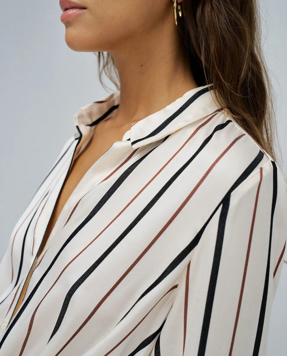 Романтичная с современным акцентом, эта рубашка выделяется полосками и узким кроем, подчеркивающим женственную фигуру. Вырез под горло и застегивающиеся манжеты добавляют нотку изысканности, а деталь с перекрутом на подоле придает оригинальности образу. Идеально подходит, чтобы оживить повседневный образ или добавить изюминку к самым элегантным комбинациям. Рубашка в полоску. Вырез под горло. Узкий крой. Застегивающиеся манжеты. Пуговицы и деталь с перекрутом на подоле. Для справки: модель ростом 1,75 м и носит размер S.