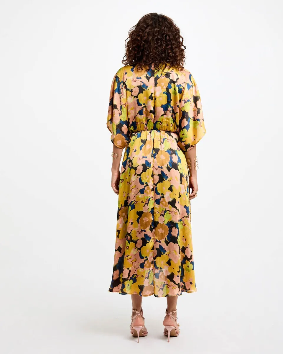 Прямое миди-платье с принтом. Свободный прямой крой. Миди-платье. Перекрестный вырез. Рукава 3/4 с объемной формой. Цветочный принт.