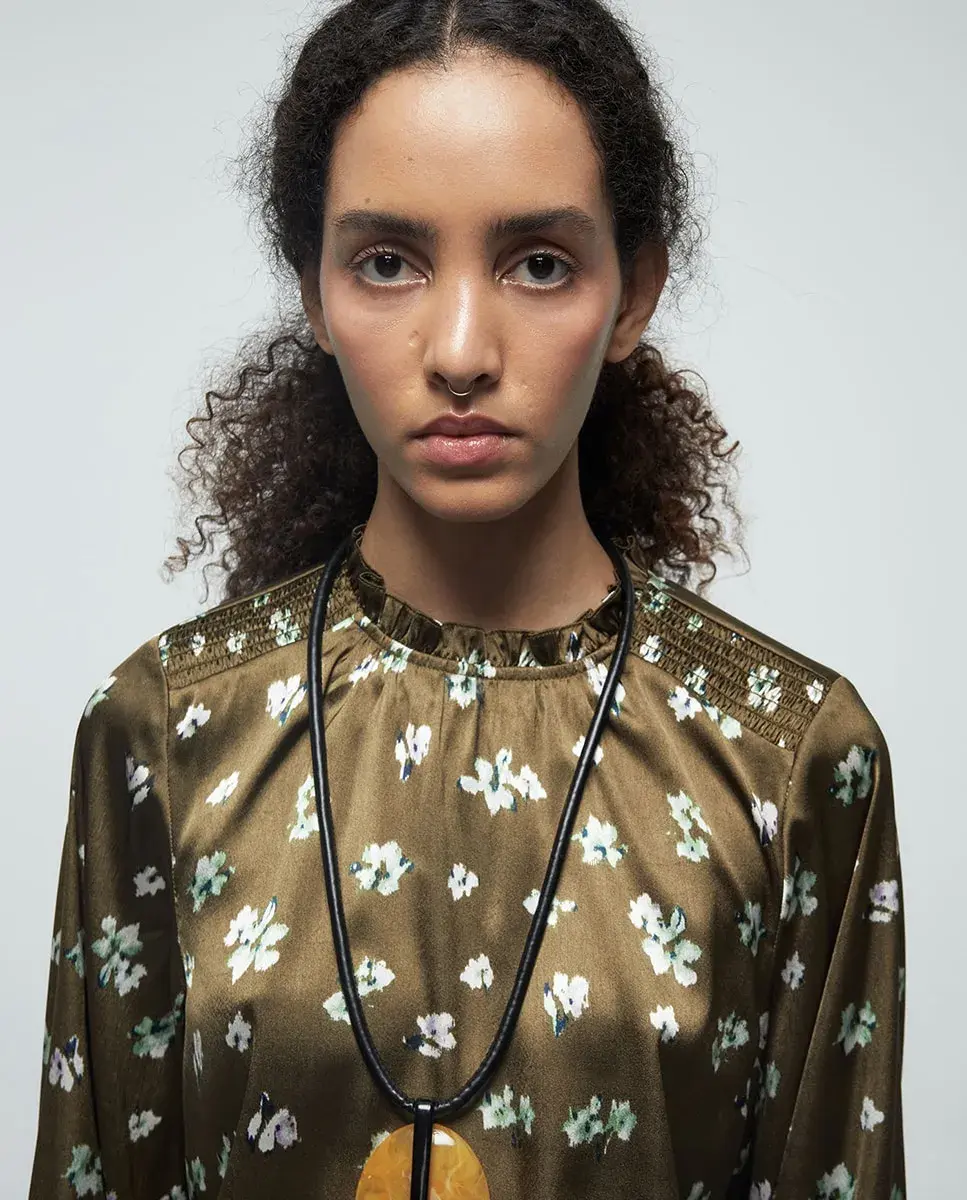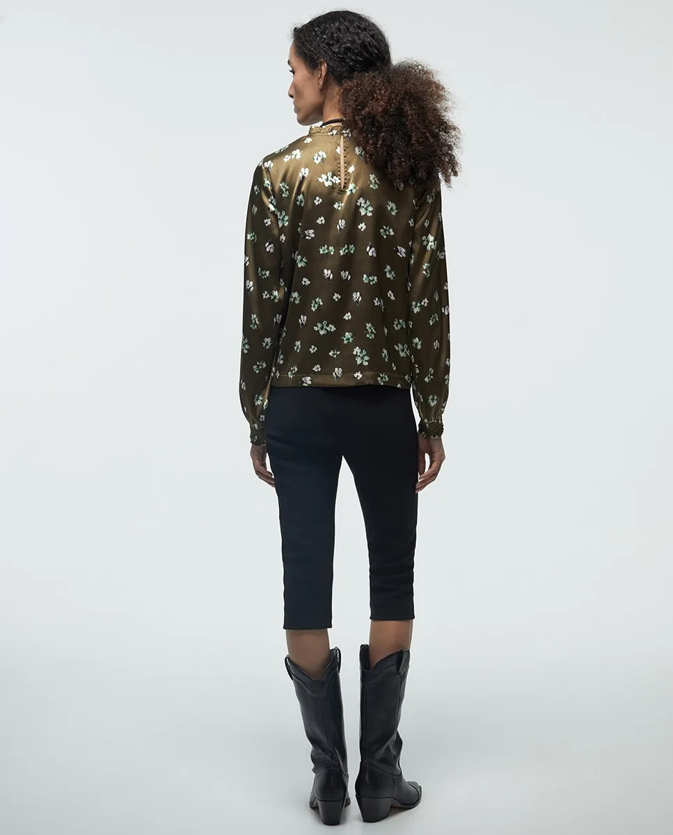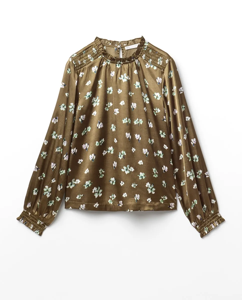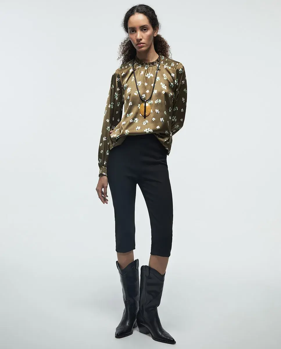 Легкая блуза с длинными рукавами и воротником-скрипкой, с деталью сборки. Застежка сзади на каплю с кнопкой.