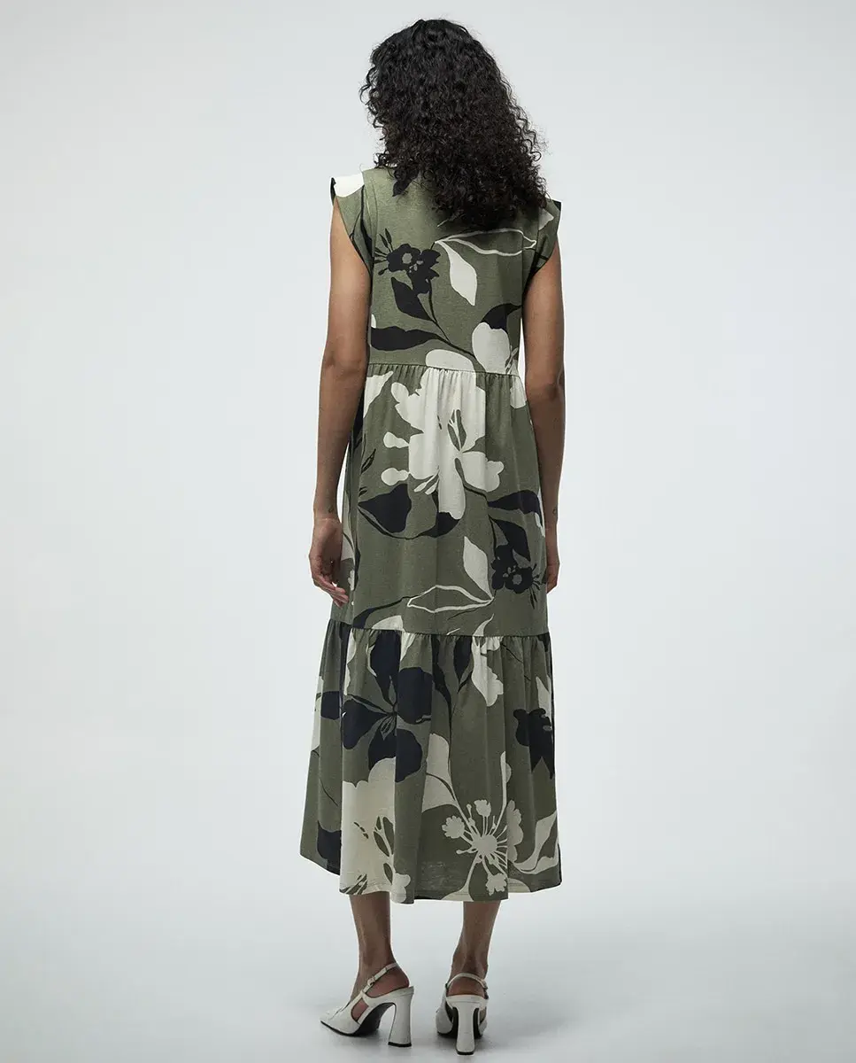Длинное платье с принтованными панелями и v-образным вырезом