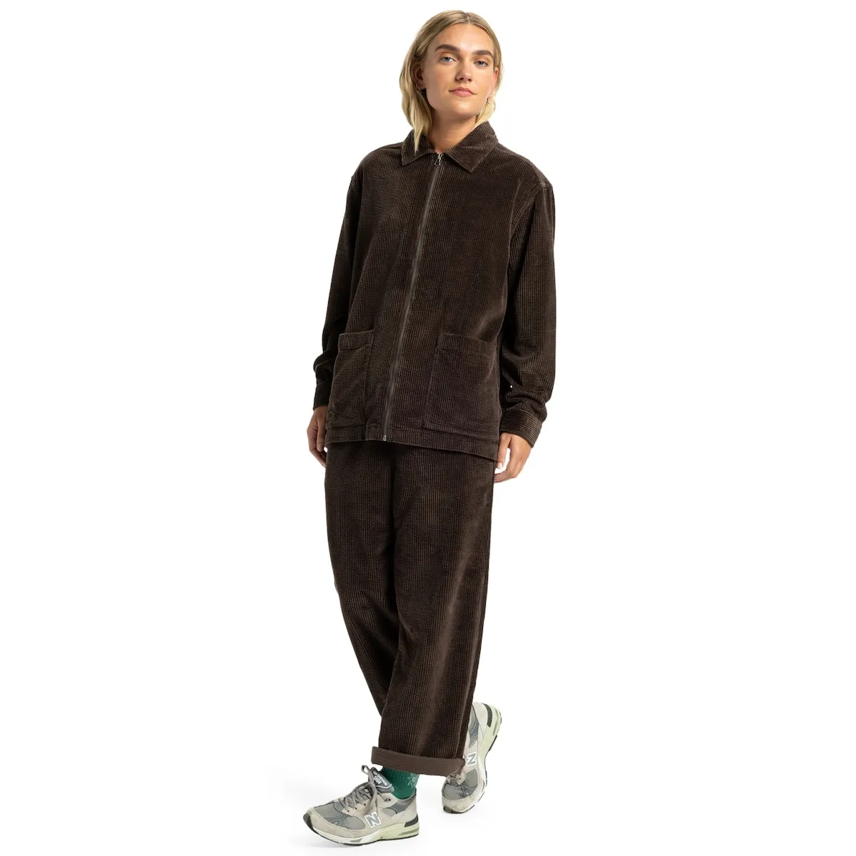 Широкая женская рубашка с молнией. Характеристики включают: Ткань: вельвет с пузырьками, 285 г/м², Крой: жакет-рубашка, Застежка/Воротник: молния, Стирка: окрашивание в пигменте и ферментная стирка для винтажного вида, Сезонная этикетка спереди, Смесь переработанных этикеток и прямой низ.