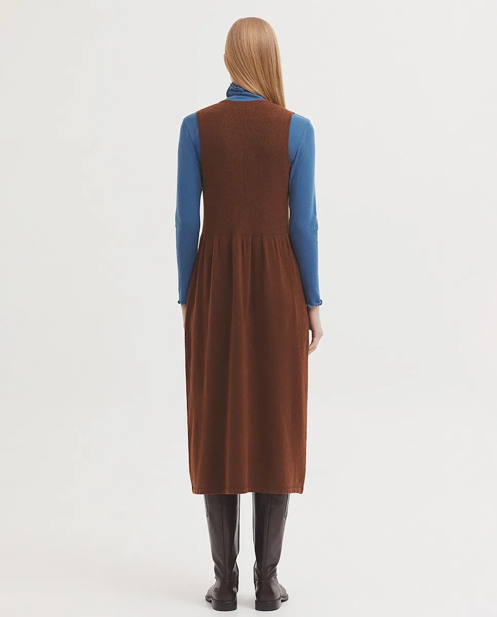 Платье-комбинезон с бретелями из рифленой ткани из шерстяной смеси. V-образный вырез, центральная передняя застежка на пуговицы и накладные карманы. Юбка из гладкого трикотажа с отделкой резинкой.