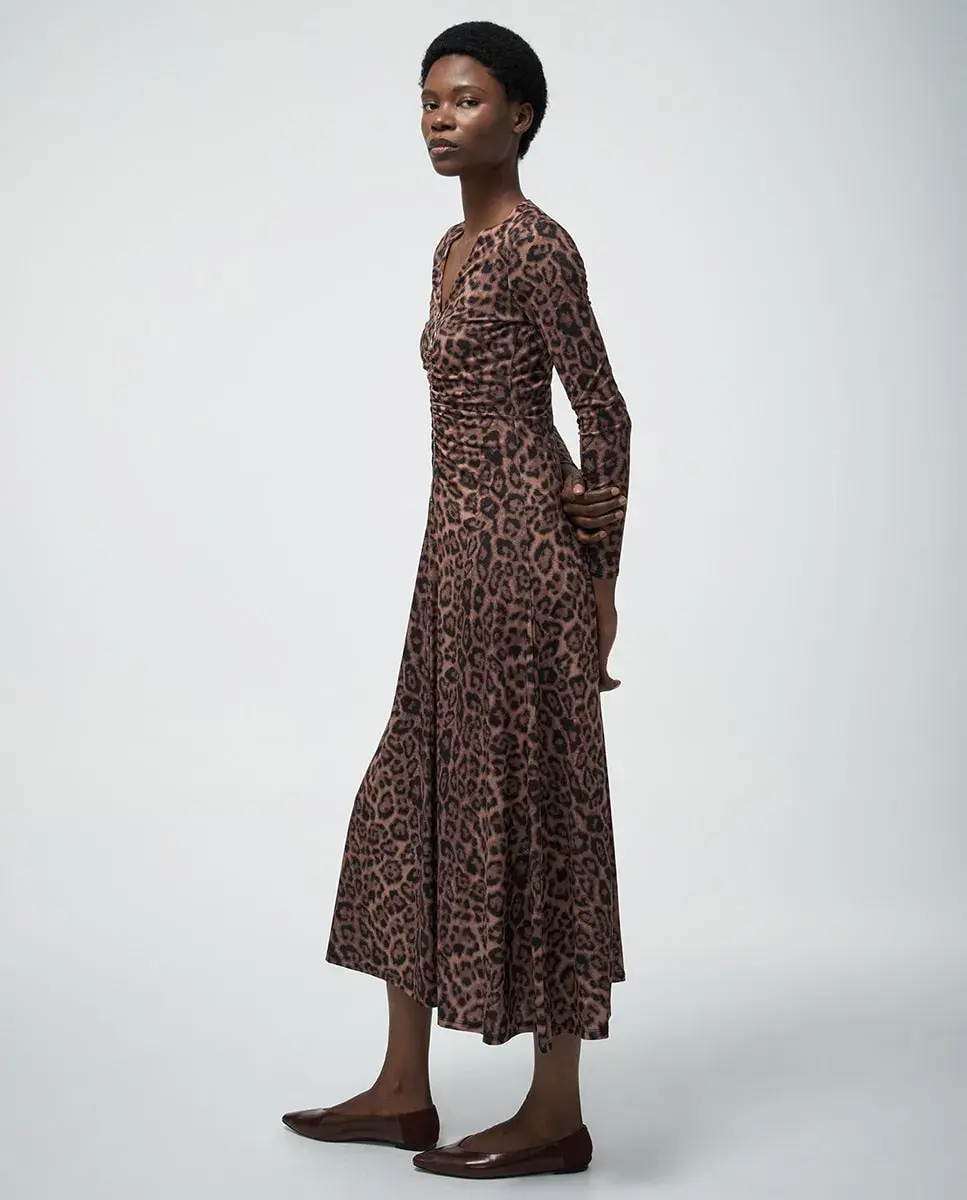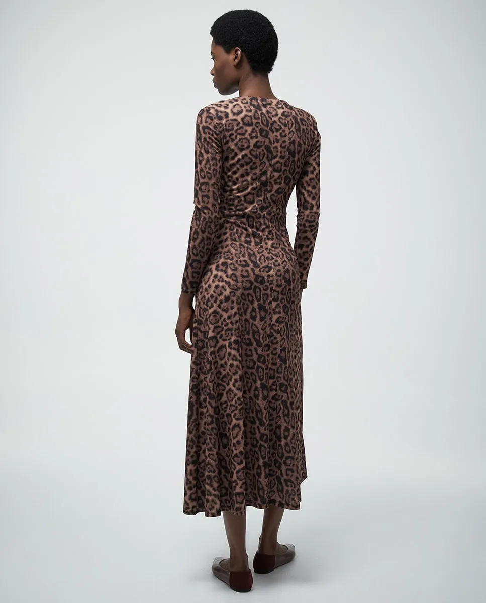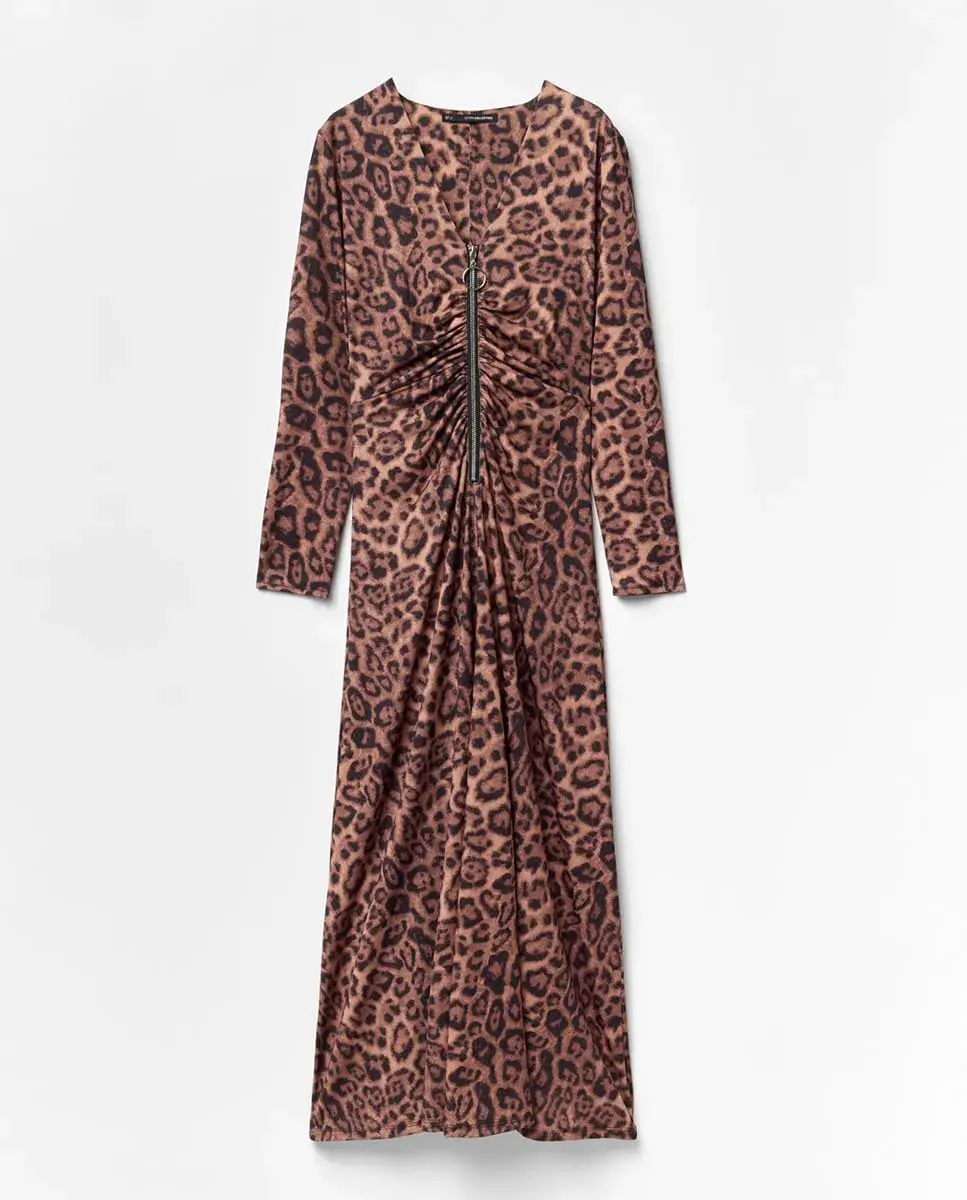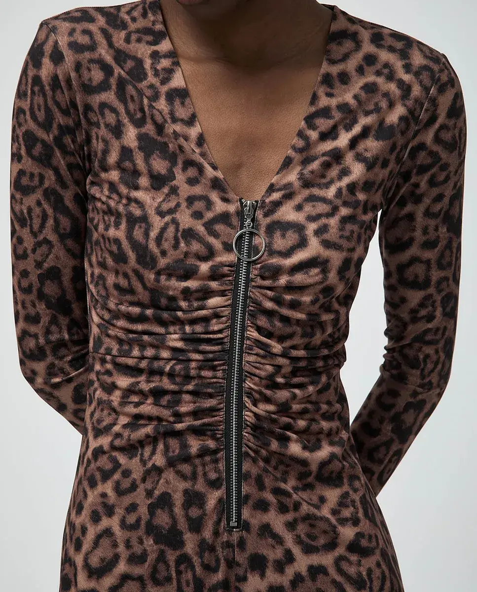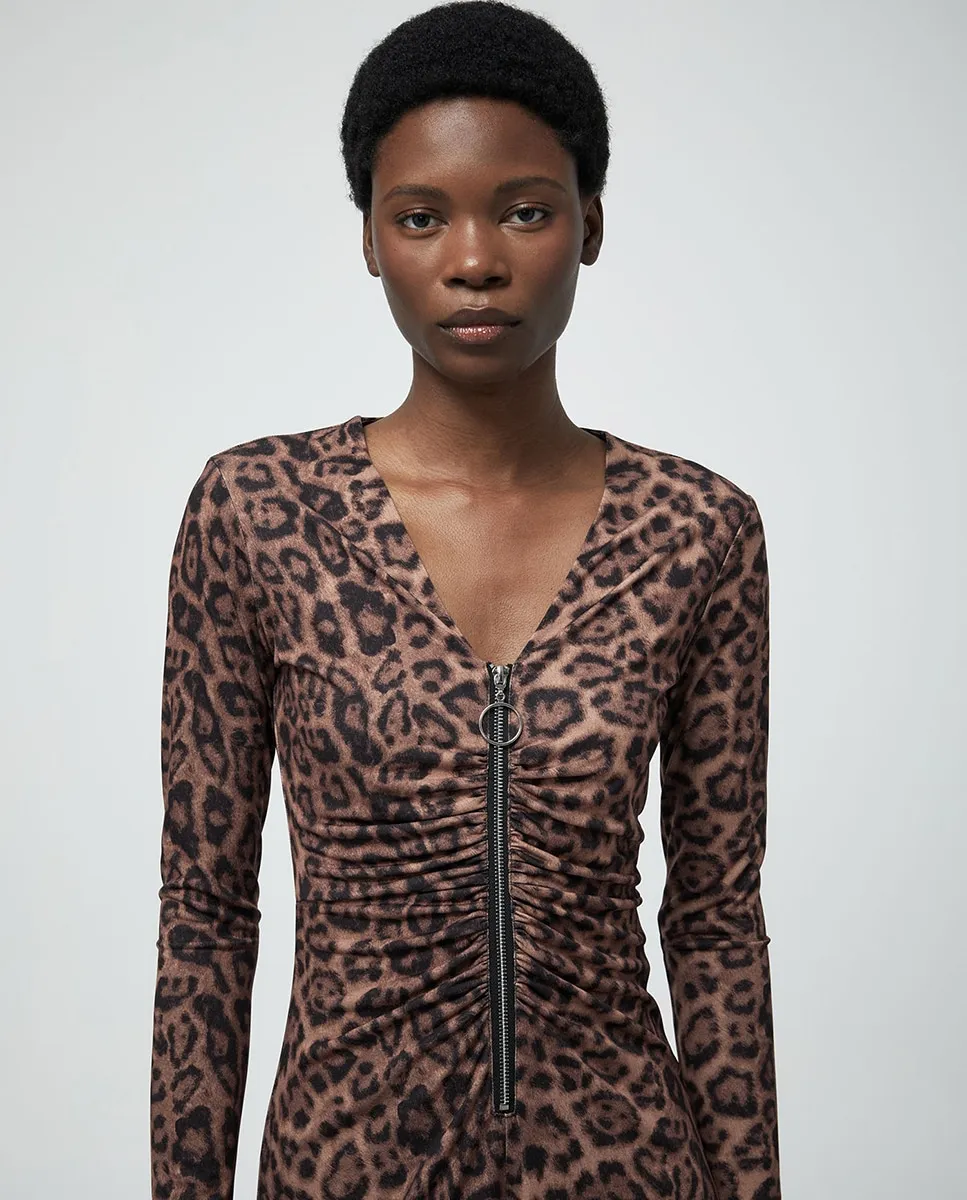 Платье с длинными рукавами и V-образным вырезом с анималистичным принтом. Застежка-молния спереди.