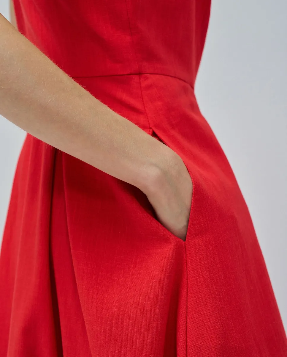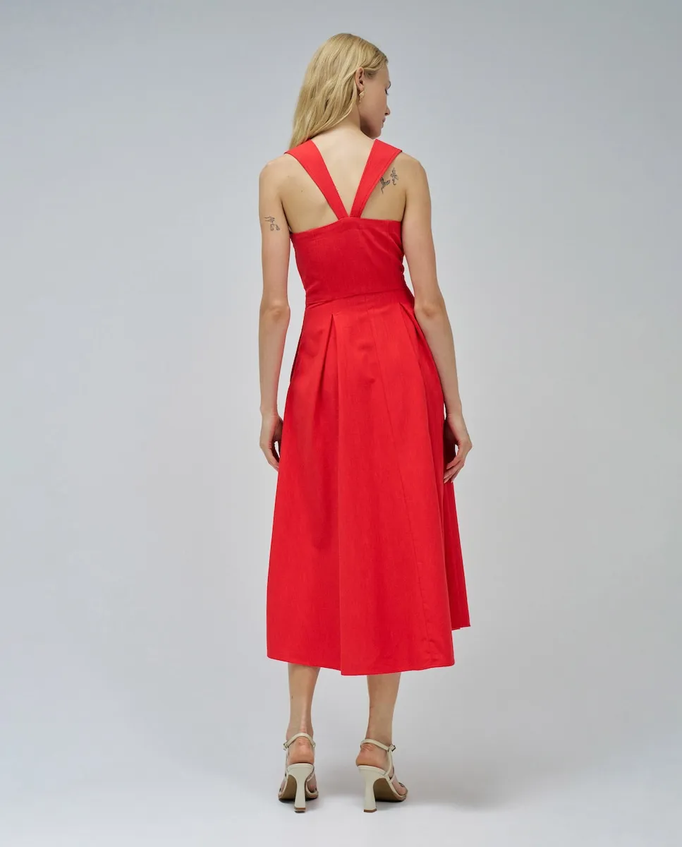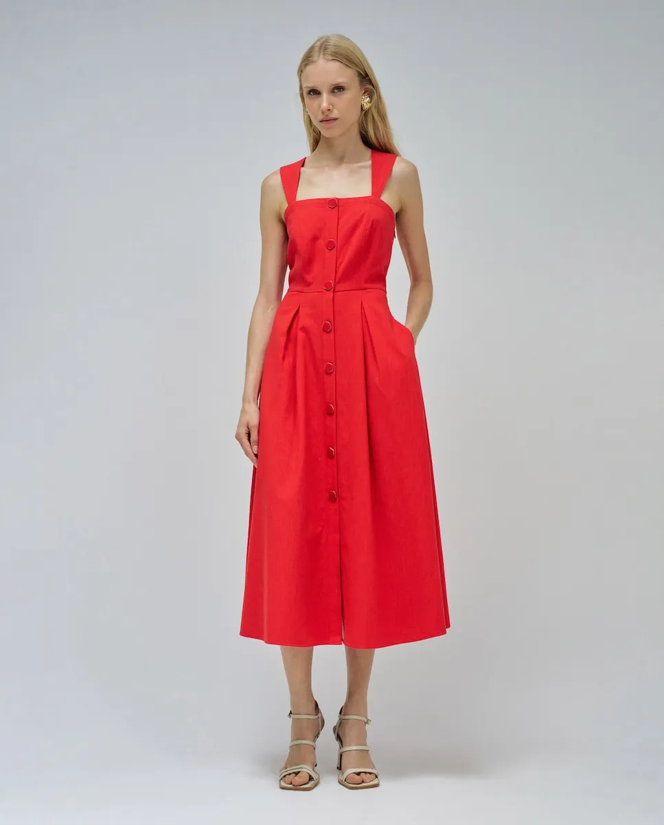 Красивое и яркое. Это миди-платье дарит неповторимое ощущение свежести. Обтягивающее в зоне груди и с подчеркнутой талией, оно повторяет контуры вашего тела, расширяясь в красивую юбку А-силуэта, которая обеспечивает движение и легкость при каждом вашем шаге. Нам очень нравится деталь со складками, которые добавляют объем и изящество, а также красные пуговицы, подчеркивающие его более утонченный и очаровательный вид. Квадратный вырез современный, а широкие бретели, соединяющиеся на спине, обеспечивают поддержку и комфорт. Боковые карманы, аккуратно скрытые, придают практичность и удобство. Это платье вызывает радость и ощущение свободы лета, идеально подходит для прогулки у моря, пикника в парке или вечернего кофе с друзьями. - Миди-платье - Широкие бретели, соединяющиеся на спине - Квадратный вырез - Боковая застежка-молния - Со складками - Боковые карманы - Передняя застежка на пуговицы Для справки: модель ростом 1,78 м и носит размер S.