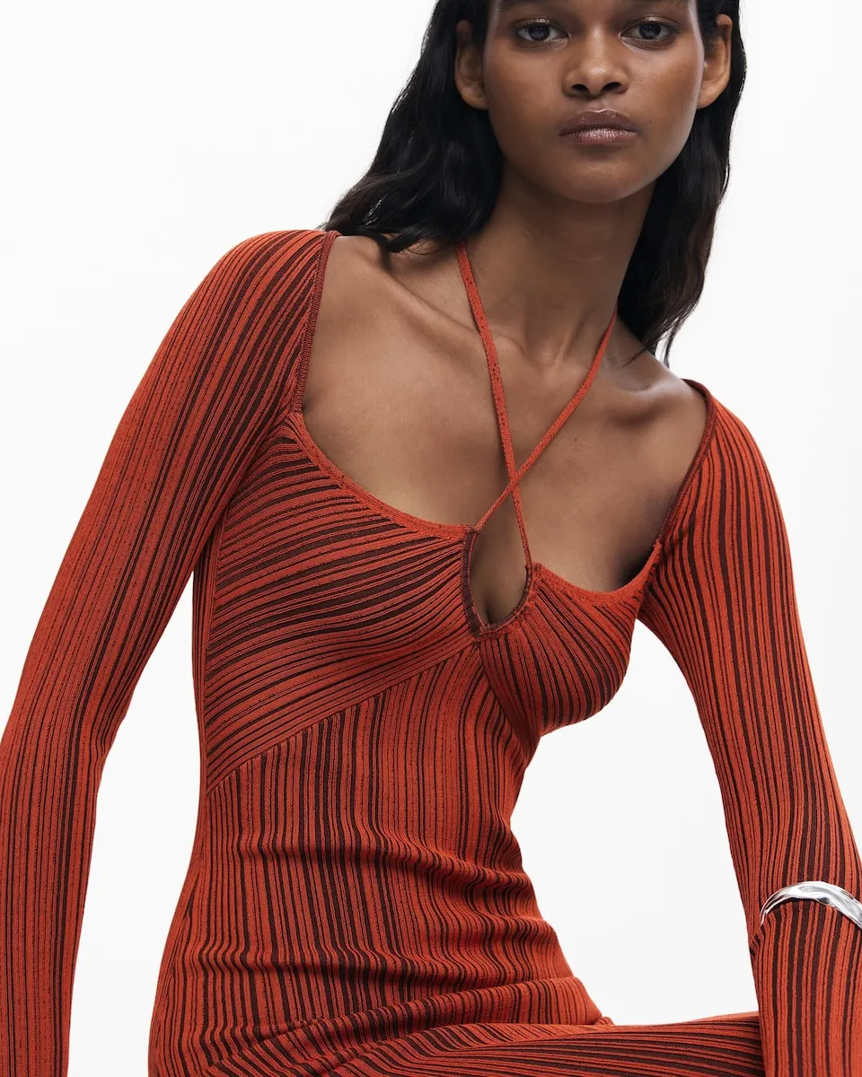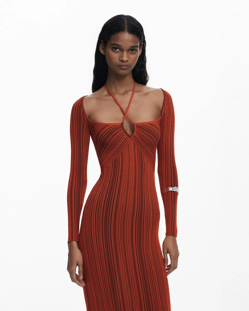 Приталенное миди-платье с длинными рукавами, с принтом в виде вертикальных полос и глубоким вырезом с вырезом и перекрещивающимися лямками. Цвет: однотонный. Крой: приталенный. Рукав: длинный. Длина: миди.