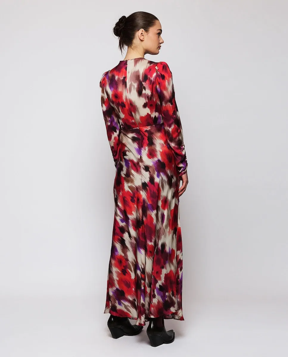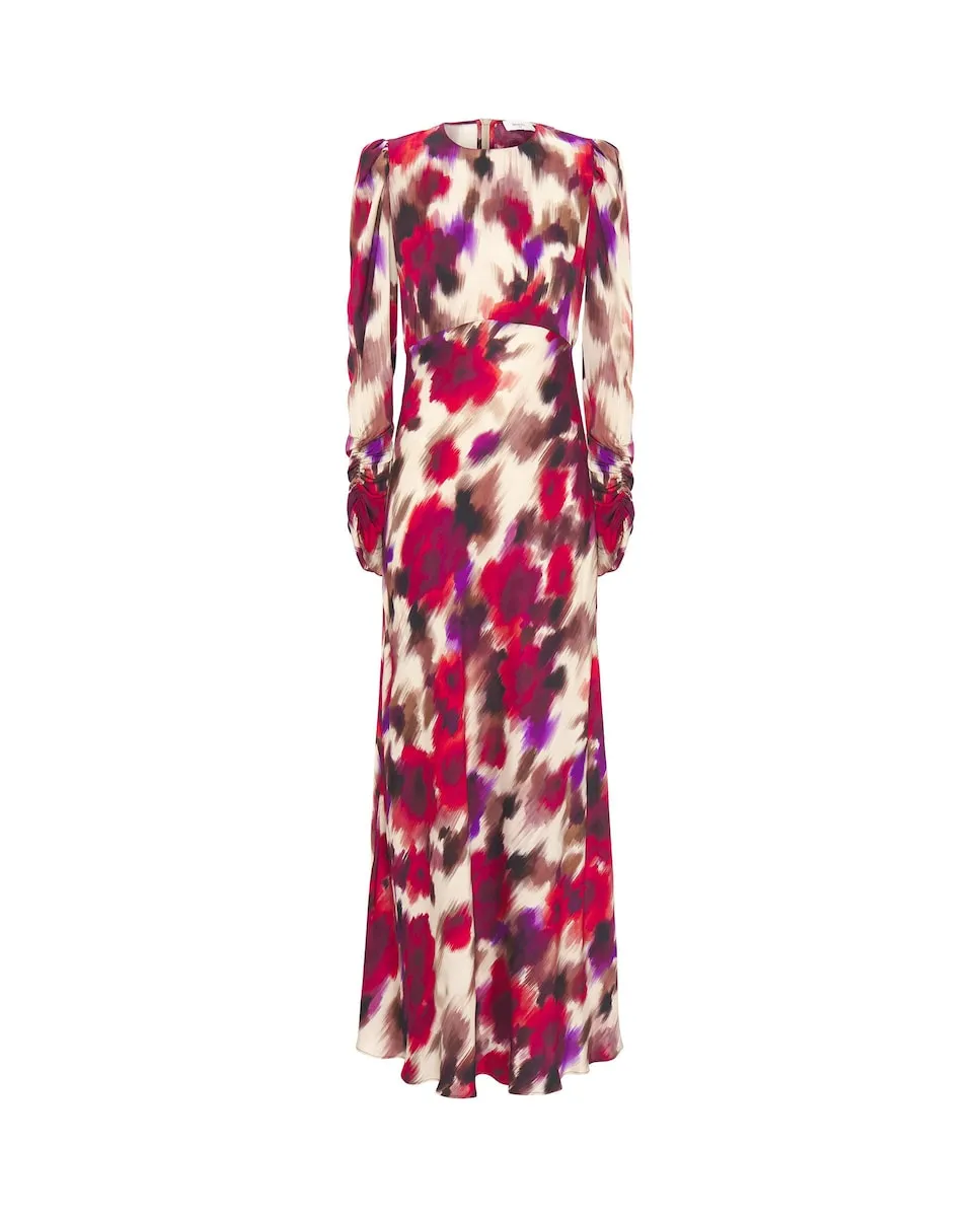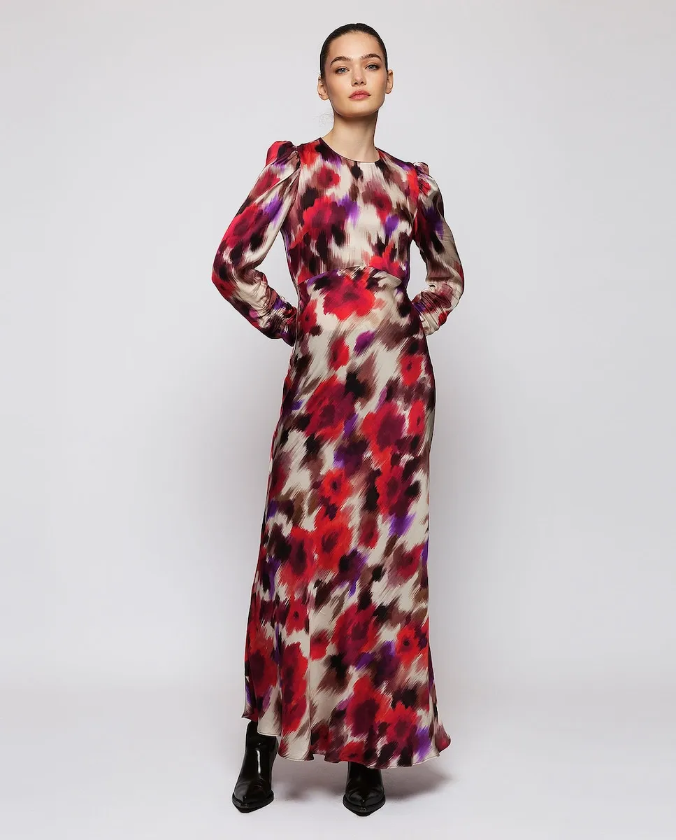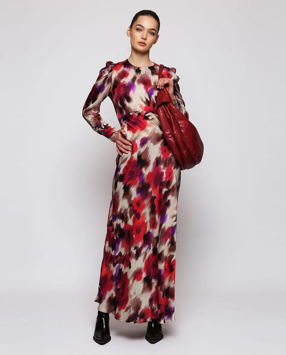 Длинное платье красного и фиолетового цветов с принтом икат. Круглый вырез, подчеркнутые плечи с подплечниками и сборками. Молния сзади скрытая, длинные рукава с эластичными сборками на манжетах. Свободный крой.