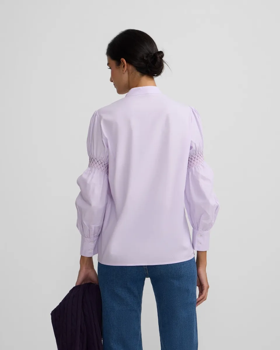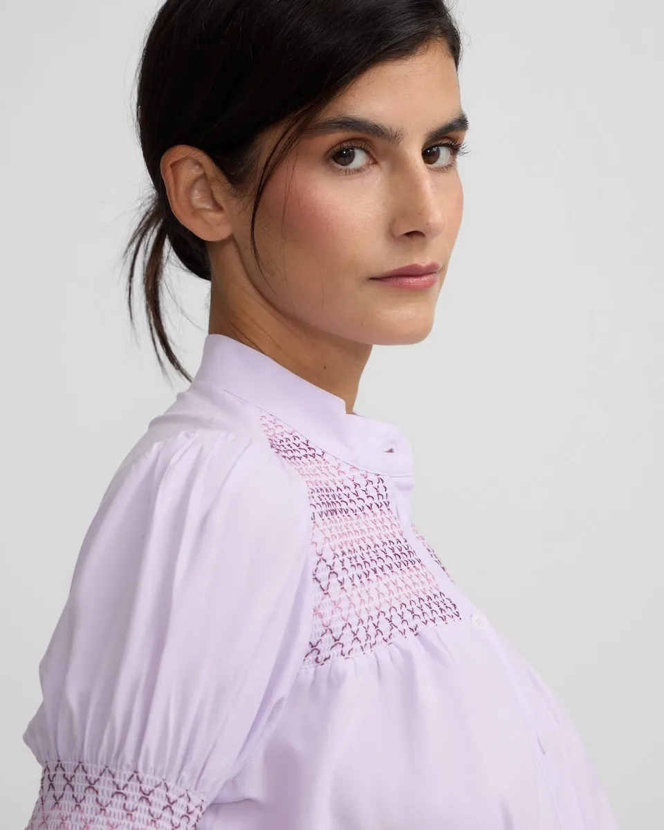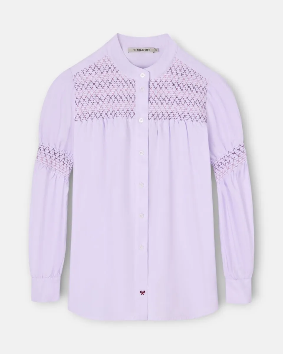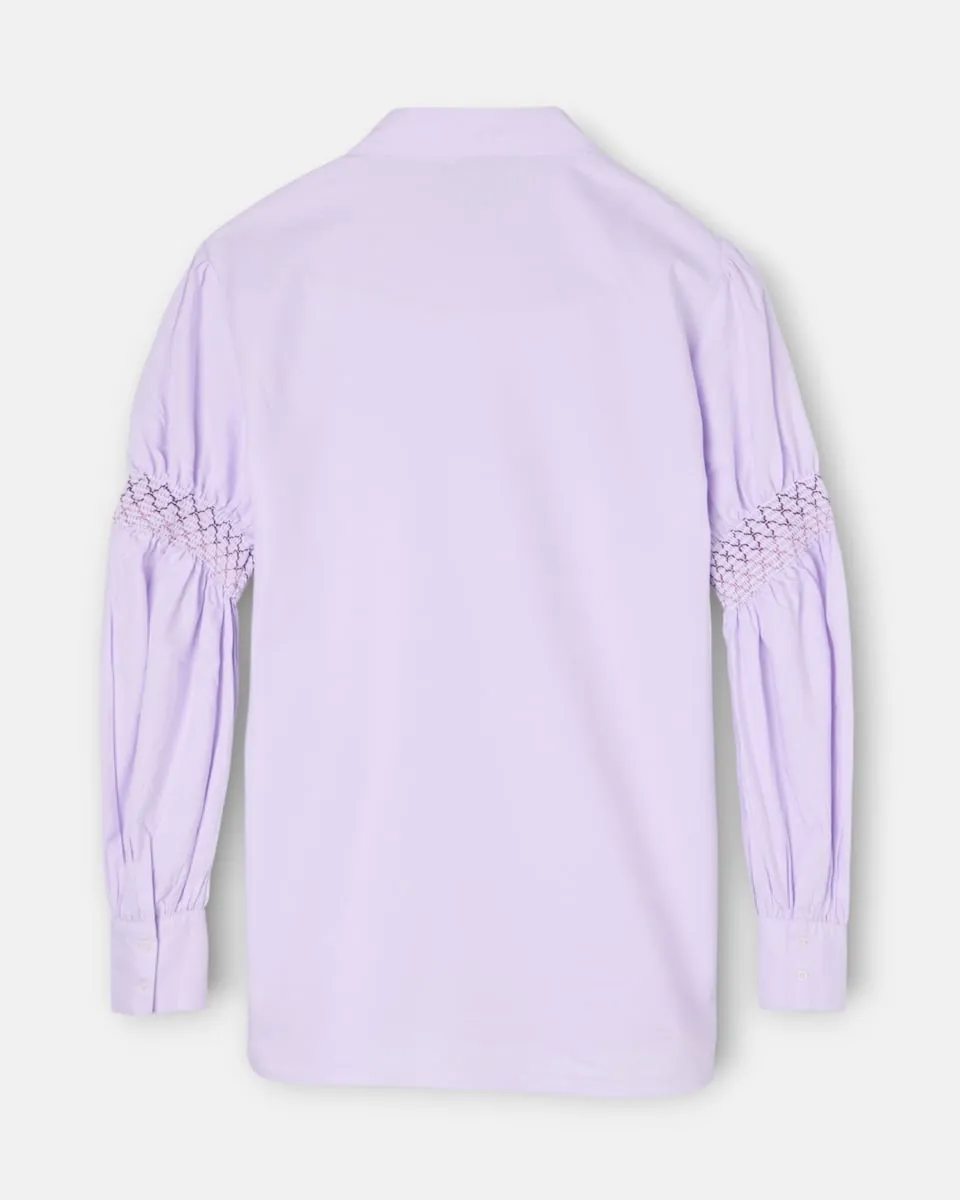Рубашка сиреневого оттенка с длинным рукавом, выполненная из 100% хлопка с прямым кроем Regular Fit. Имеет воротник-стойку и декоративную строчку контрастного бордового цвета в верхней части. Застежка на планку с индивидуальной белой пуговицей в виде рубашечного пуговичного элемента. Длинный рукав с объемом, манжеты и деталь в технике смок на бицепсе, а также контрастная бордовая вышивка. Сделано в Португалии.