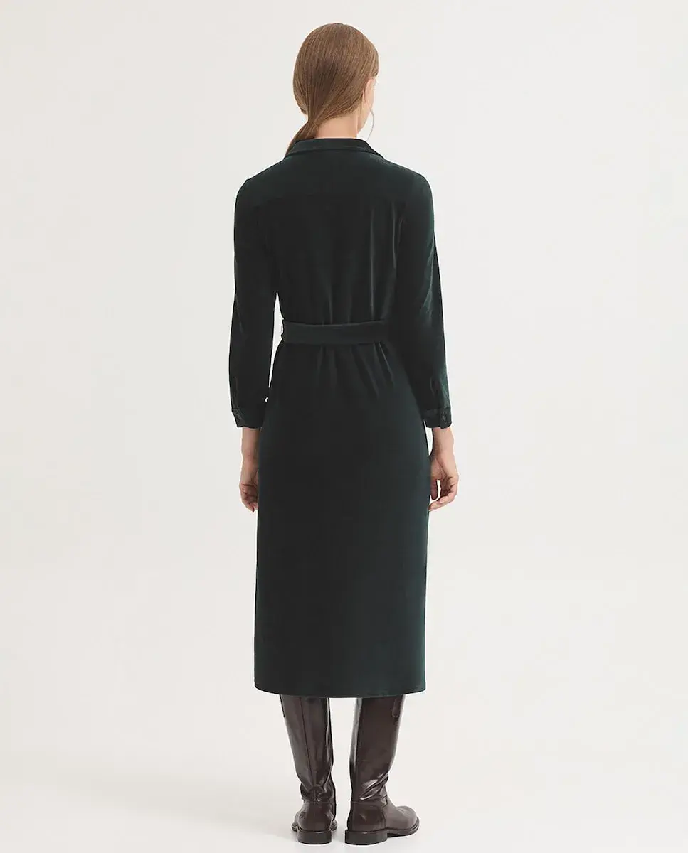 Платье-рубашка из эластичного хлопкового микровельвета. Передние накладные карманы и пояс.