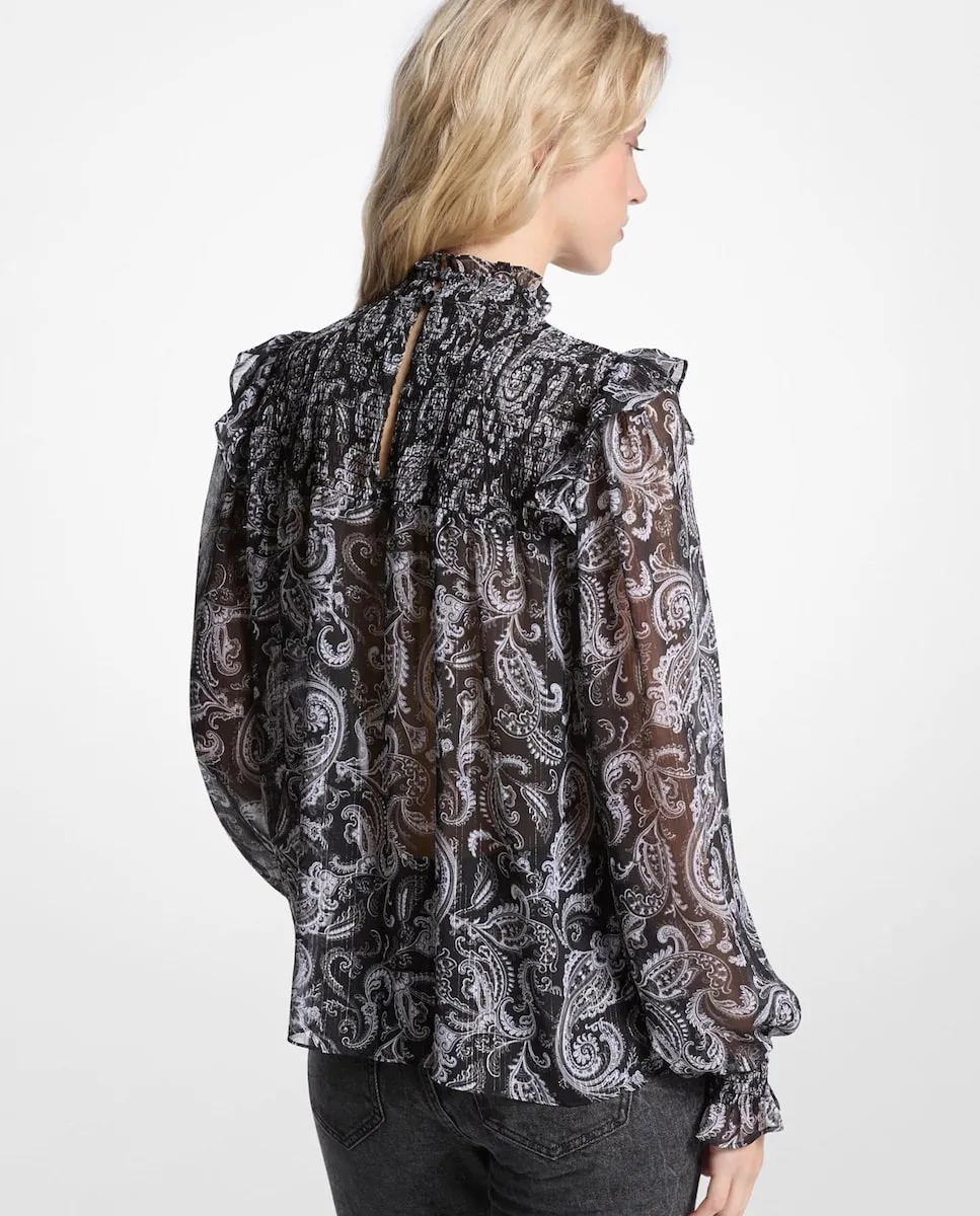 Эта блузка с нижней майкой выделяется сложной сборкой на кайме и рукавах, представляя собой современную версию богемного дизайна. Изготовлена из креп-шифона с узором пейсли, вплетенным металлическими нитями, свободного силуэта с волнистыми рукавами, подчеркивающими ее объем. Благодаря непринужденной привлекательности отлично сочетается с темными джинсами и аксессуарами с бахромой. Код поставщика: MF540V9JX1