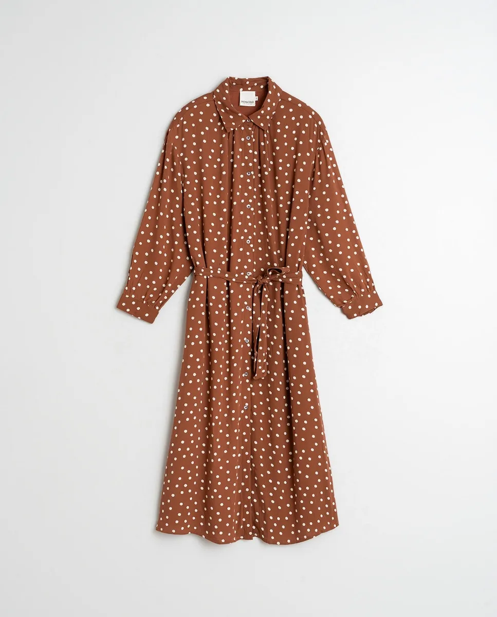 Оверсайз рубашка-платье с отложным воротником и рукавами-фонариками с манжетами и застежкой на пуговицы, с передней пуговичной застежкой и скрытыми боковыми карманами, слегка опущенные плечи, легкая вискозная ткань с рисунком в горох, свободный оверсайз крой.