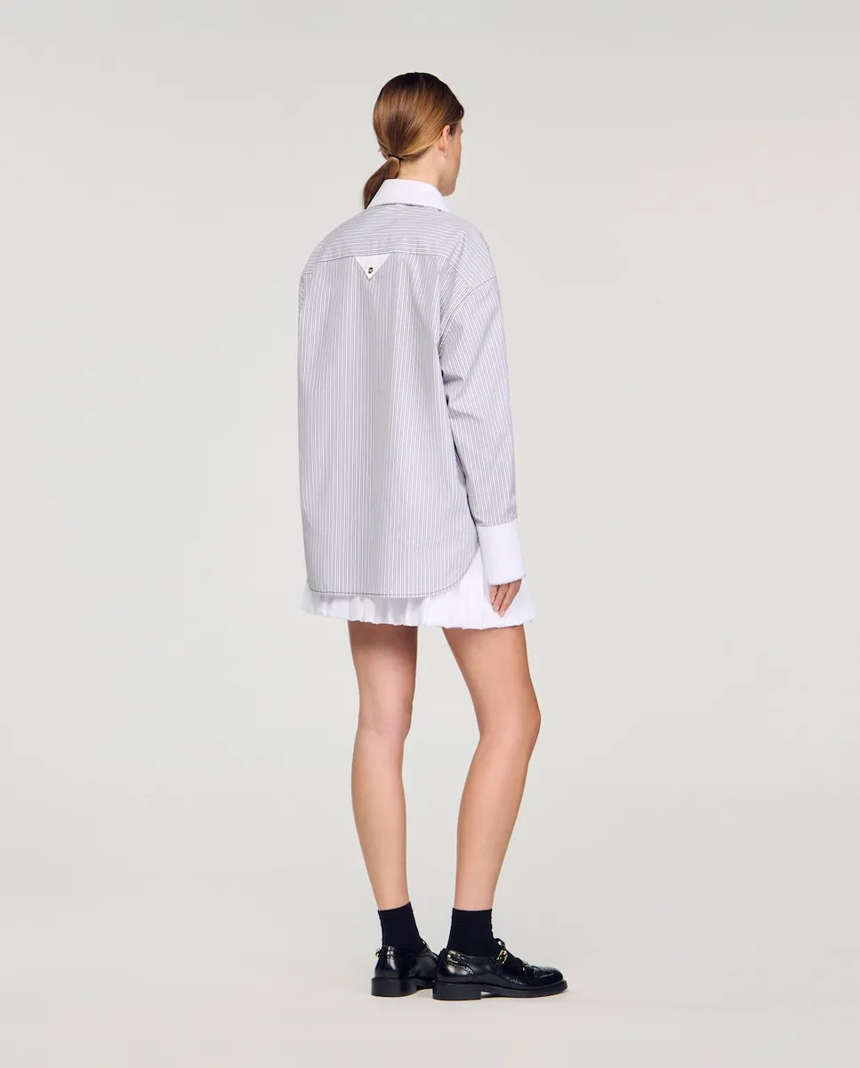 Рубашка оверсайз в полоску с контрастным V-образным вырезом, длинными рукавами с контрастными манжетами на пуговицах, застежкой на пуговицы, накладным карманом на груди и треугольной застежкой на спине. Женская рубашка Sandro в полоску. Контрастный V-образный вырез. Длинные рукава с контрастными пуговицами на манжетах. Застежка на пуговицы. Накладной карман на груди. Треугольная застежка на спине. Асимметричный закругленный низ.