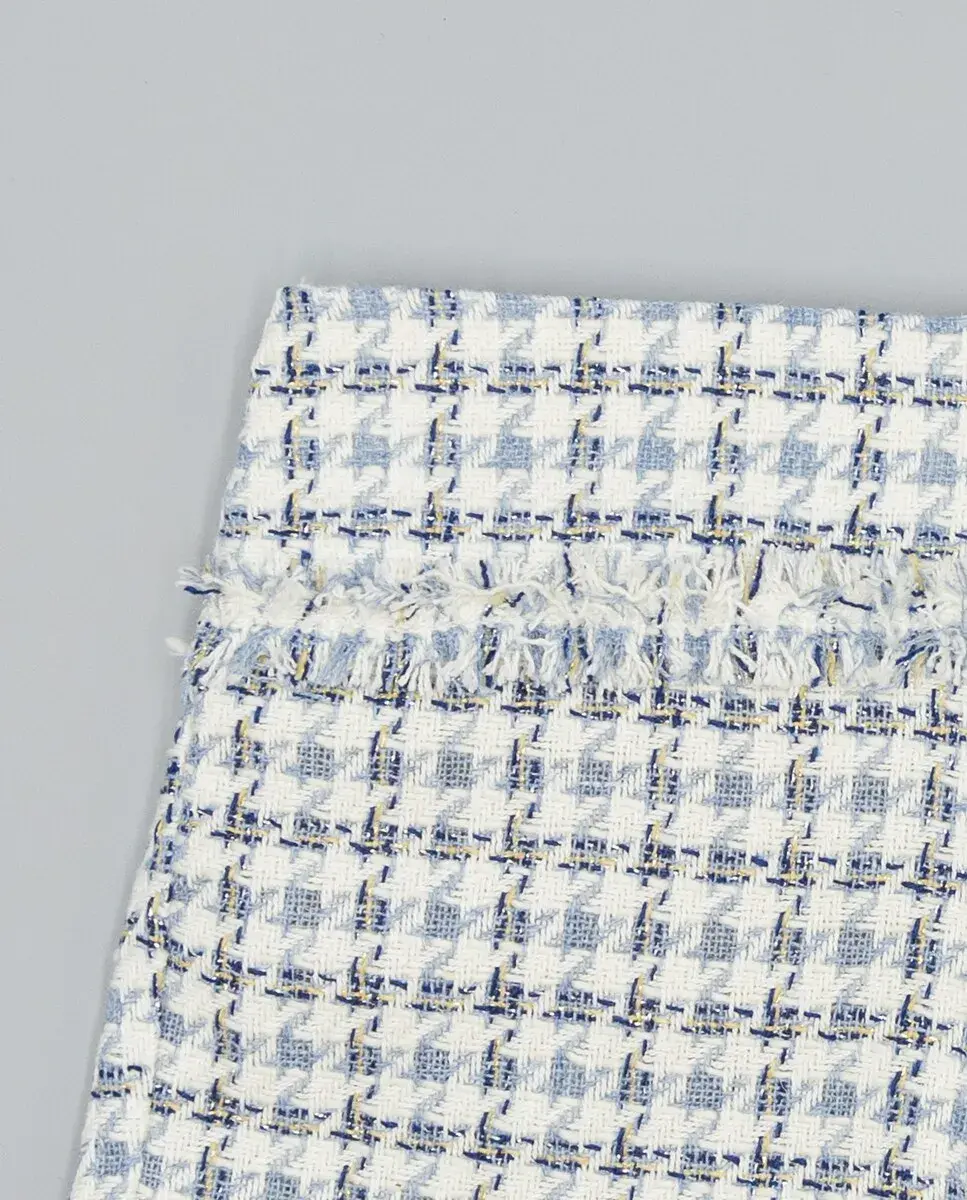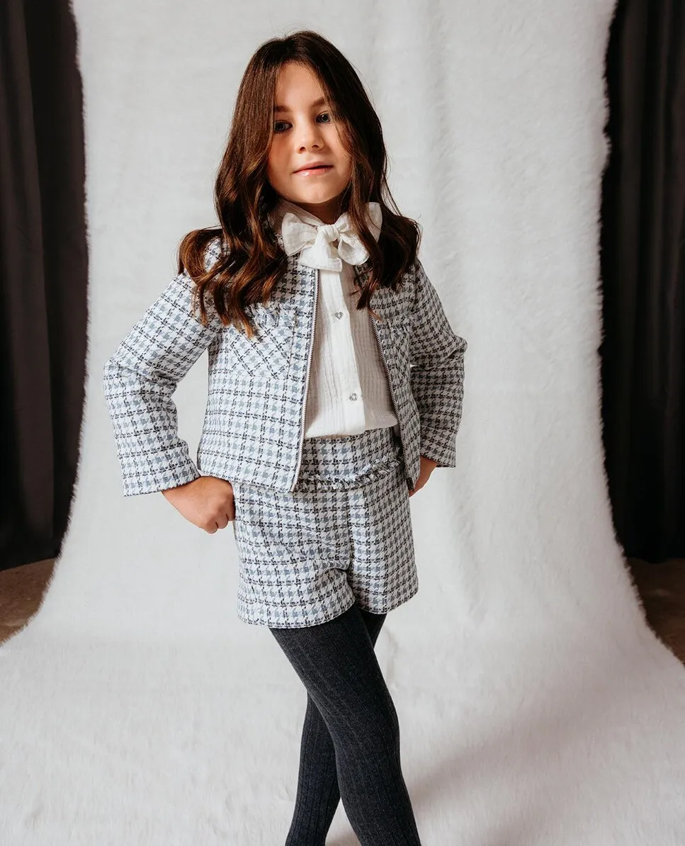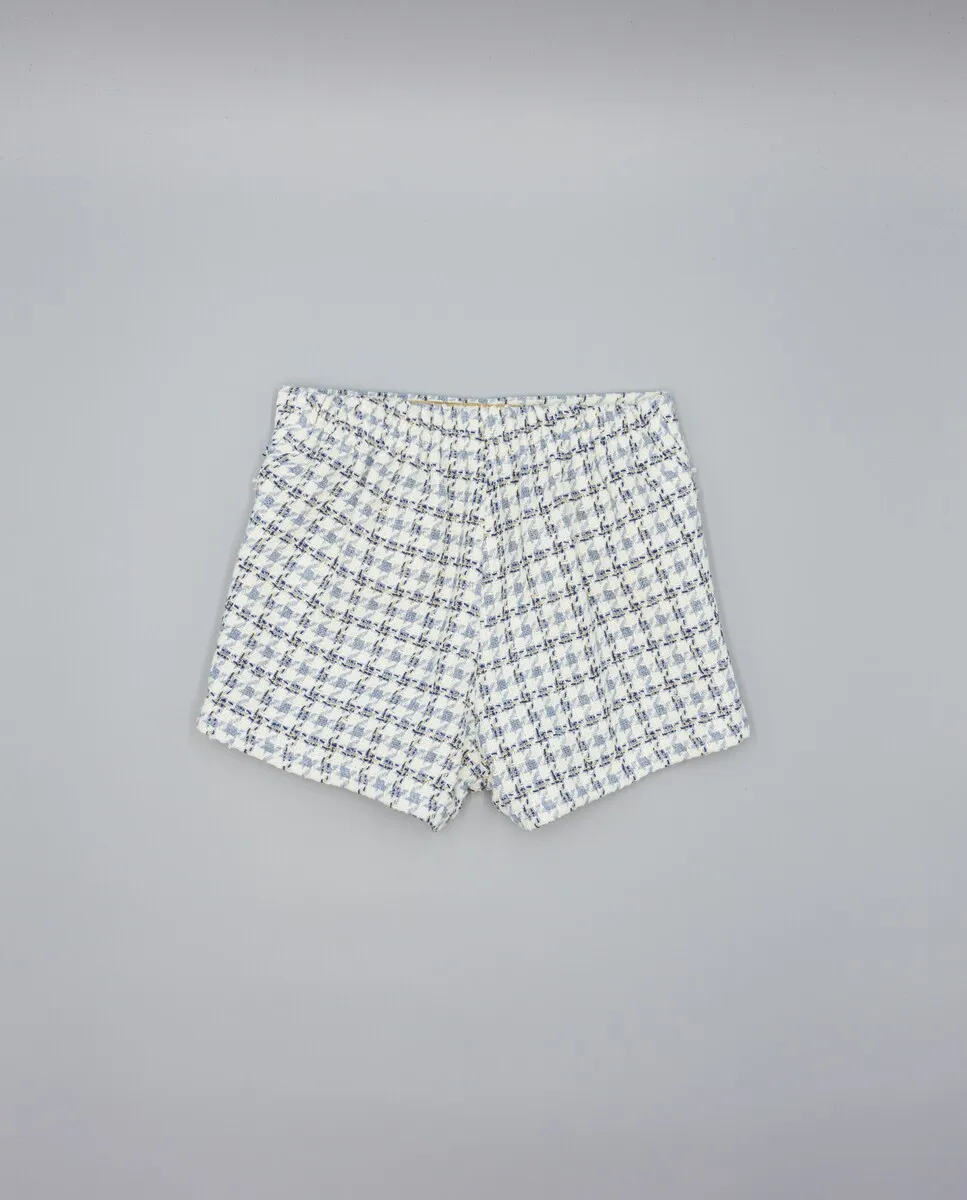 Шорты синего цвета из структурированной ткани с клеткой бежевого, верблюжьего и синего цветов, идеально подходят для девочек. Посадка на бедрах с рваным воланом по срезу придает современный и удобный вид. Резинка на спинке для лучшей посадки. Доступны размеры от 2 до 16 лет.
