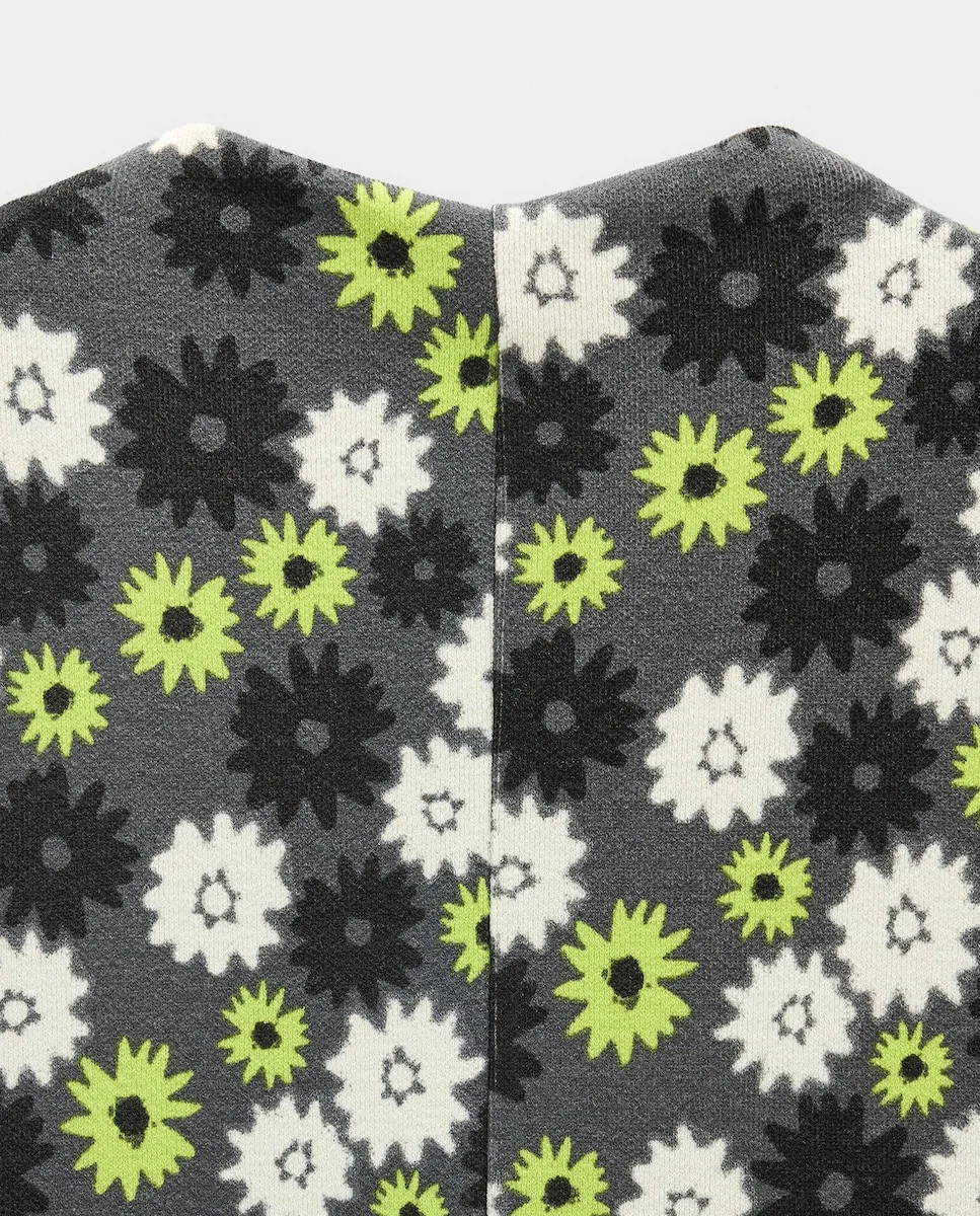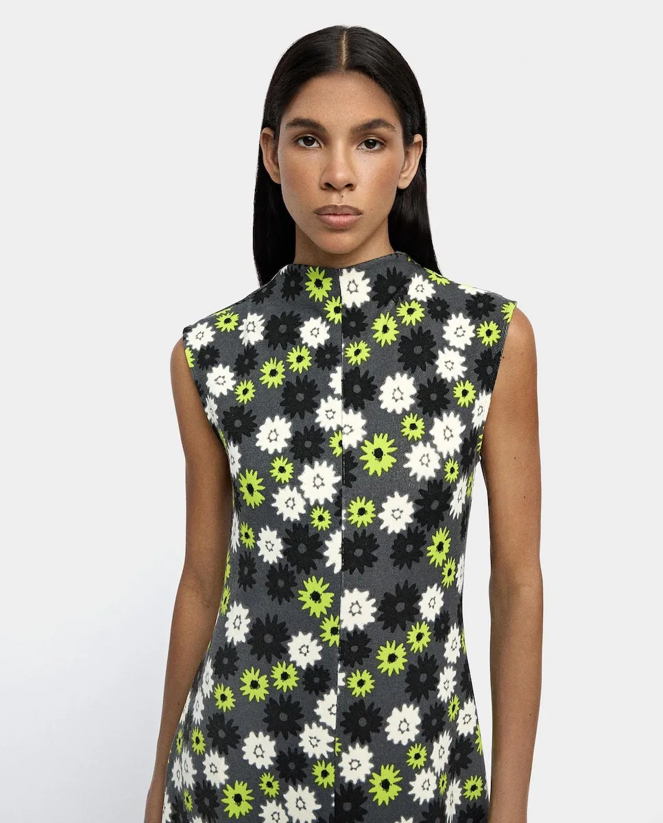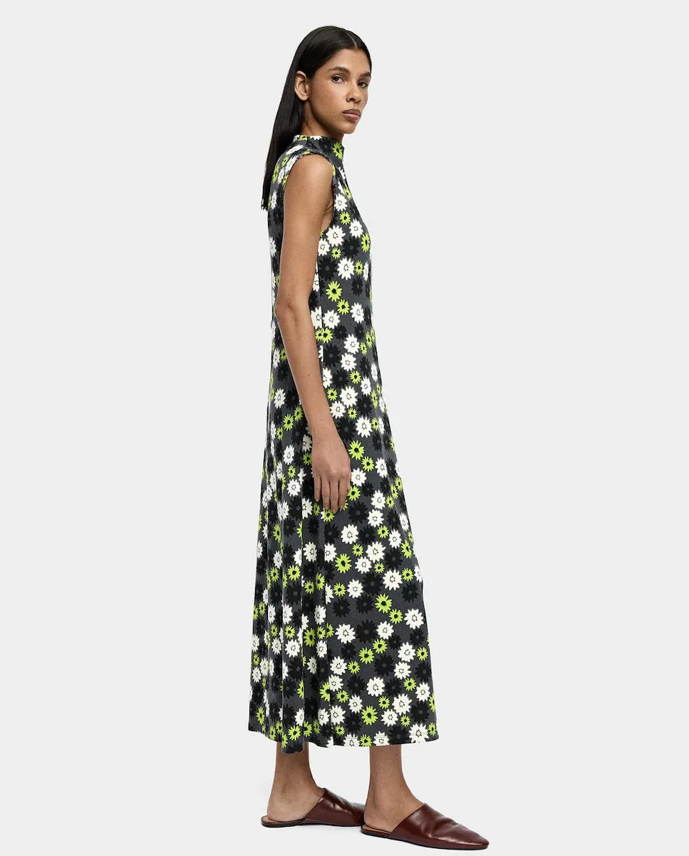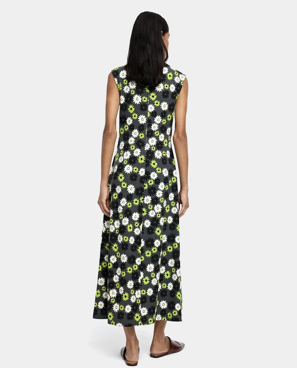 Длинное платье с цветочным принтом. Легкий расклешенный силуэт. Круглый вырез. Без рукавов. Застежка-молния на спине. Акцентная средняя шов. Модель ростом 1,78 м и носит размер S.