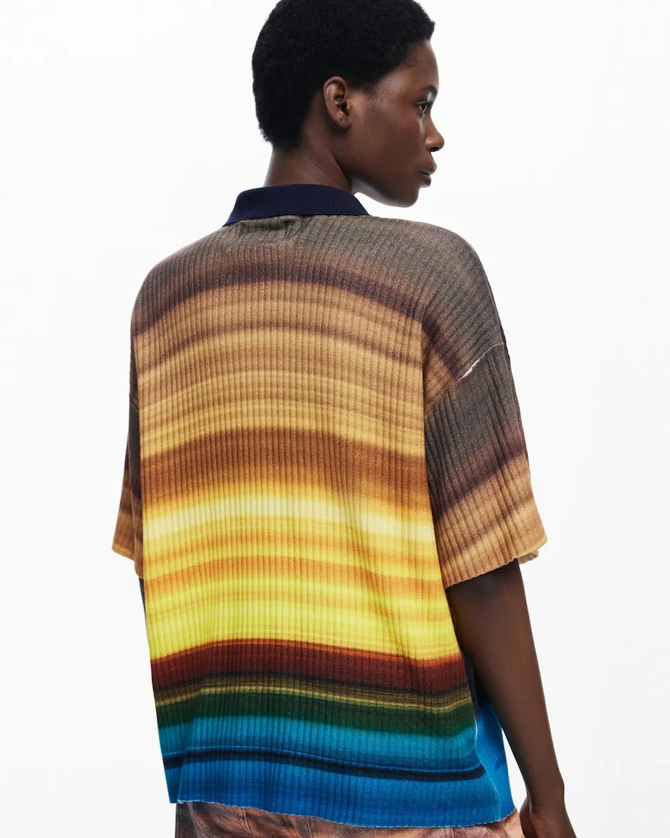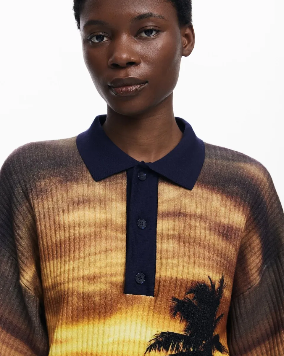 Платье в стиле поло оверсайз, выполненное в рубчик, с принтом, вдохновленным закатом, и деталями с дельфинами внизу. Крой: обычный. Длина: короткая. Воротник: рубашечный. Рукав: короткий. Застежка: на пуговицы. Принт с вдохновением от заката. Botter.
