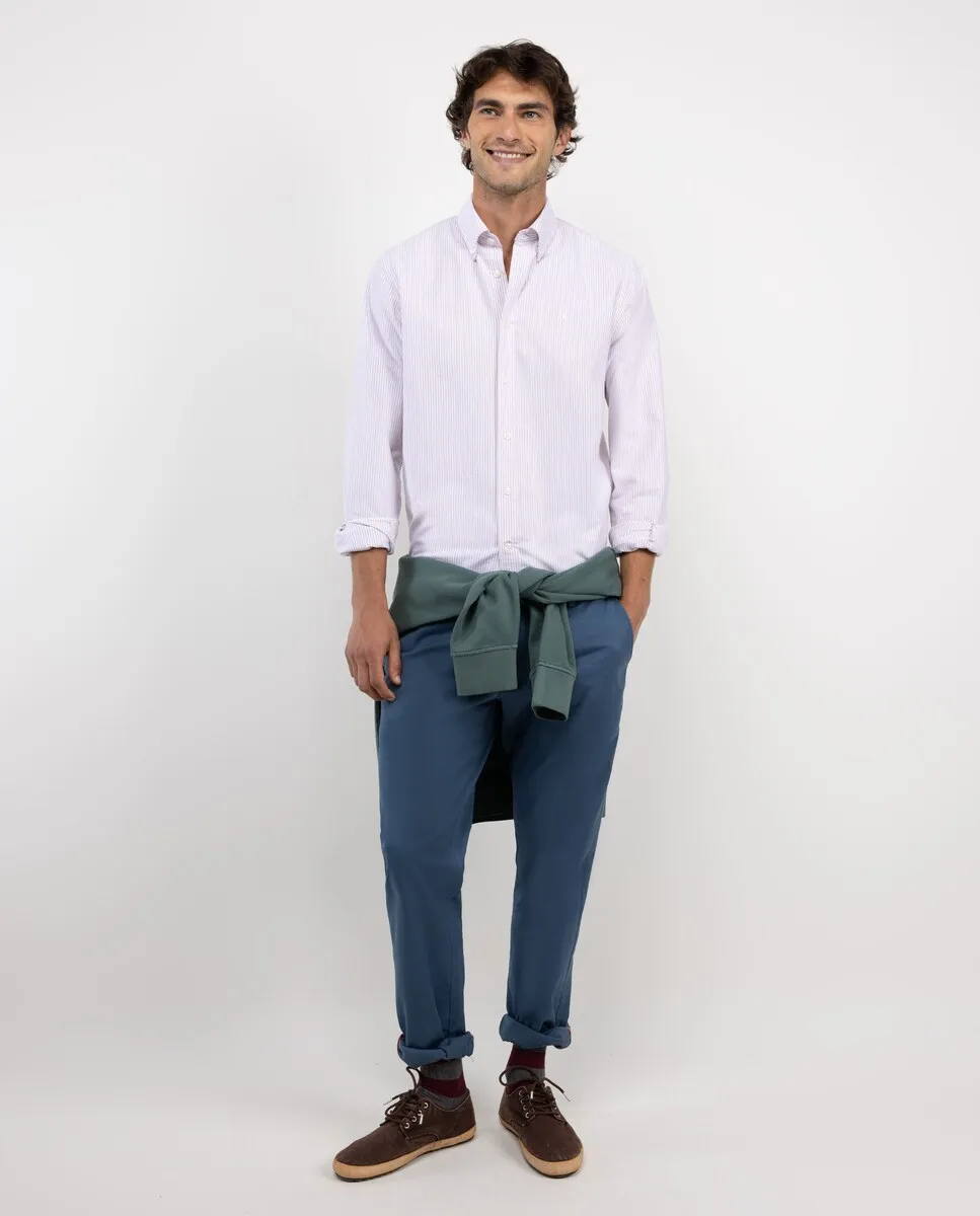 Мужская рубашка с полосками Oxford, выполненная из ткани, состоящей из 93% хлопка и 7% переработанного хлопка. Прямой крой Regular Fit, воротник с пуговицами и застежка на пуговицы. Длинные рукава с простыми манжетами и вышитый логотип на груди. Внутренние детали с контрастной отделкой в виде галстуковой ленты.