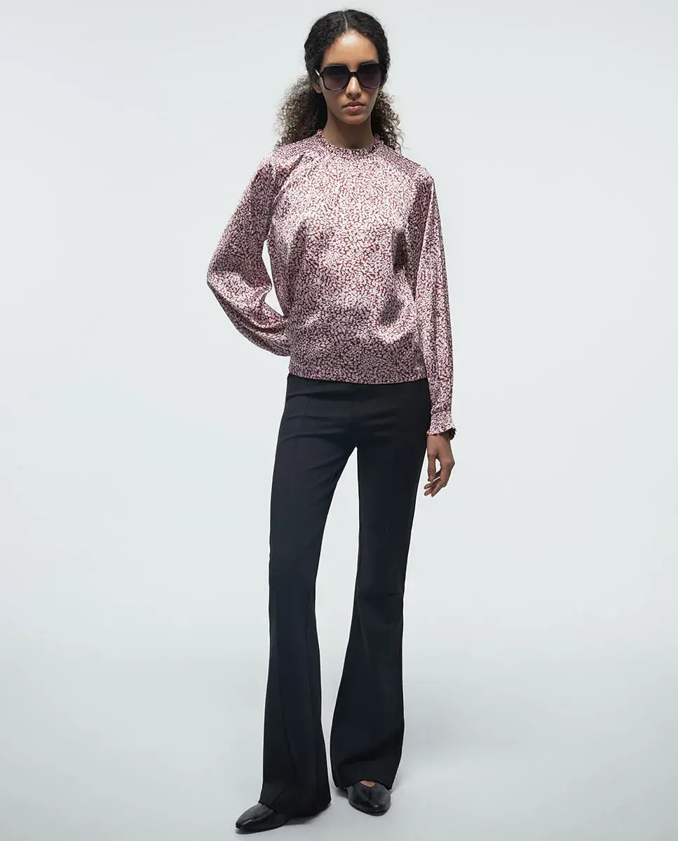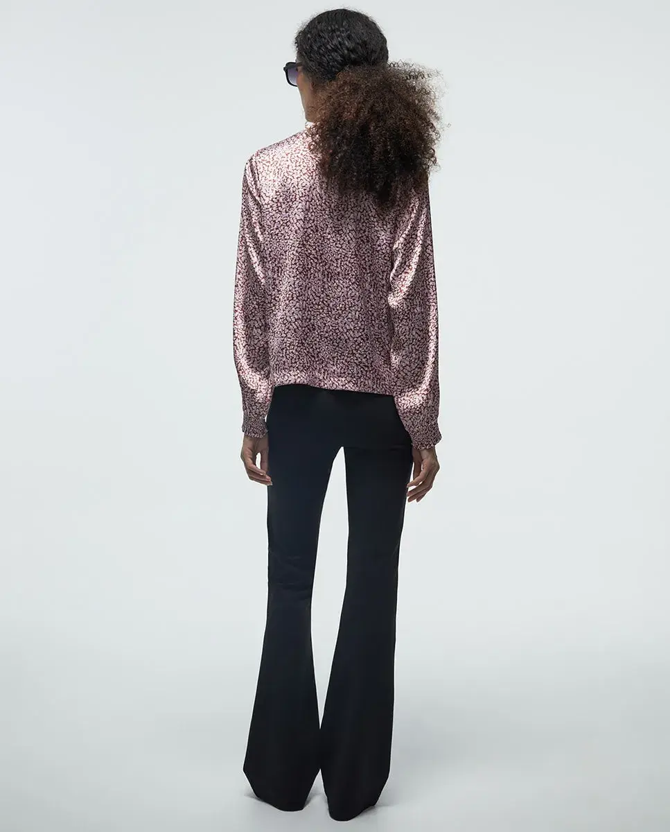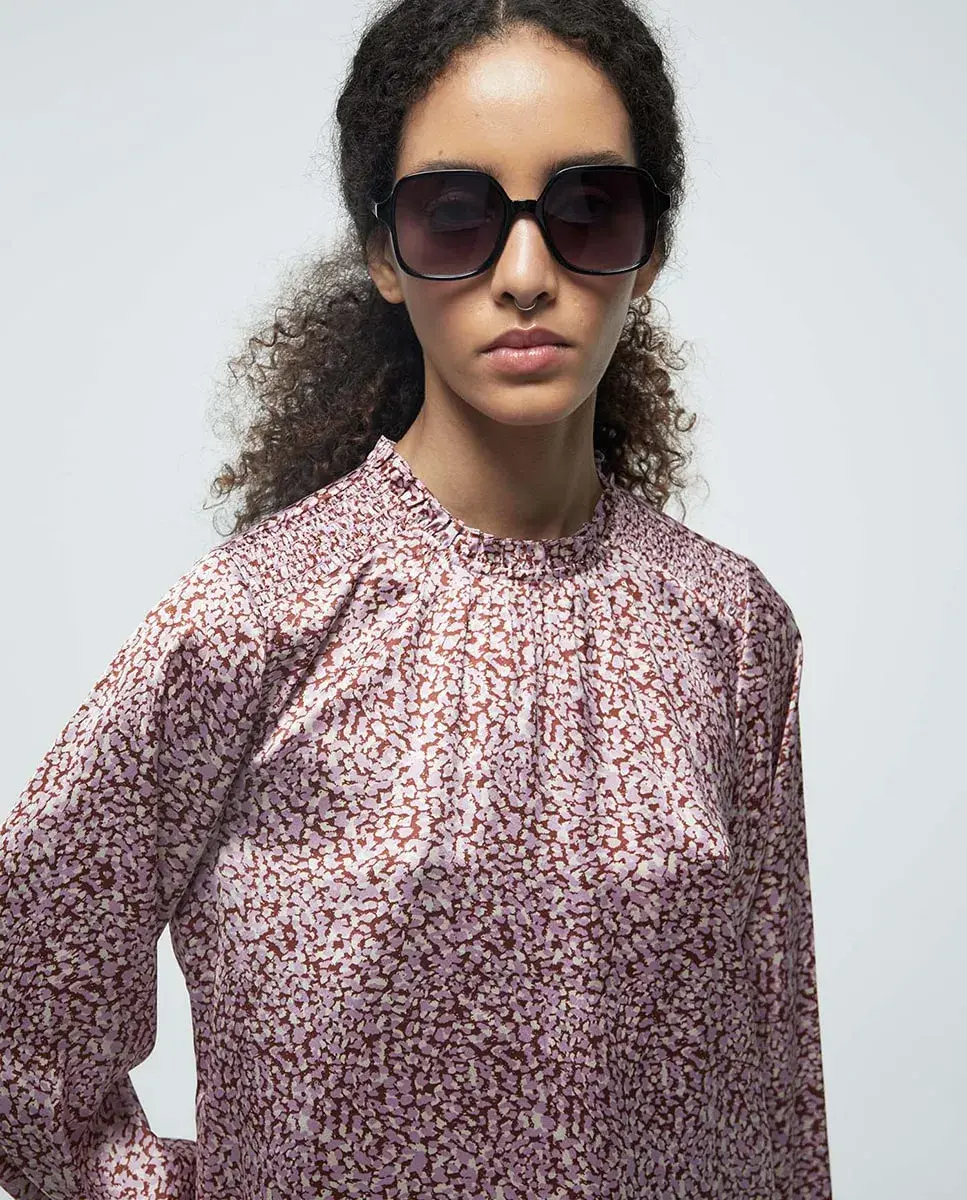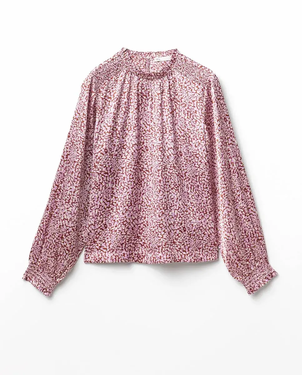 Легкая блуза с длинными рукавами и воротником-скрипкой, с деталью сборки. Застежка сзади на каплю с кнопкой.