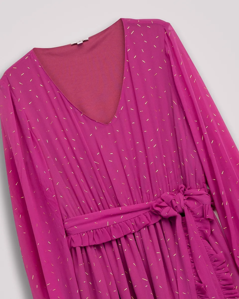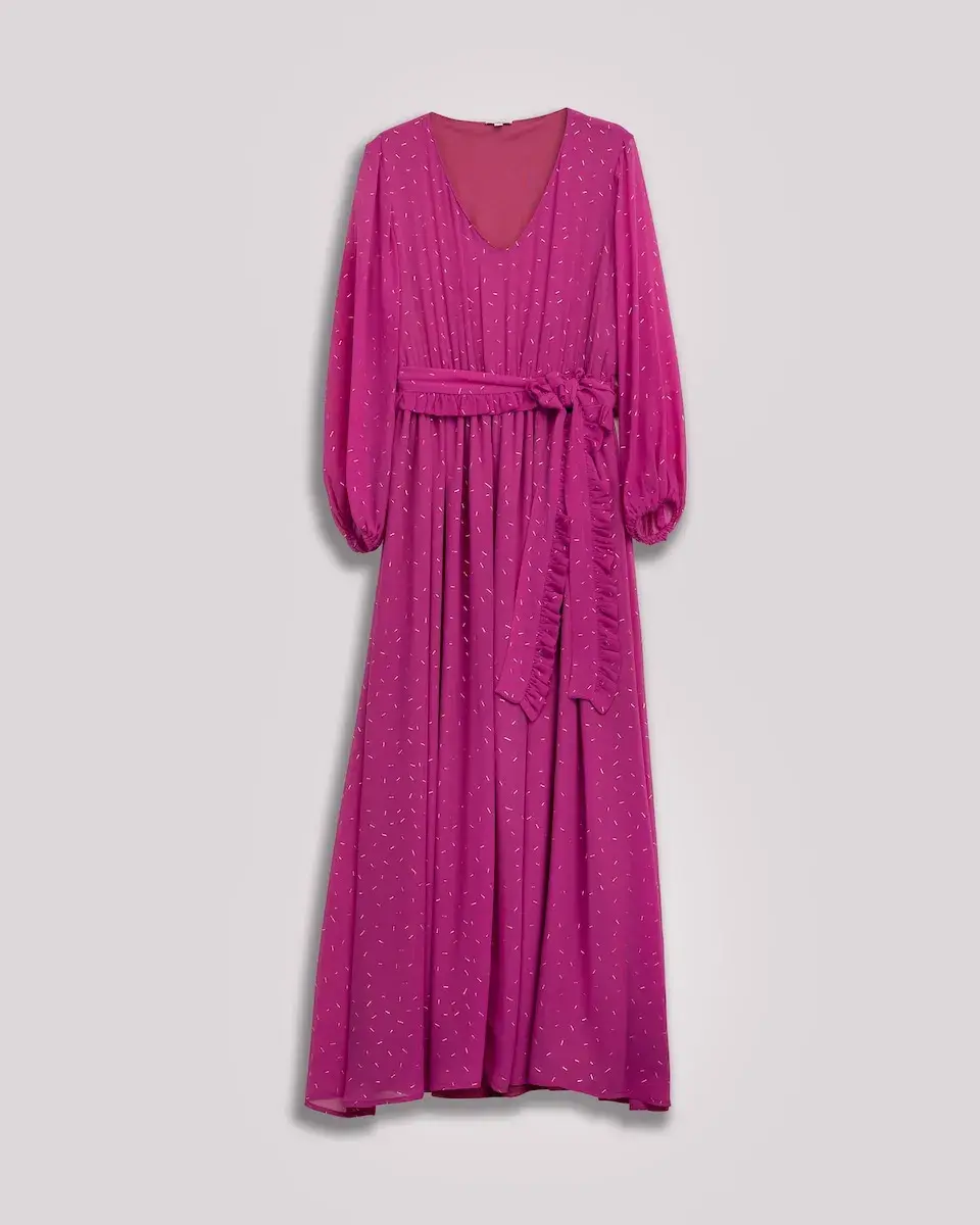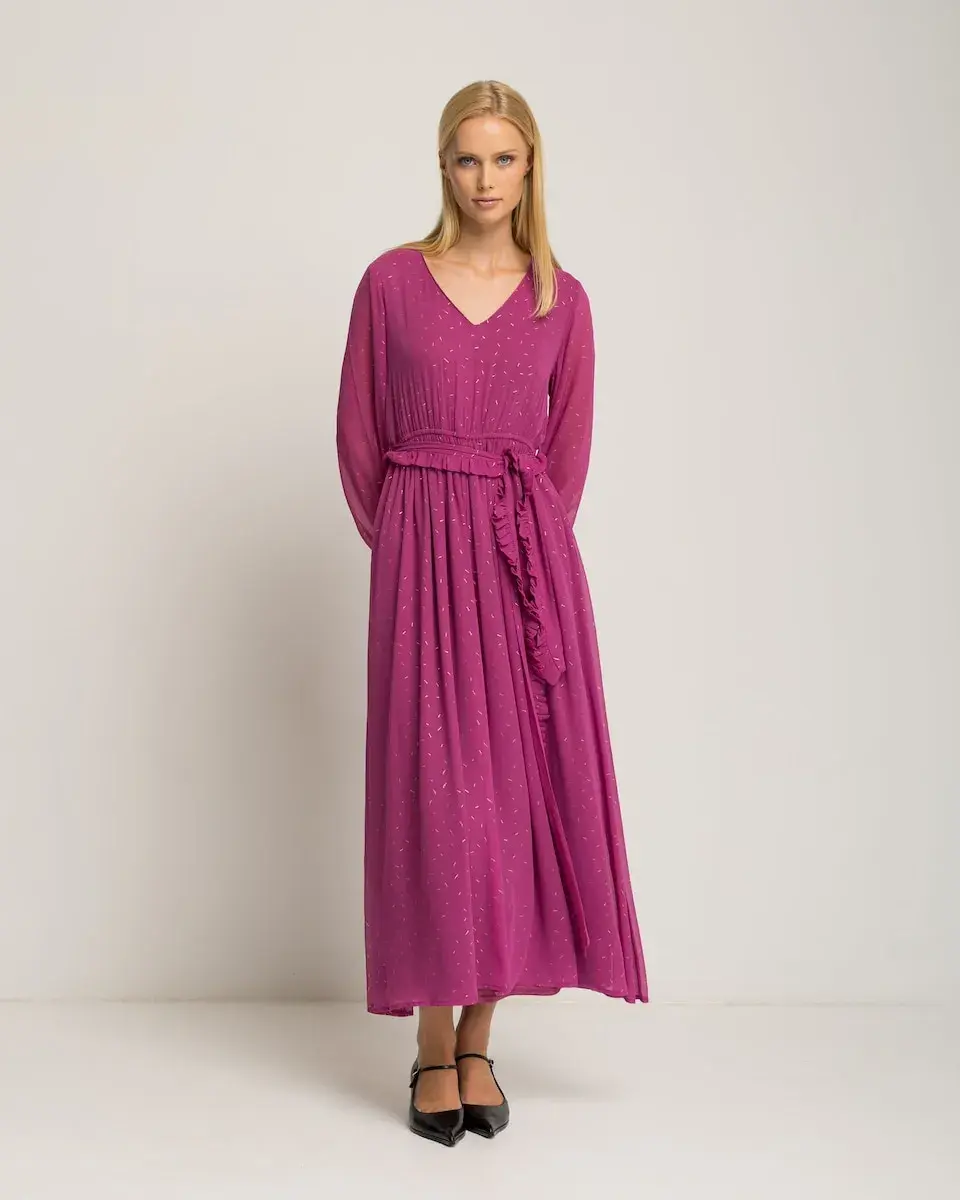 Длинное платье из газового материала цвета бугенвиллии с нежным золотым узором. Имеет V-образный вырез, собранную талию и длинные воздушные рукава. Боковой пояс с воланом добавляет женственный и легкий акцент. Идеально подходит для элегантного образа с движением.