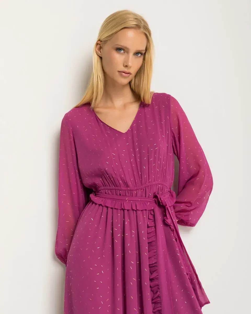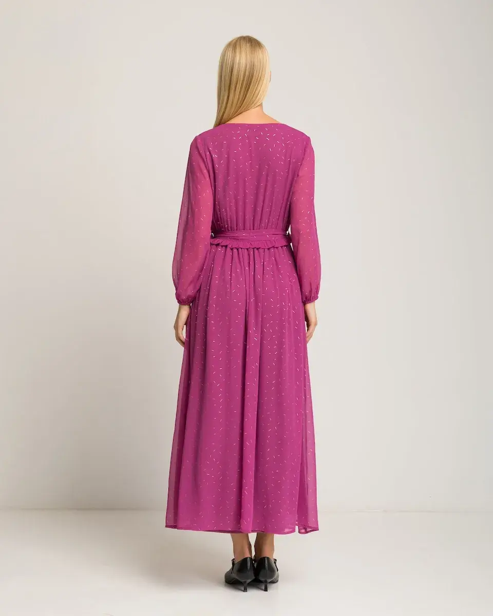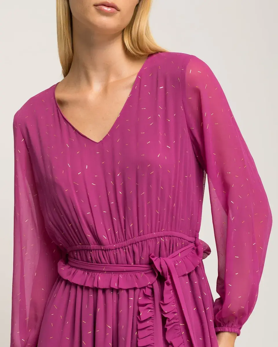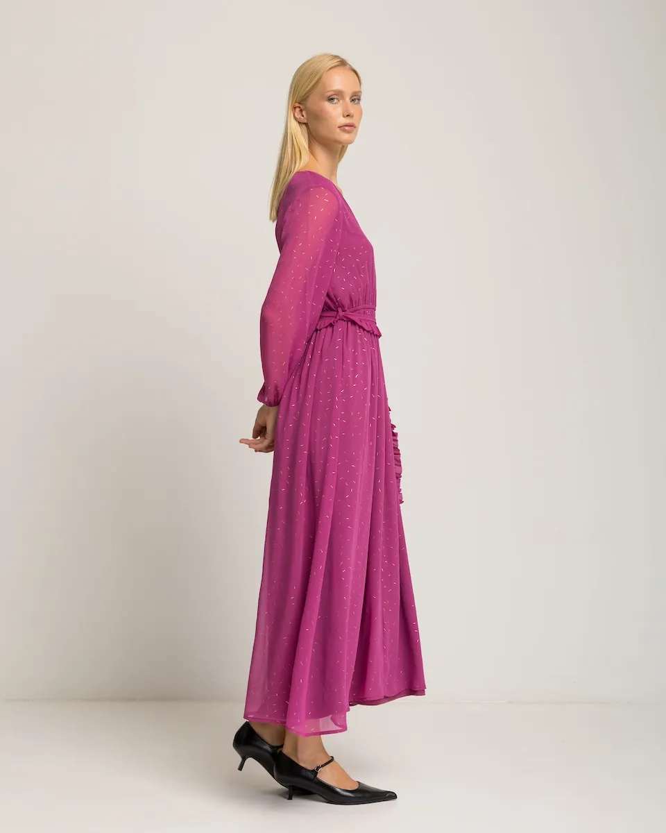 Длинное платье из газового материала цвета бугенвиллии с нежным золотым узором. Имеет V-образный вырез, собранную талию и длинные воздушные рукава. Боковой пояс с воланом добавляет женственный и легкий акцент. Идеально подходит для элегантного образа с движением.