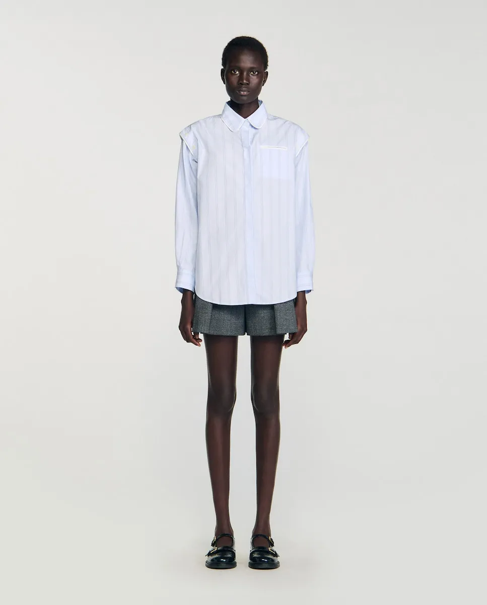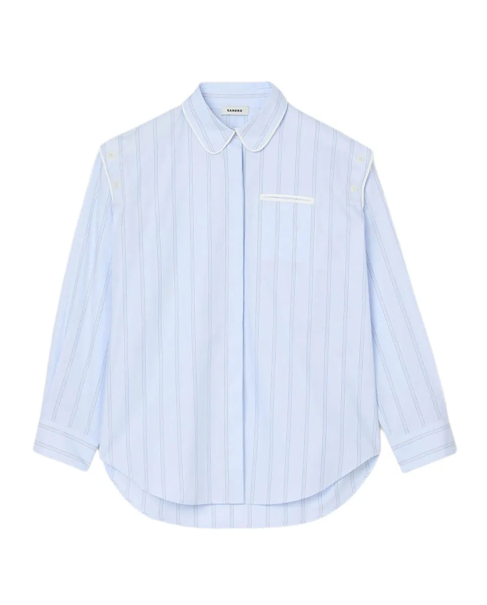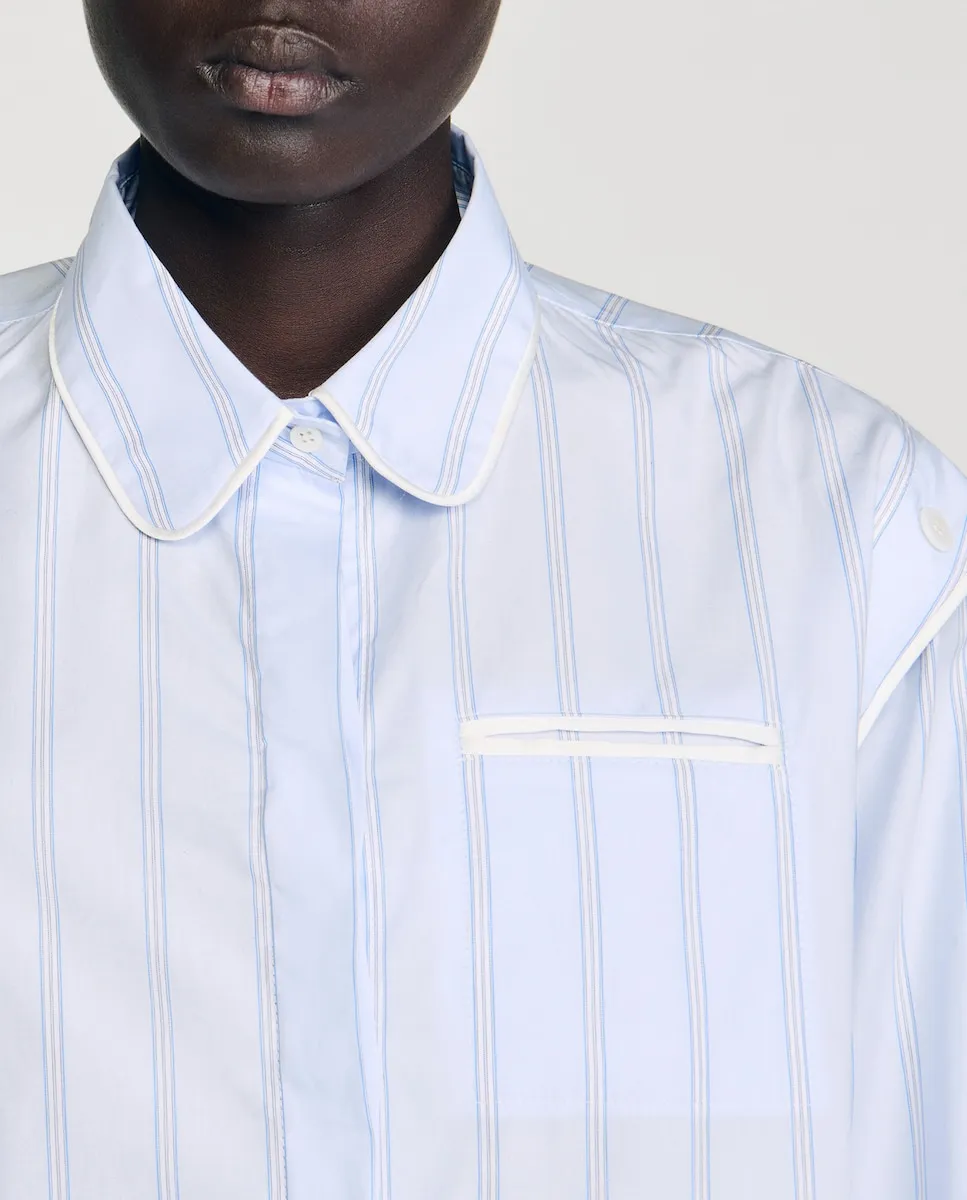 Полосатая рубашка с контрастной отделкой, слегка закругленным воротником и скрытой планкой с пуговицами, а также пуговицами на плечах, позволяющими открыть плечи. Женская рубашка Sandro. Слегка закругленный воротник. Пуговицы на плечах. Скрытая планка с пуговицами. Карман с окантовкой в контрастном цвете. Длинные рукава с застегивающимися манжетами. Асимметричный закругленный низ.