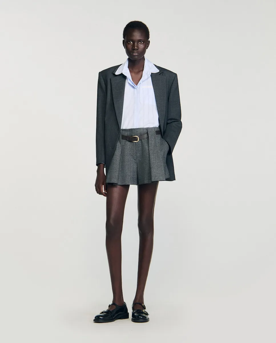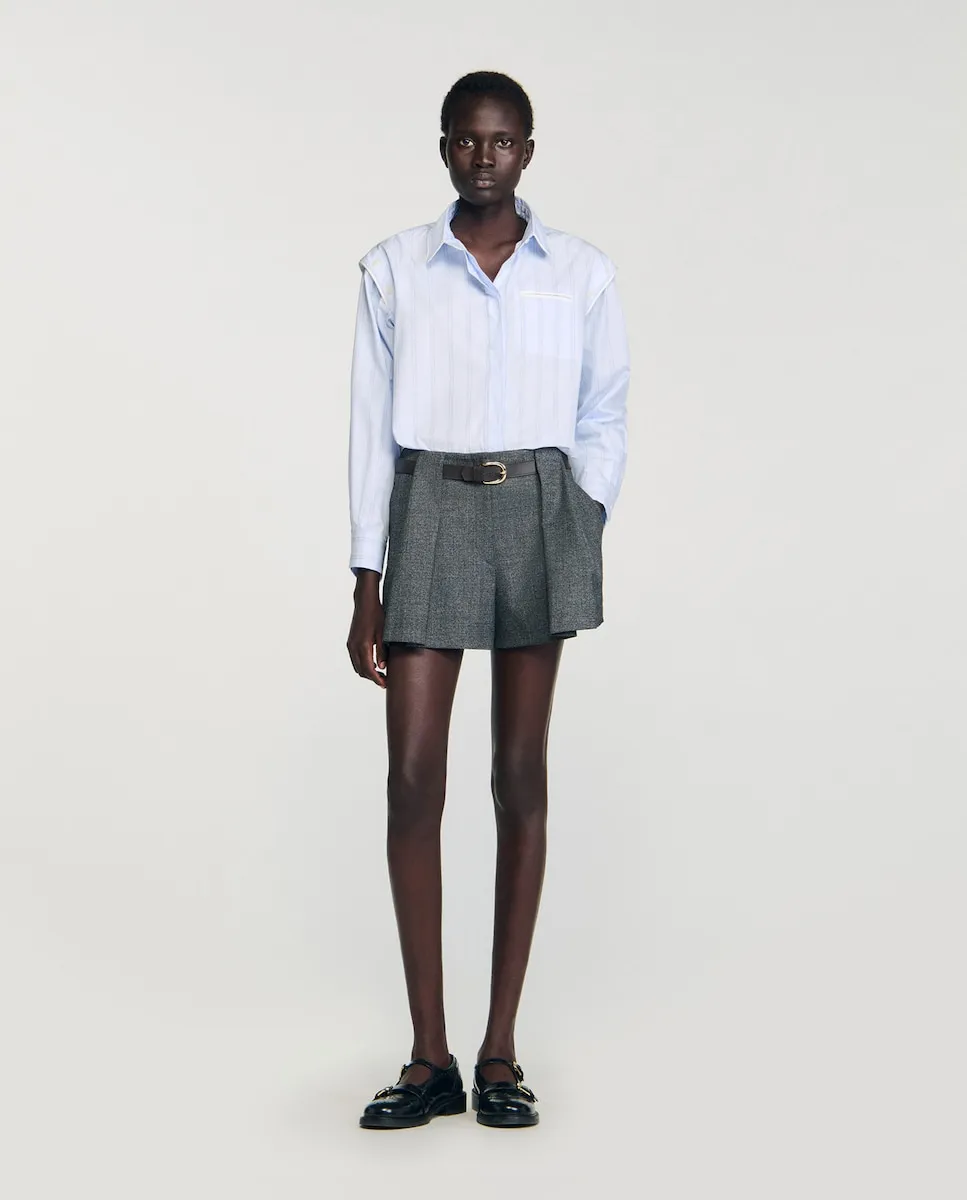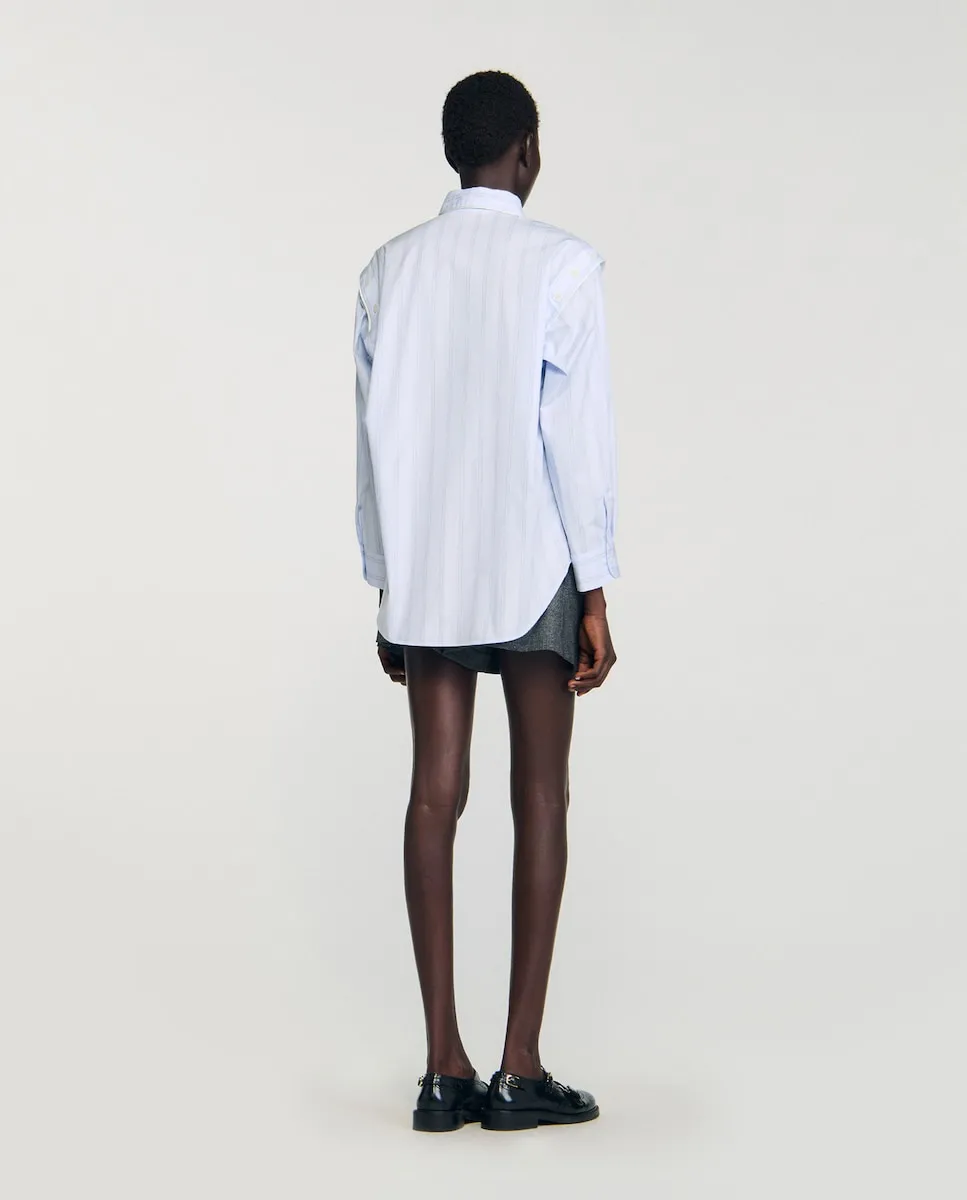 Полосатая рубашка с контрастной отделкой, слегка закругленным воротником и скрытой планкой с пуговицами, а также пуговицами на плечах, позволяющими открыть плечи. Женская рубашка Sandro. Слегка закругленный воротник. Пуговицы на плечах. Скрытая планка с пуговицами. Карман с окантовкой в контрастном цвете. Длинные рукава с застегивающимися манжетами. Асимметричный закругленный низ.