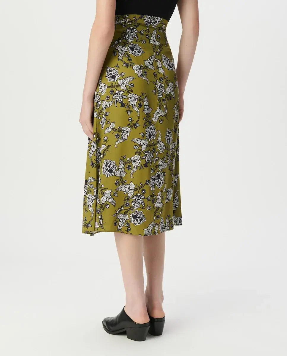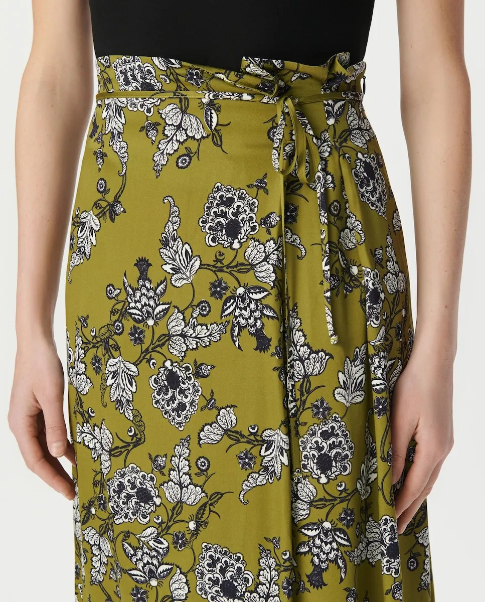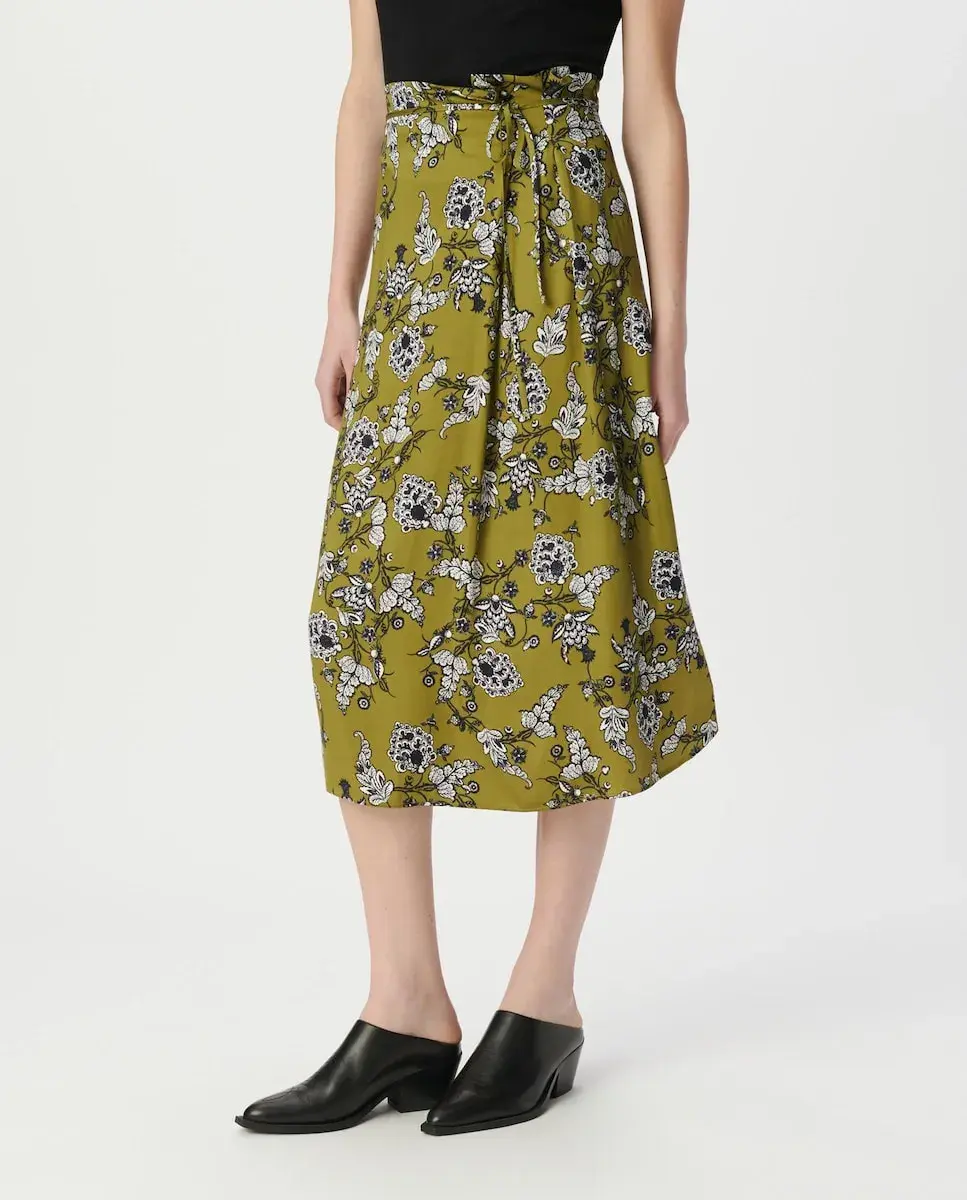 Женская юбка из вискозы среднего зеленого цвета Эксклюзивный цветочный принт IKKS Складки «коробочка» спереди, завязки для застежки спереди Скрытая молния на боку Расклешенный и струящийся крой, длина миди