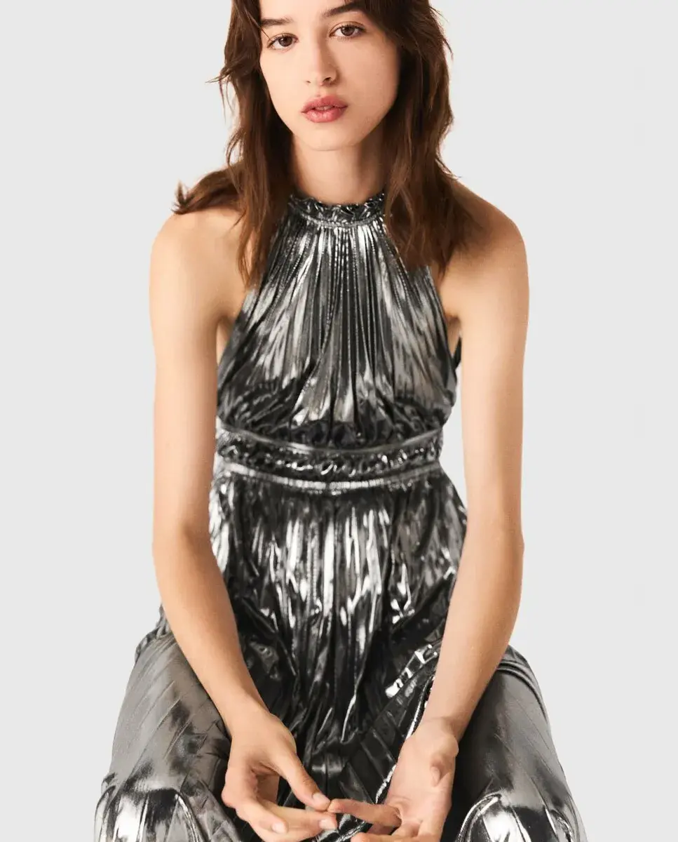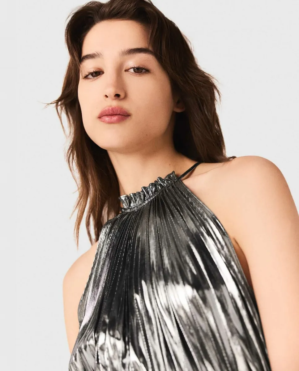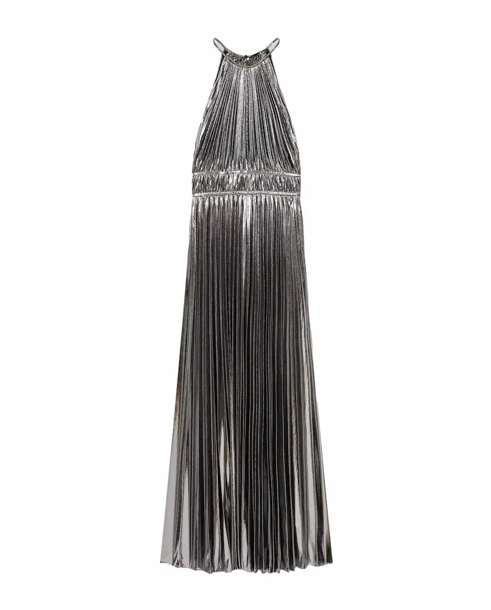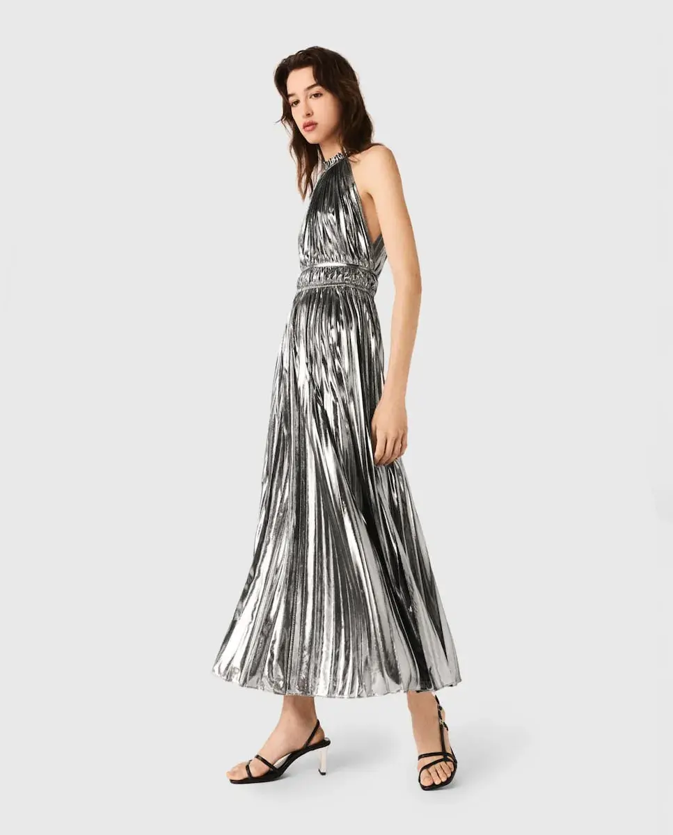 Длинное струящееся платье из ламинированной ткани с плиссировкой. Собранный лиф с воротником-халтер. Приталенная талия с поясом для завязывания на спине. Разрез на спине с застежкой на пуговицу. Игра света и движения в этом платье из ламинированной ткани просто великолепна. Струящаяся и структурированная плиссировка ловит каждый отблеск, подчеркивая стройный силуэт. Собранный лиф-халтер элегантно открывает плечи, а талия облегается поясом, который завязывается на спине, обеспечивая идеальную посадку. Носите его с минималистичными босоножками на каблуке и сочетайте с пиджаком, чтобы согреть плечи.