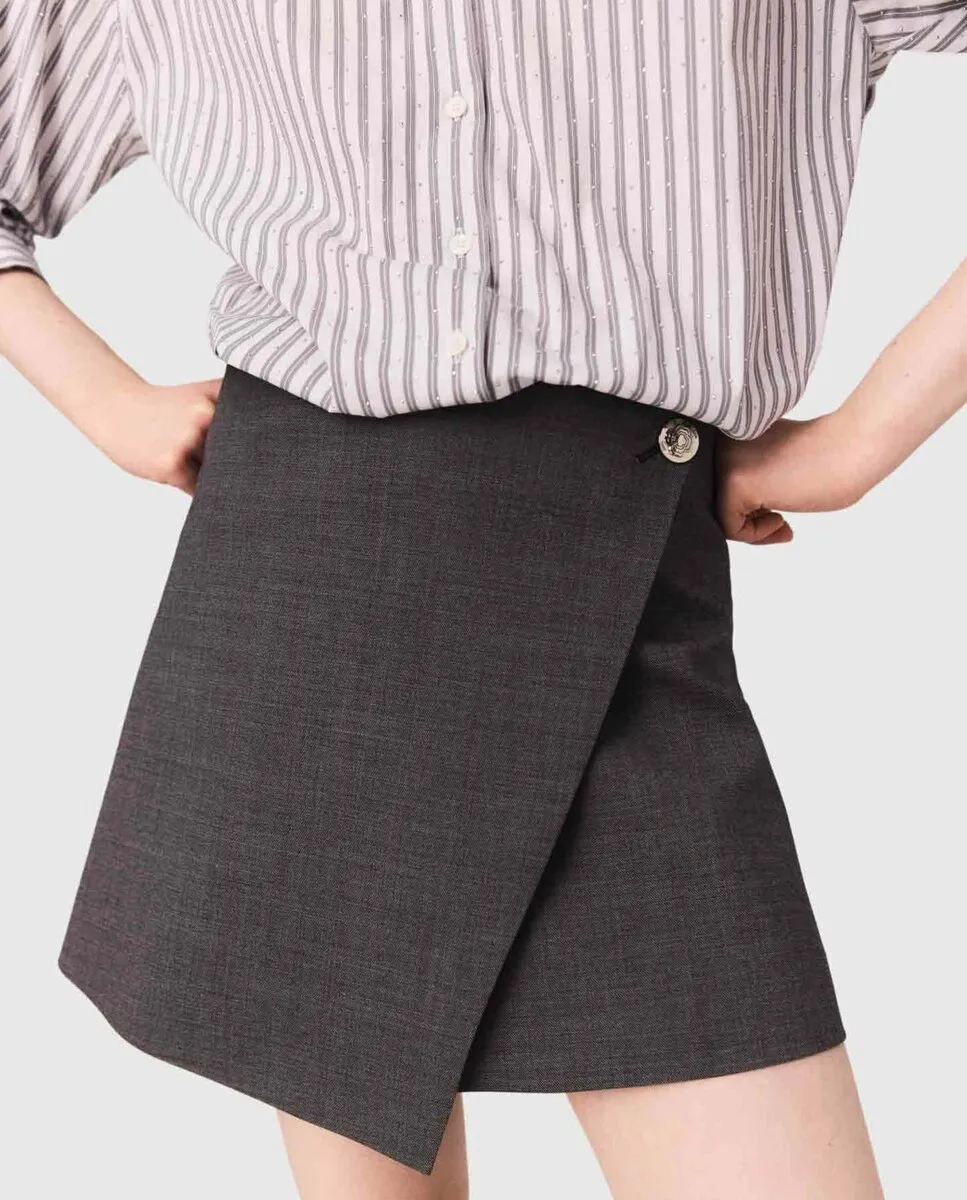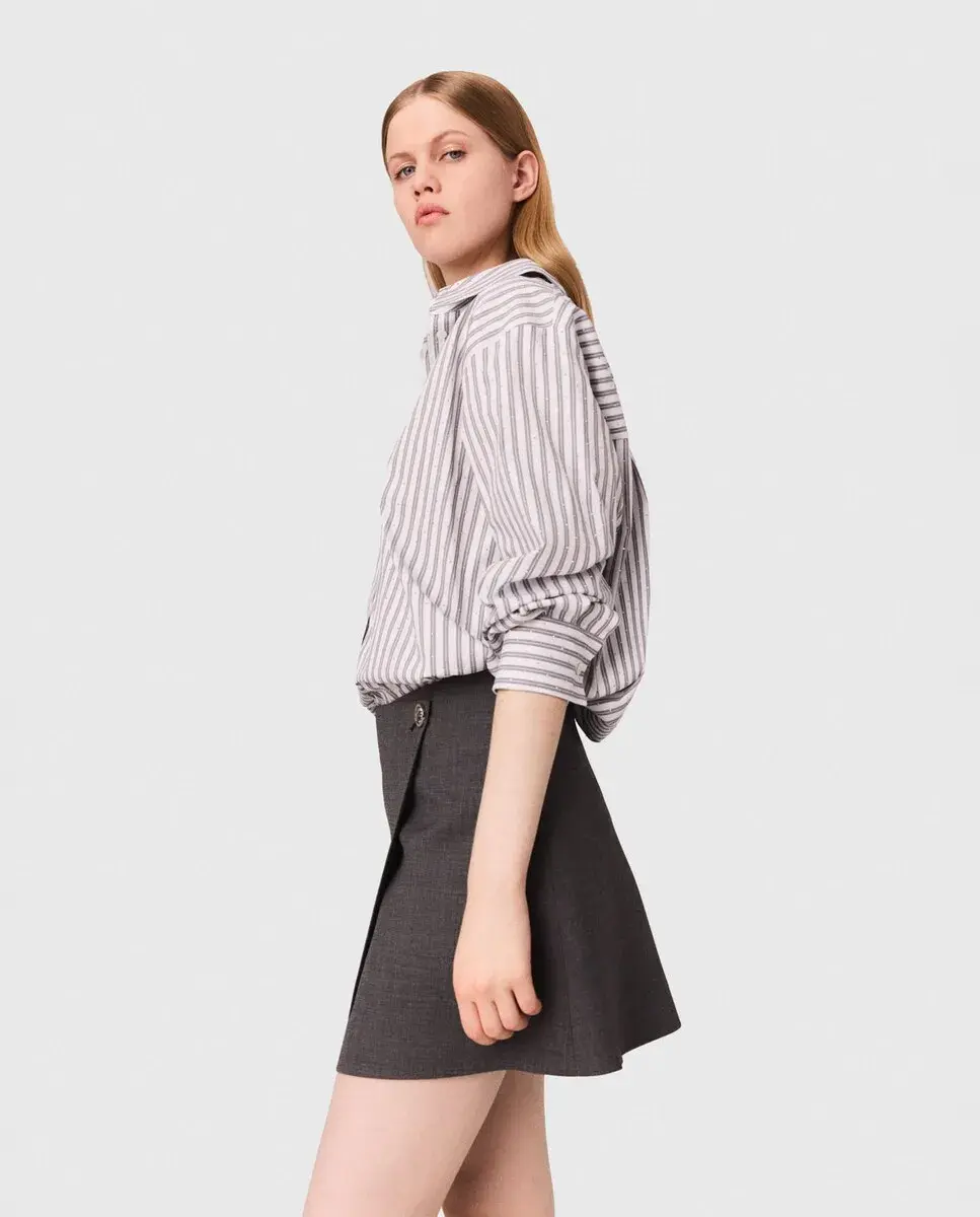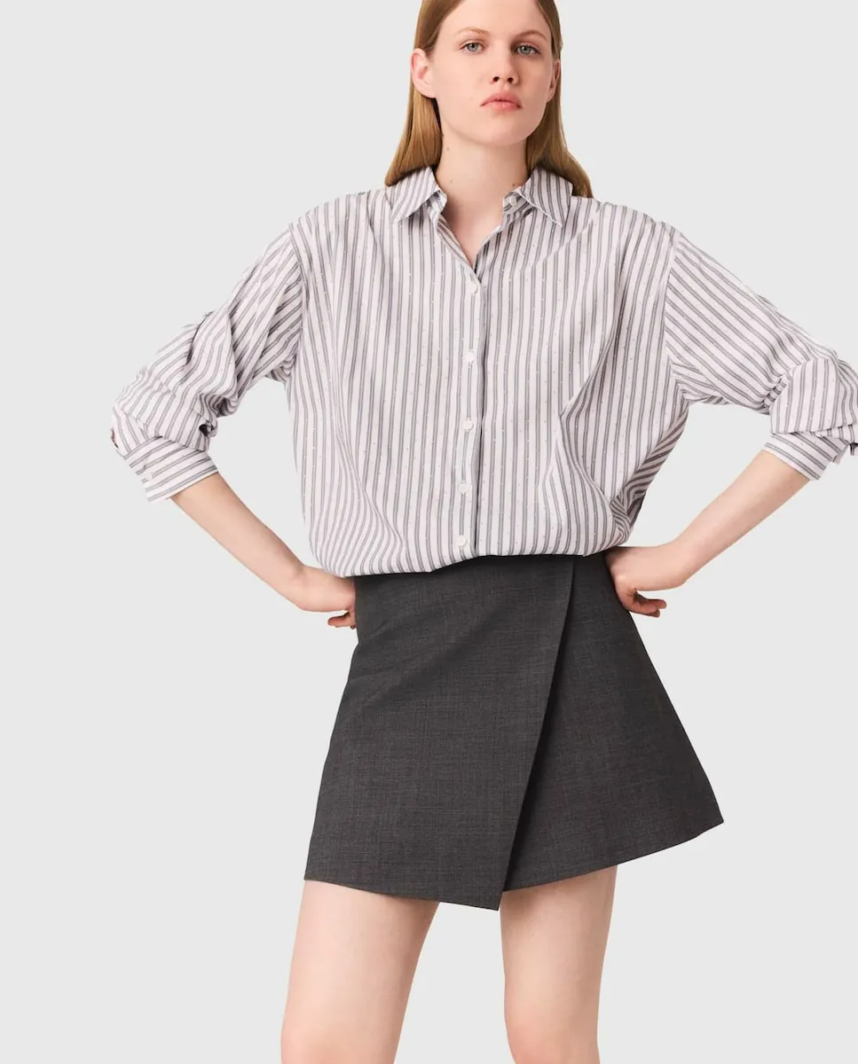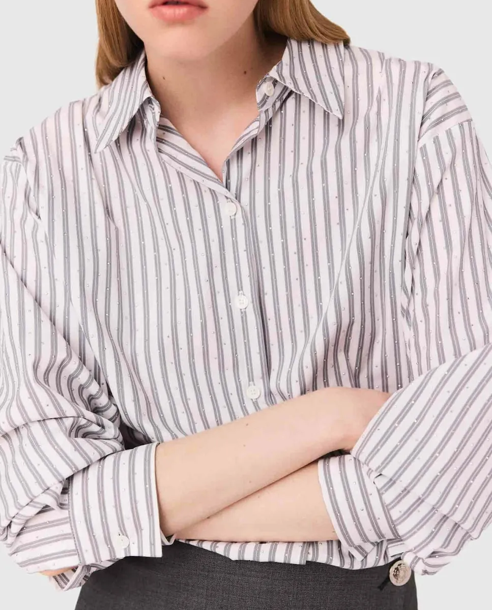 Платье-рубашка 2 в 1 с полосками из страз. Воротник-рубашка и длинные рукава с манжетами на пуговицах. Съемная юбка с асимметричной деталью и пуговицей Clover. Коллекция исследует контрасты между светом и структурой, предлагая гибридные изделия, созданные для игры со стилями. Это платье-рубашка с полосками из страз выделяется своей съемной юбкой с асимметричной деталью, подчеркнутой фирменной пуговицей Clover. Многофункциональная модель, разработанная для легкой смены образов. Можно носить как есть или раздельно, чтобы смело варьировать силуэты, а также сочетать с объемной сумкой и острыми туфлями на каблуке.