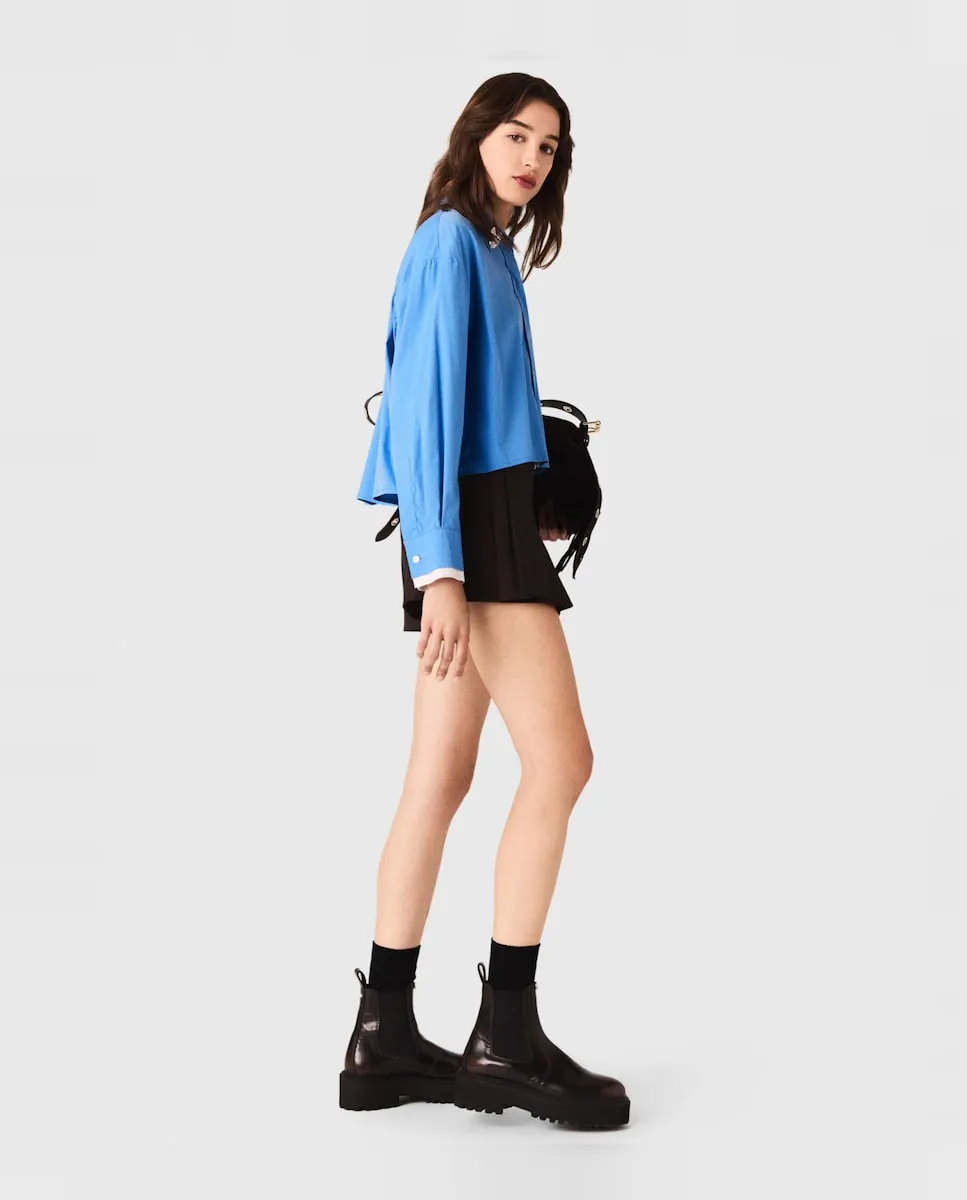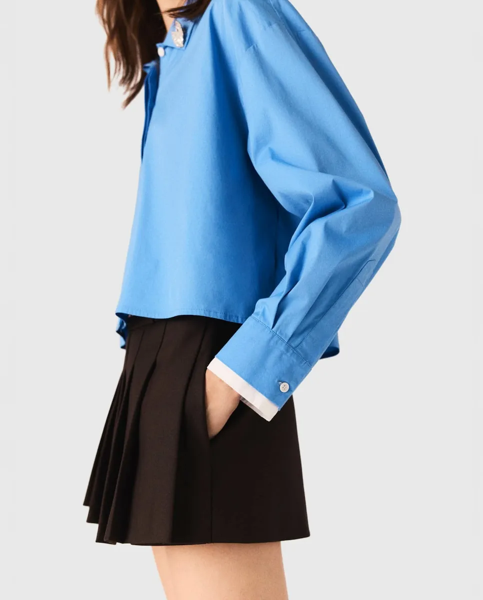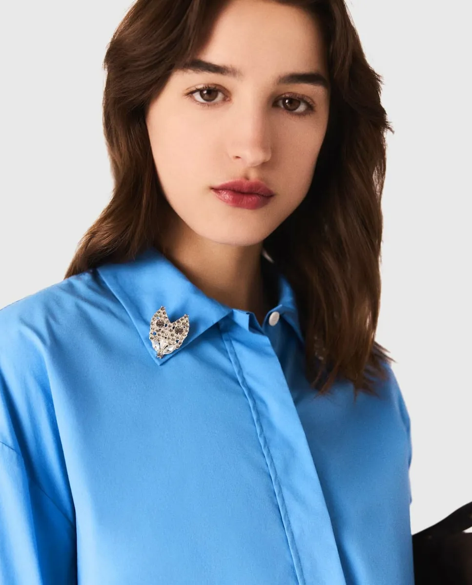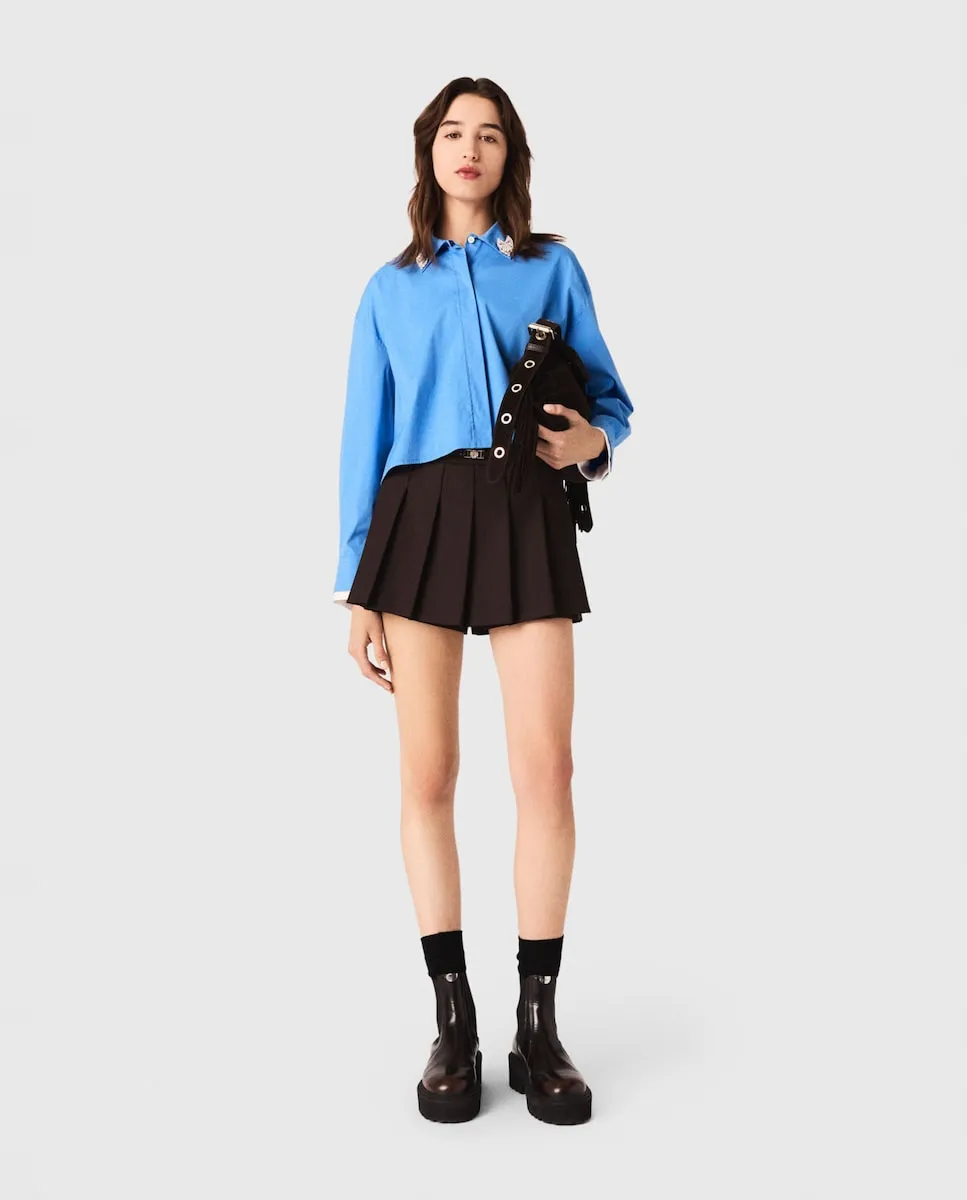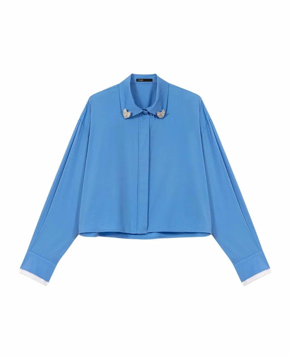 Короткая рубашка с воротником-стойкой. Съемные украшения с драгоценными камнями. Манжеты в контрастном цвете. Широкая складка на спинке. В этом сезоне Maje переосмысливает базовые элементы гардероба со стилем, добавляя изысканные детали и совершенствуя крои. Немного дерзости придает этой короткой рубашке обновление в виде двух съемных украшений с драгоценными камнями, которые можно свободно перемещать на всех ее жакетах. С белыми контрастными манжетами и широкой складкой на спинке она сочетает структуру и оригинальность в преппи-стиле. Носите ее с плиссированной юбкой и высокими сапогами для дерзкого образа, добавьте фирменную сумку.