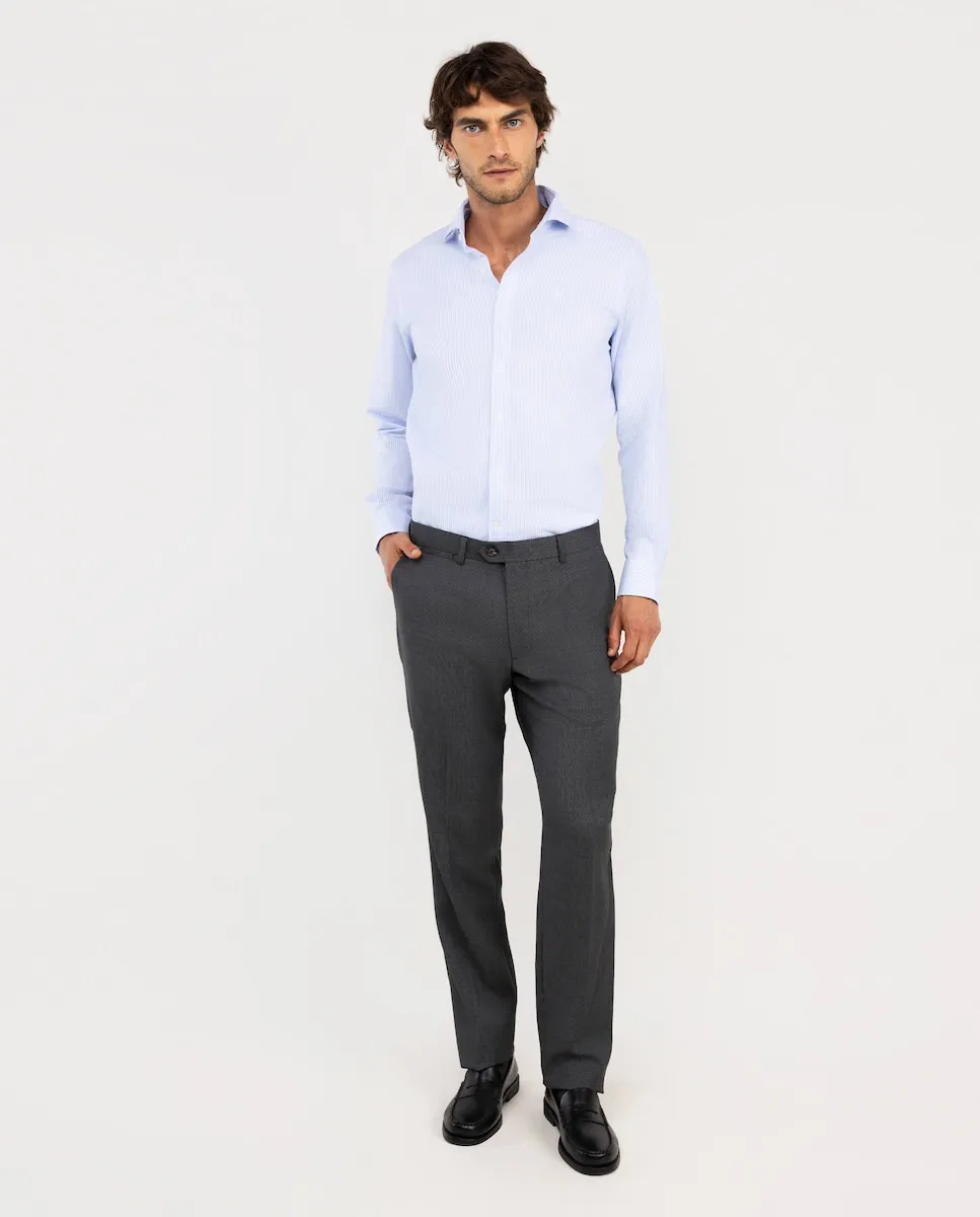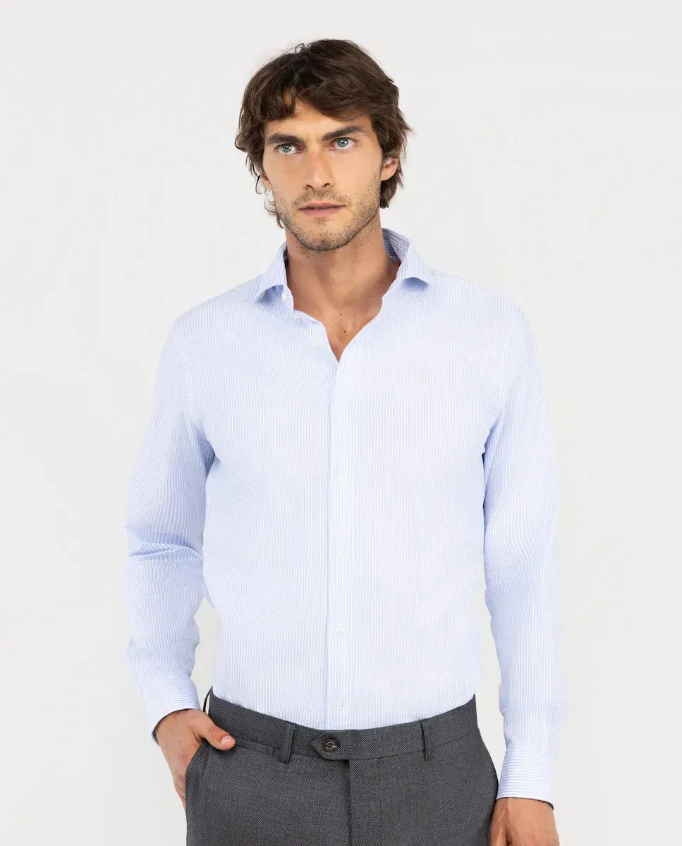 Мужская рубашка в полоску, выполненная из 100% хлопка. Узкий крой (slim fit), отложной воротник с косточками и застежка на пуговицы. Длинные рукава с манжетами на две пуговицы и логотип на груди.