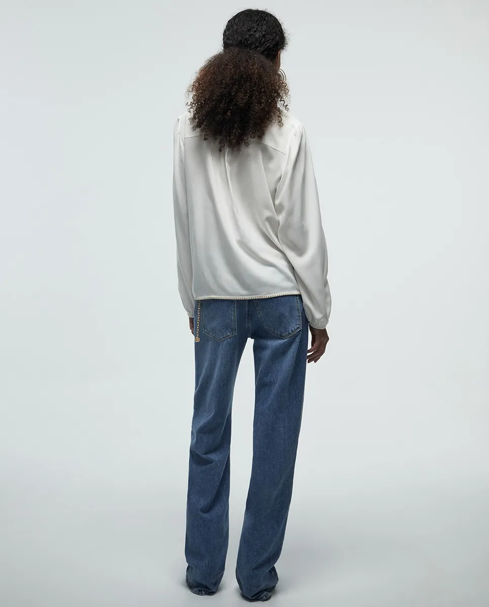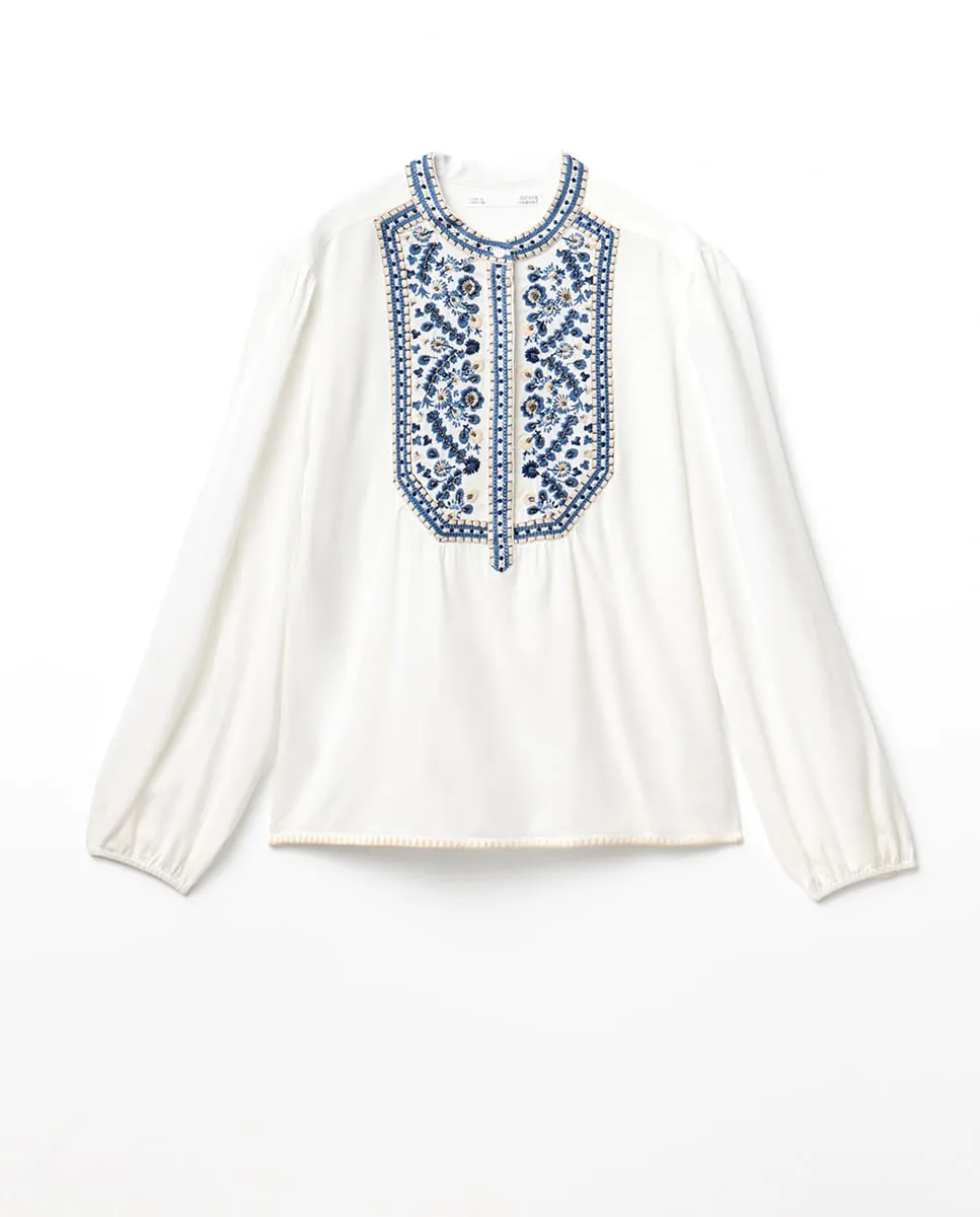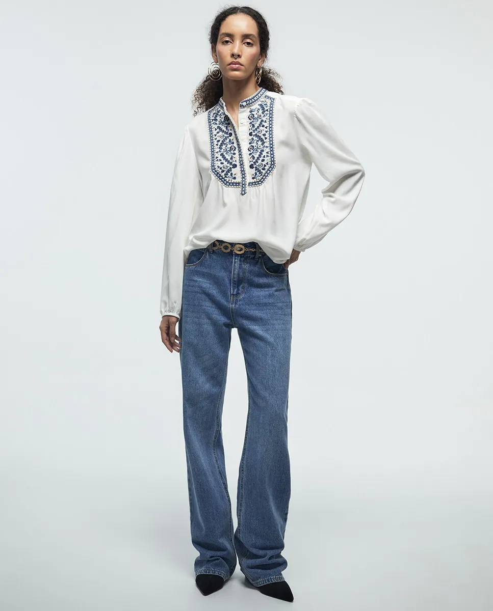 Блузка с этнической вышивкой, длинными рукавами и воротником-стойкой на пуговицах
