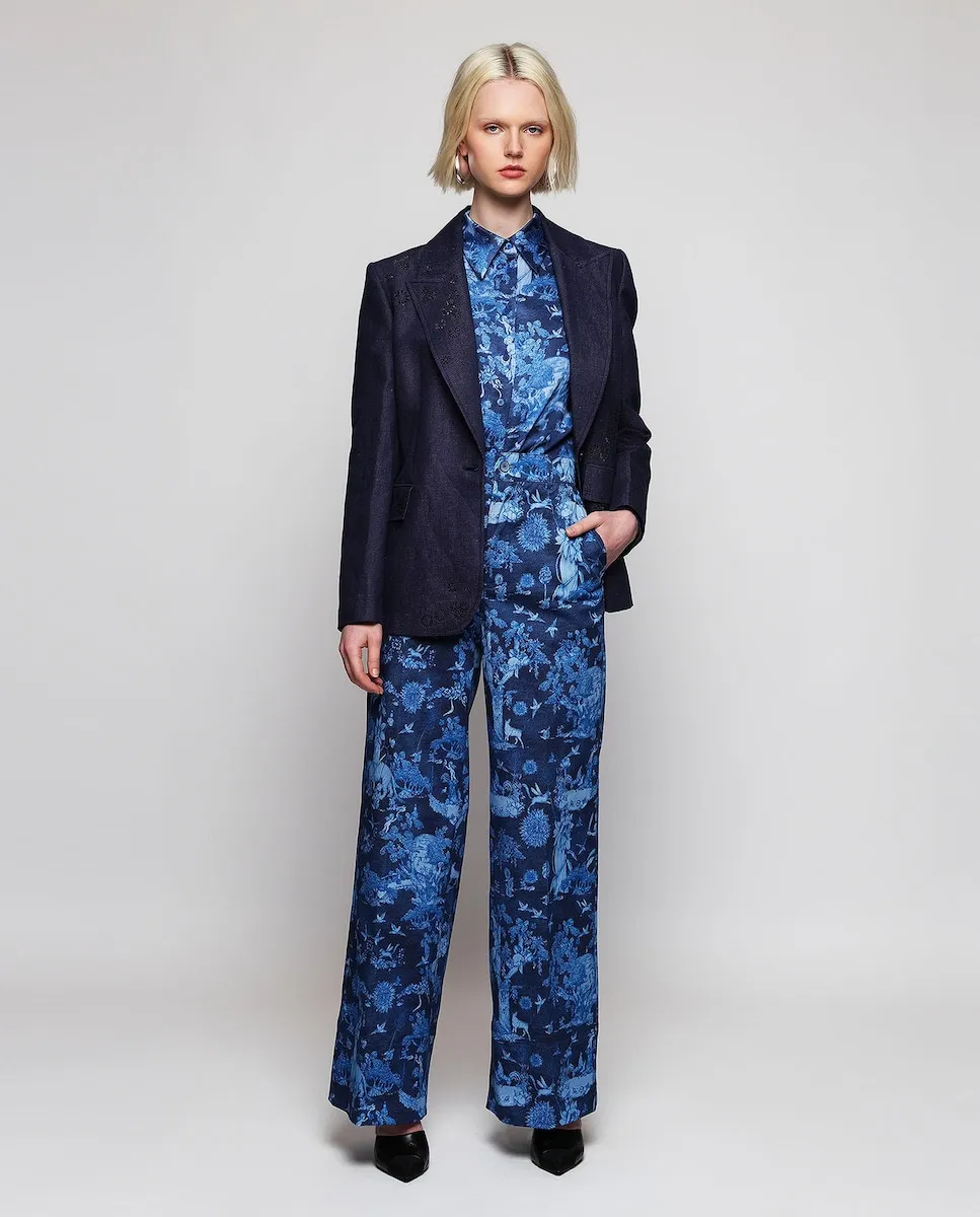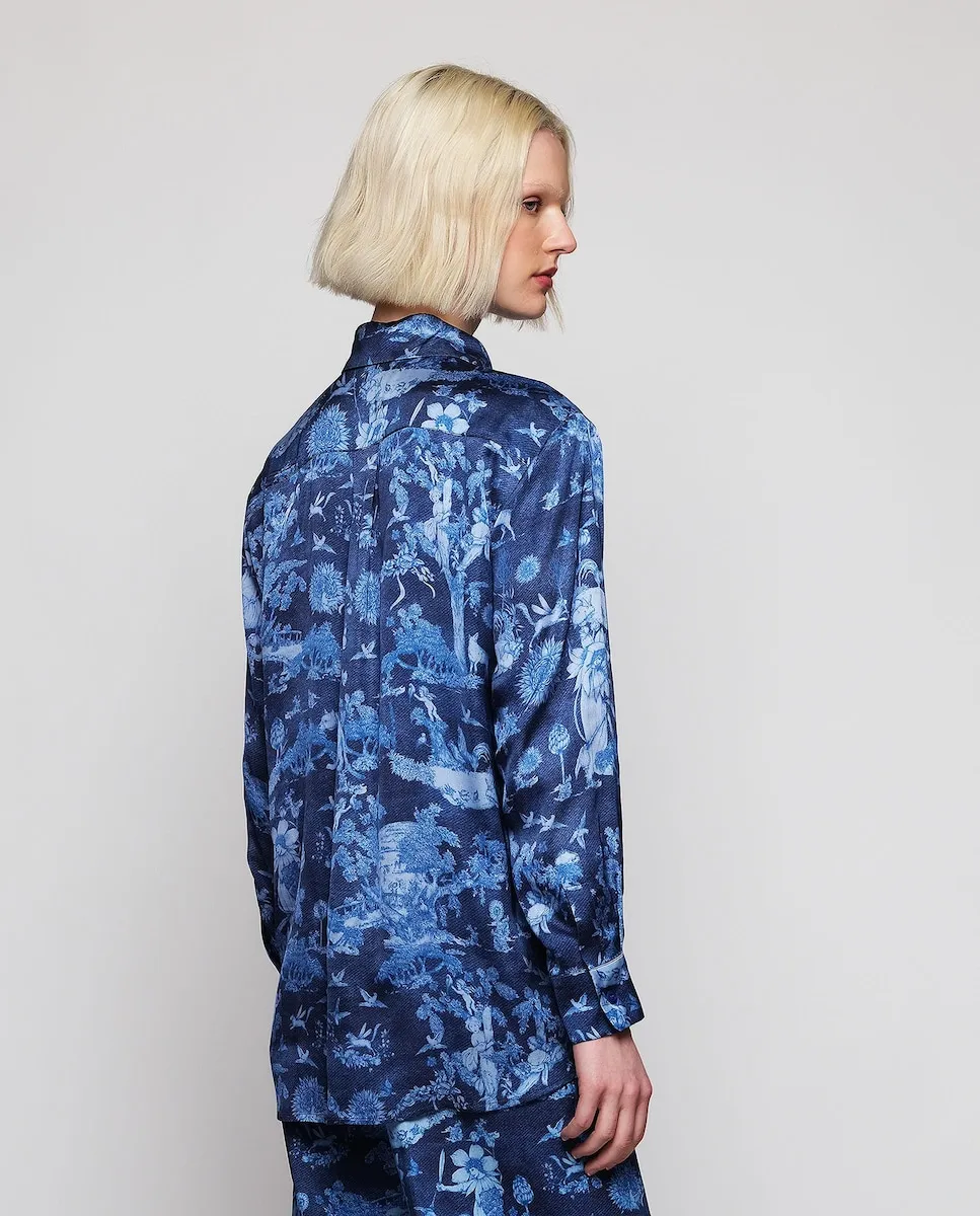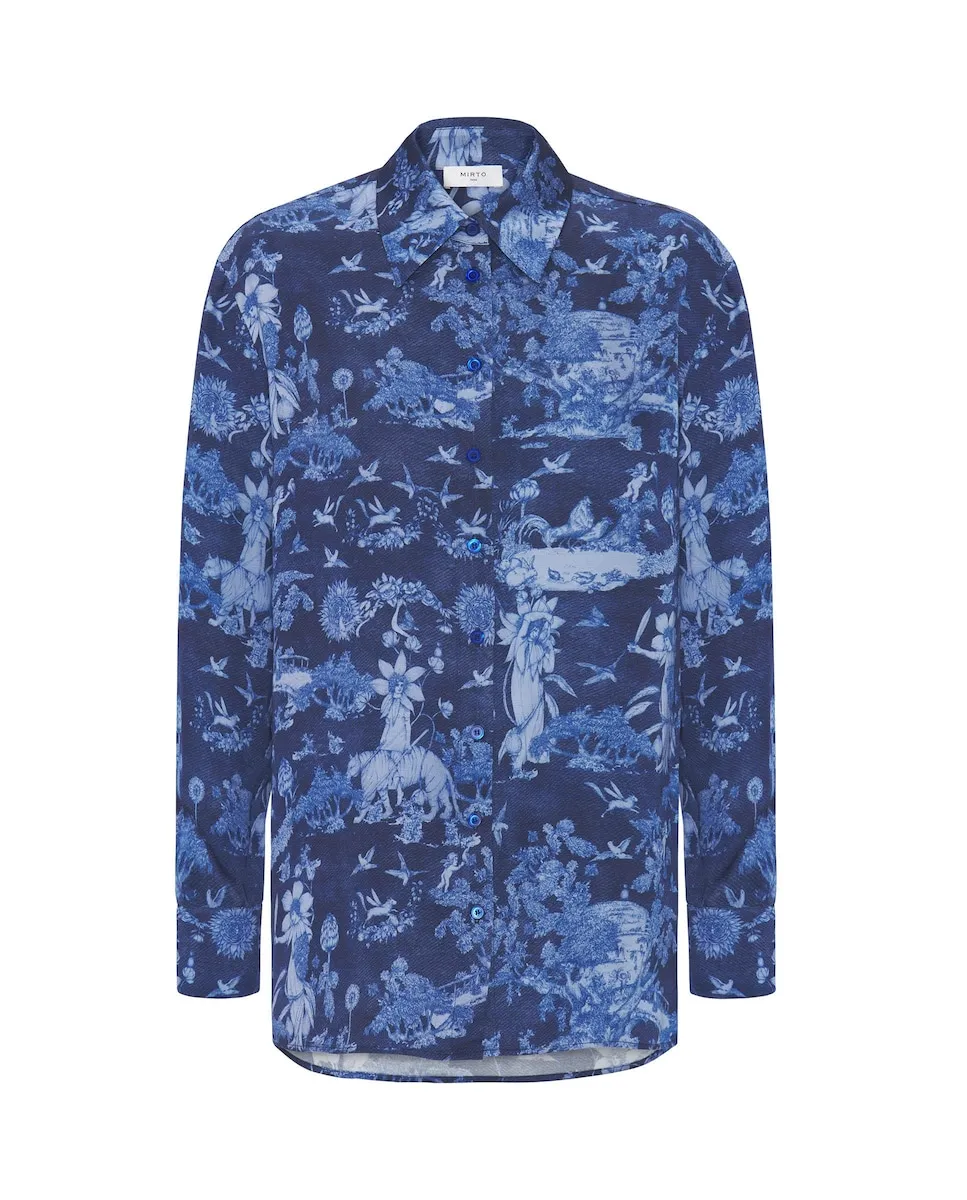 Свободная блузка с узором toile de jouy, эксклюзивно разработанная MIRTO в сотрудничестве с ботанической акварелисткой Сена Сифуэнтес. Воротник-рубашка, центральная застежка на пуговицы, длинный рукав с манжетой. Прямой крой.